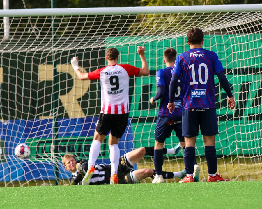 Viktor Andri hélt þarna að hann væri búinn að tvöfalda markafjöldann sinn í sumar þegar hann skoraði eftir fyrirgjöf en hann var rangstæður.