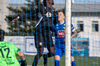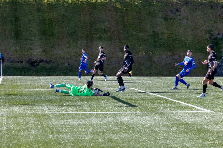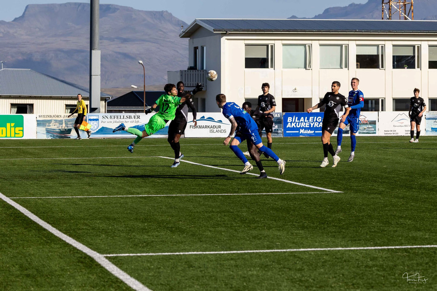 Aukaspyrna hjá gestunum á miðjum velli. Emir stökk manna hæst og flikkaði boltanum yfir Stefán liðsfélaga sinn í markinu en sláin bjargaði Emir frá fallegu sjálfsmarki