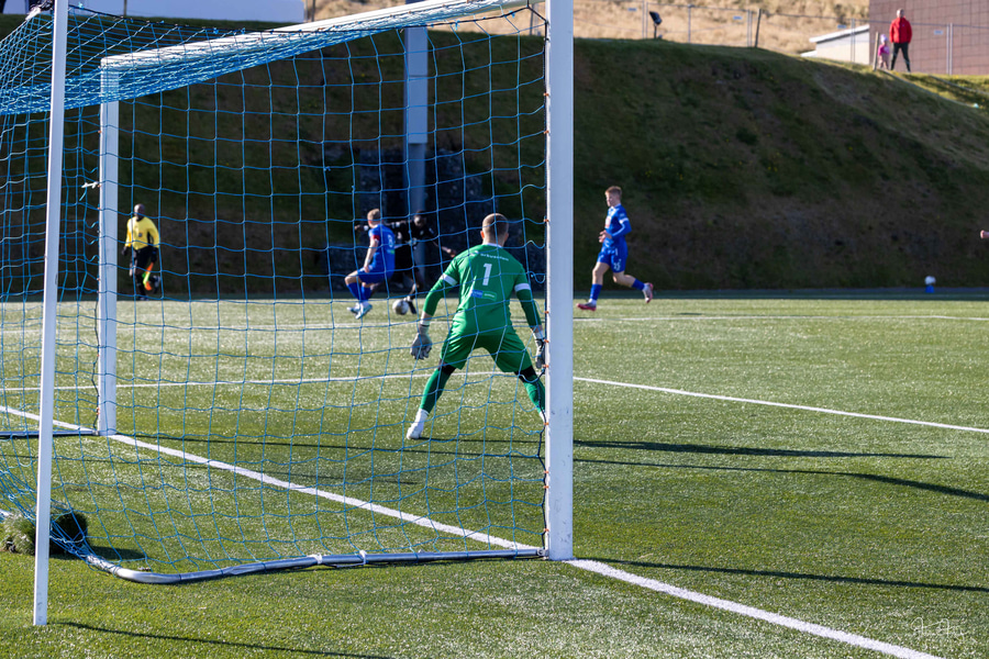 Sá ekki hver átti skotið en góð gestanna endar með föstu skoti í innanverða stöngina
