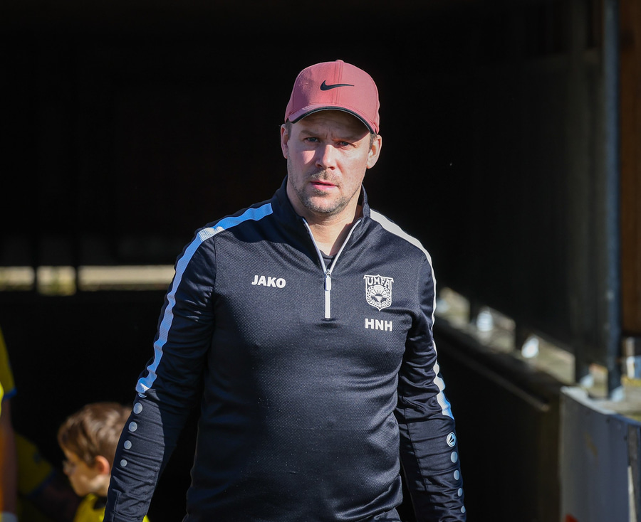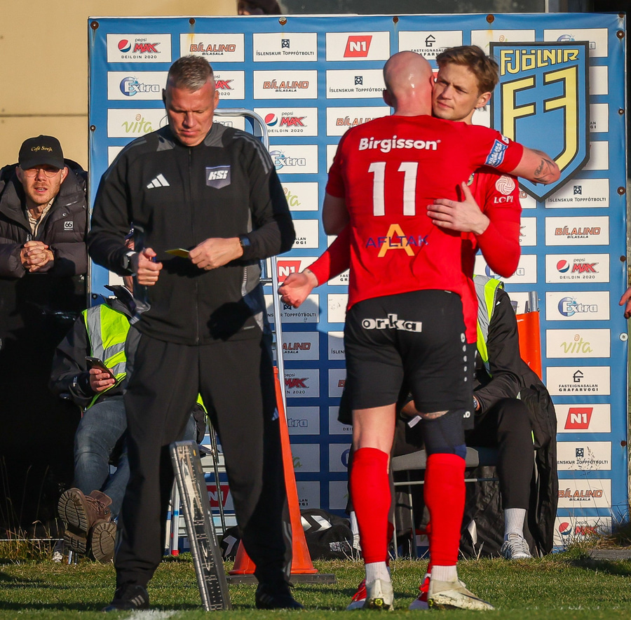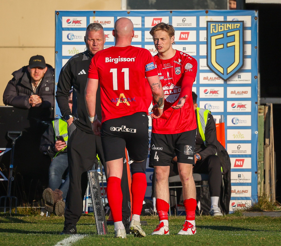 Jón Þór Hauksson þjálfari ÍA er á leiknum en Skagamenn hafa verið sterklega orðaðir við Júlíus Mar varnarmann Fjölnis.