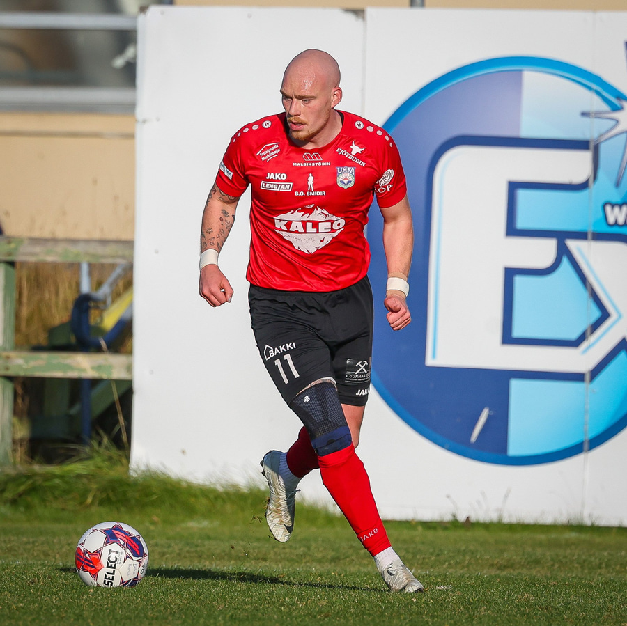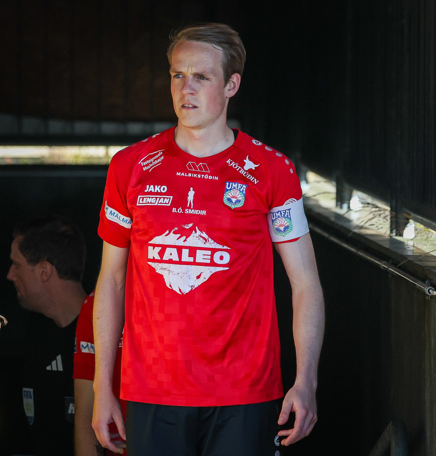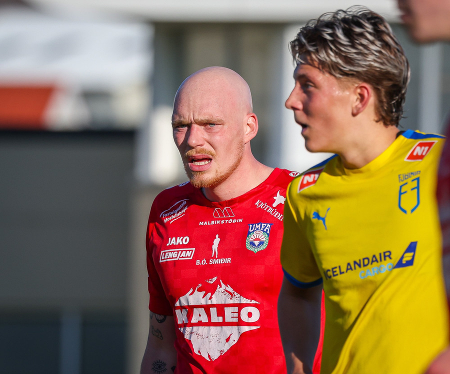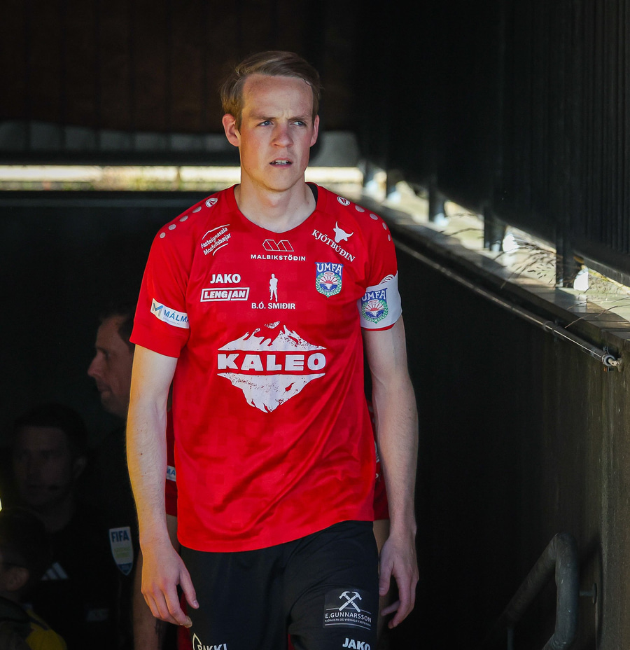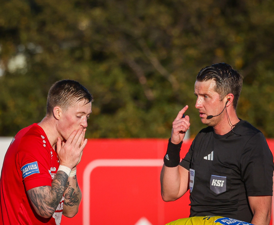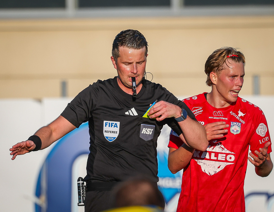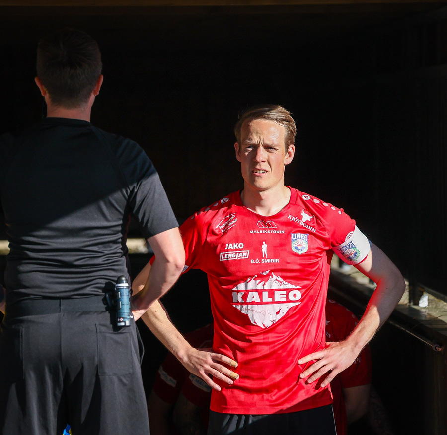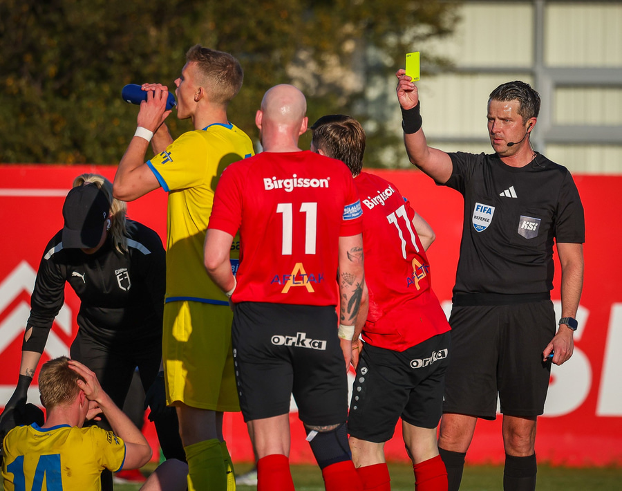 Með því að fá rauða spjaldið fer hann hinsvegar í bann í seinni leiknum hér í dag gegn Fjölni en verður löglegur í mögulegum úrslitaleik.
