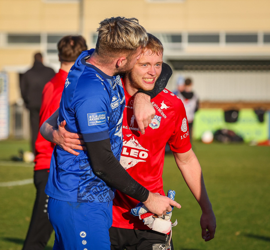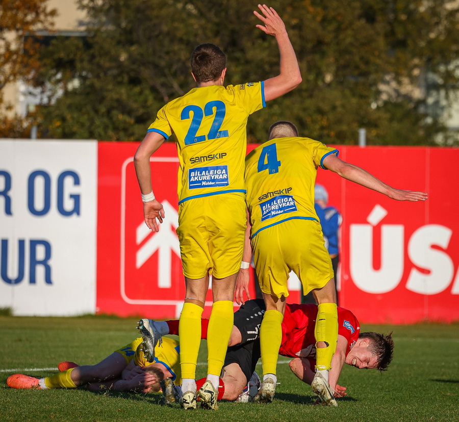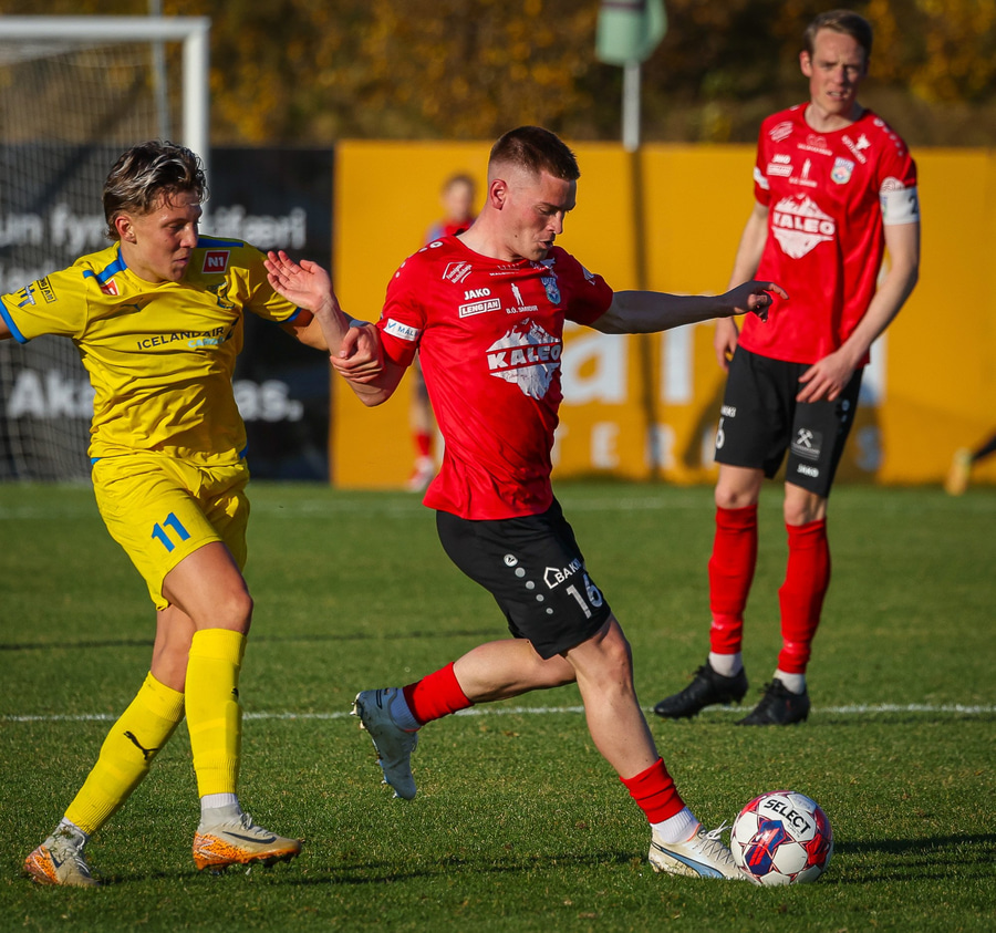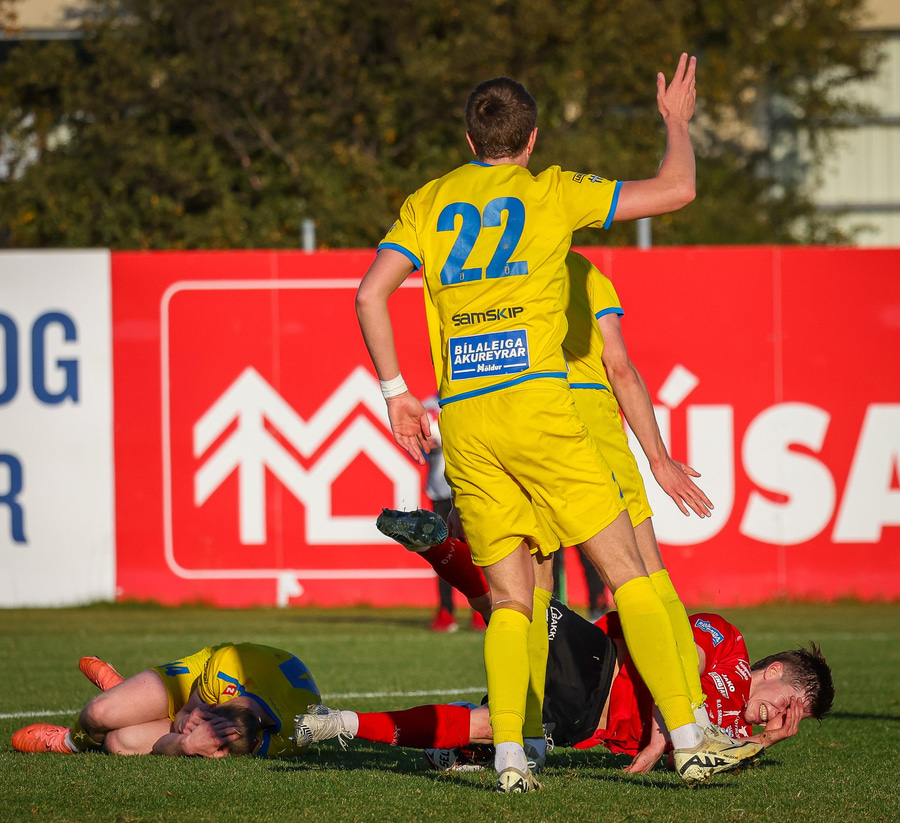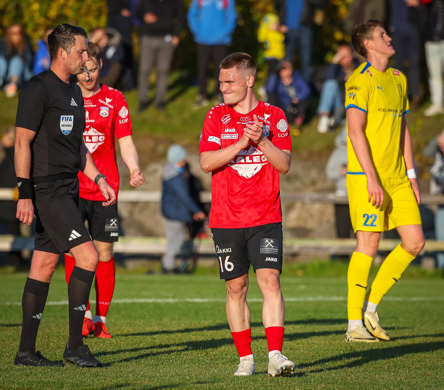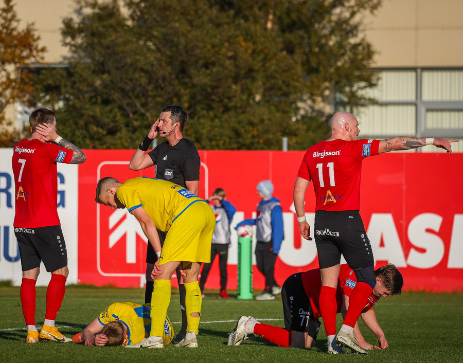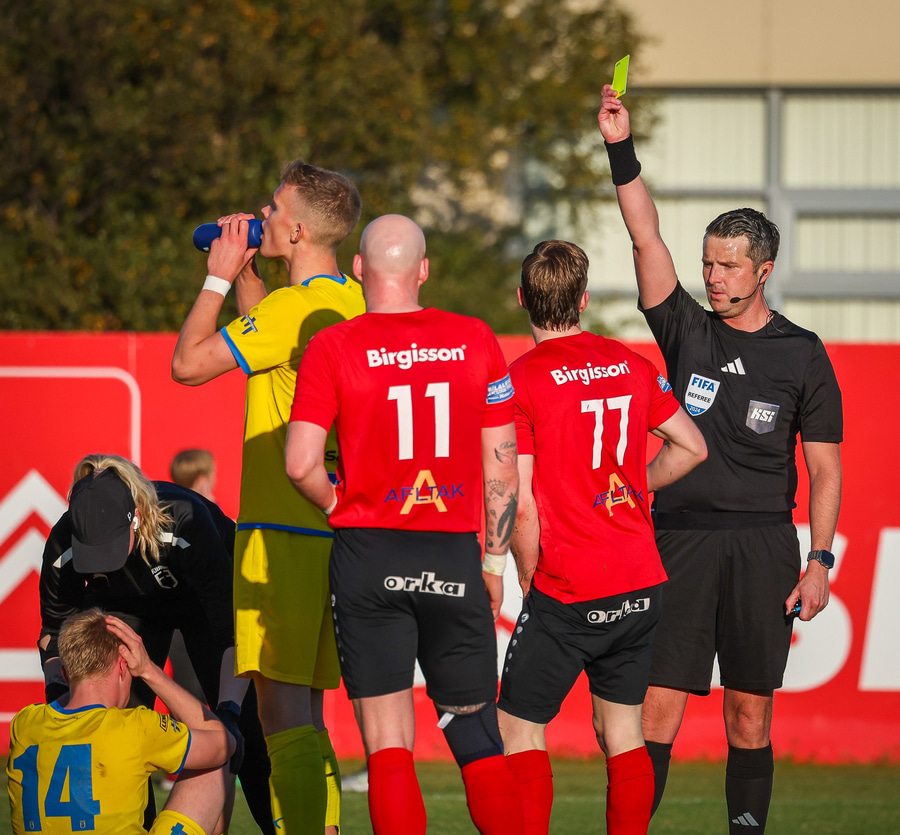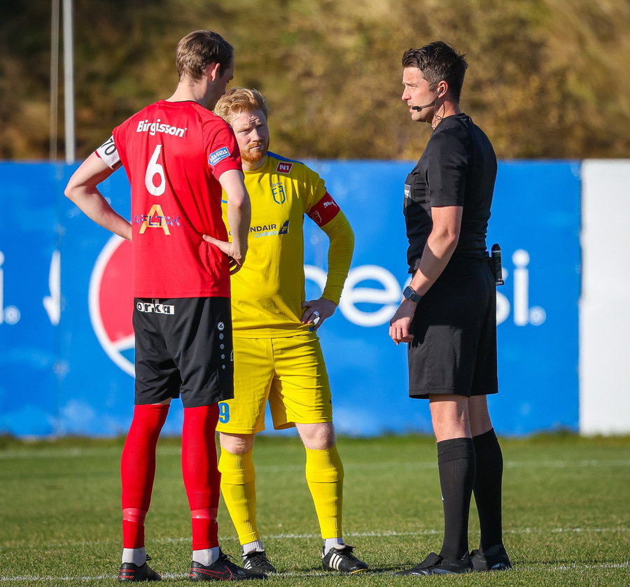 Bjarni Hafstein brýtur á Bjarti Bjarma, Villi Alvar flautar. Boltinn berst á Dag Austmann sem neglir boltanum í liggjandi Bjart eftir flautið.