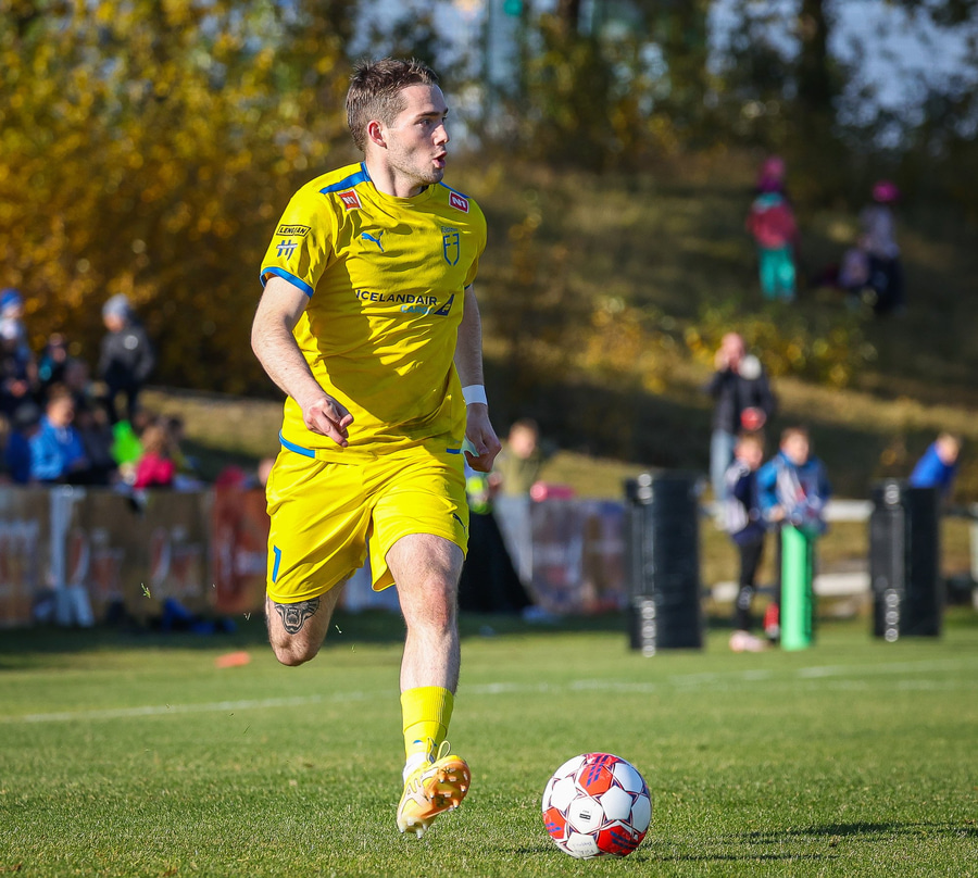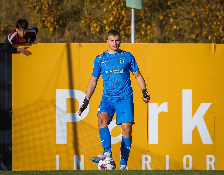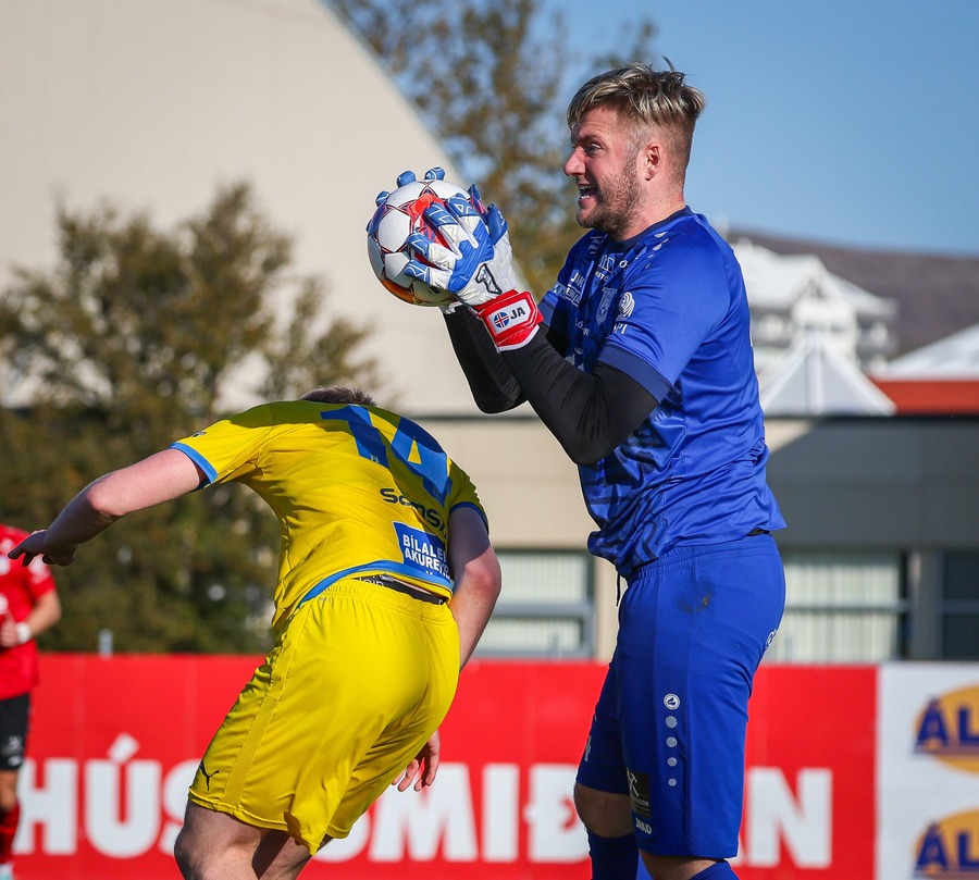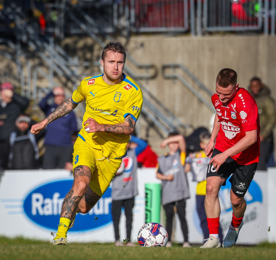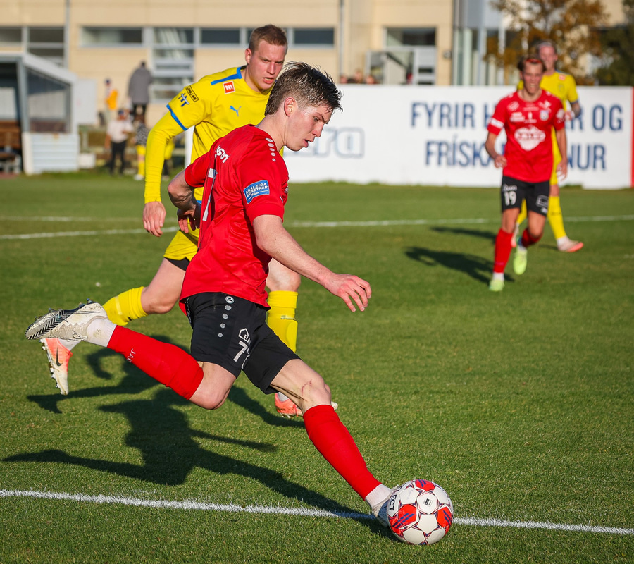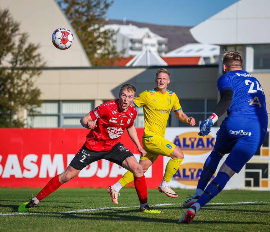 Sævar Atli með skot að marki sem fer í varnarmann en Vilhjálmur Alvar dæmir markspyrnu.
