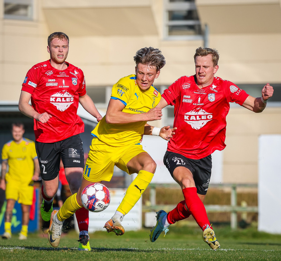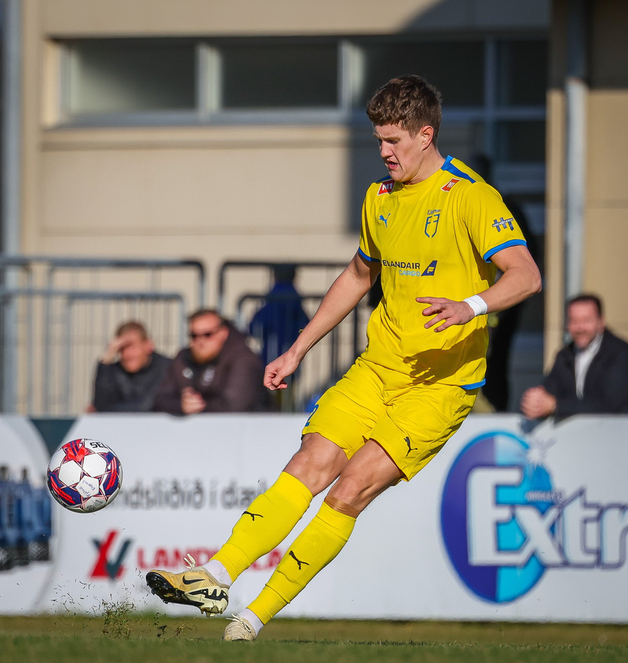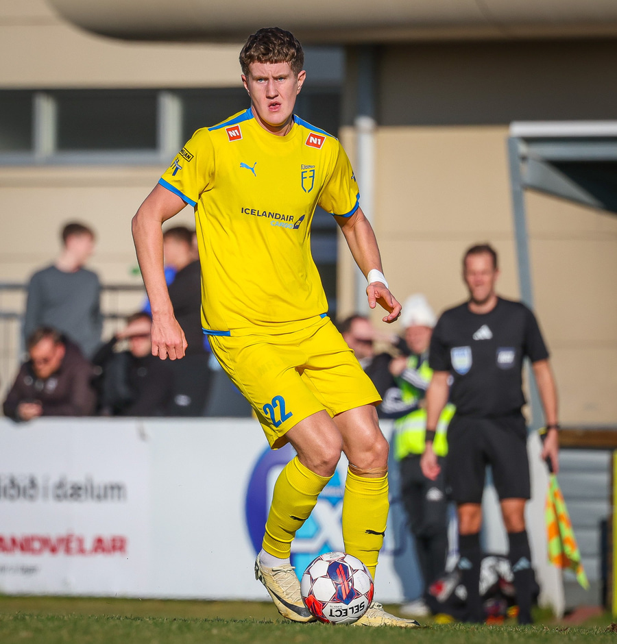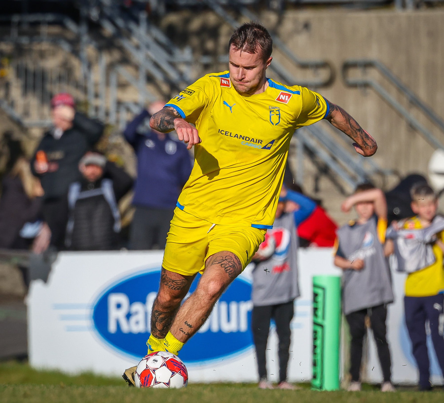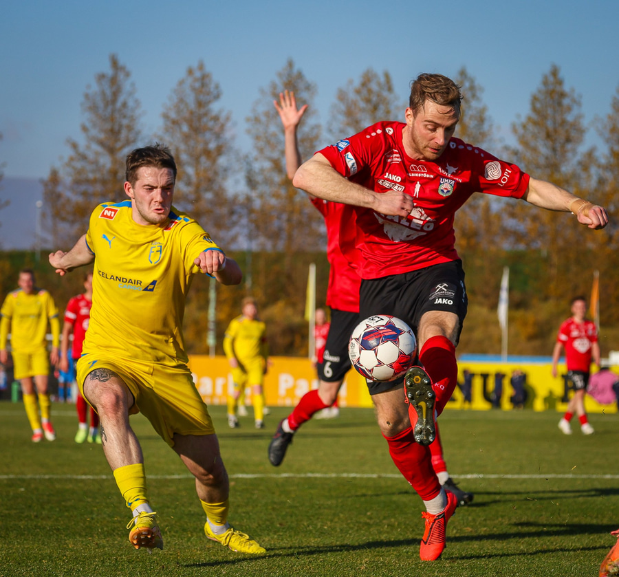 Sævar Atli með skot að marki sem fer í varnarmann en Vilhjálmur Alvar dæmir markspyrnu.