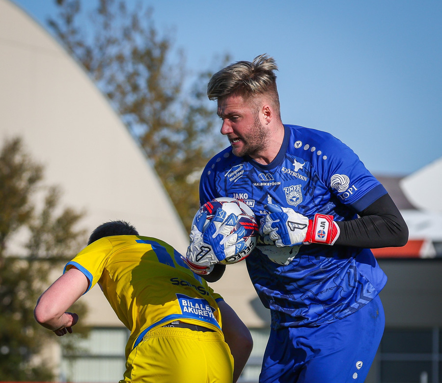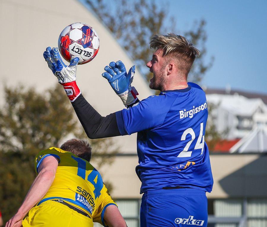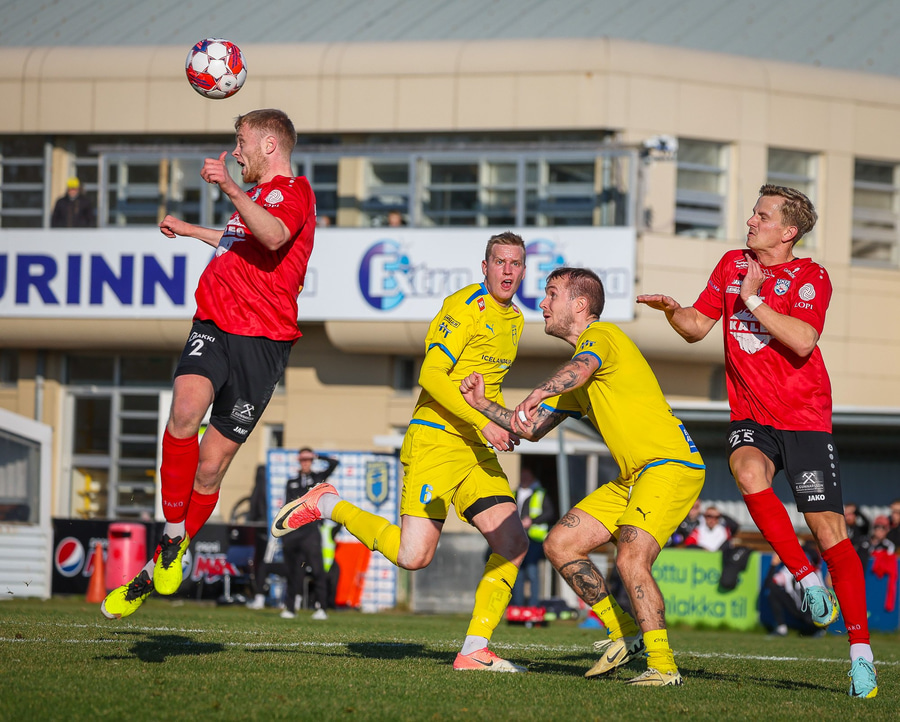 Baldvin Þór með hættulega fyrirgjöf sem Jökull kýlir frá.