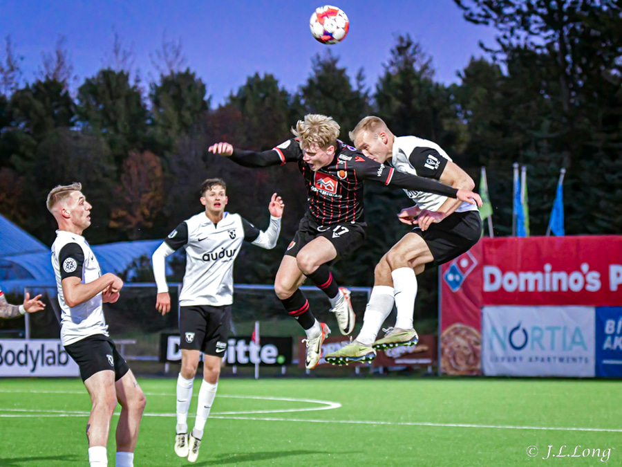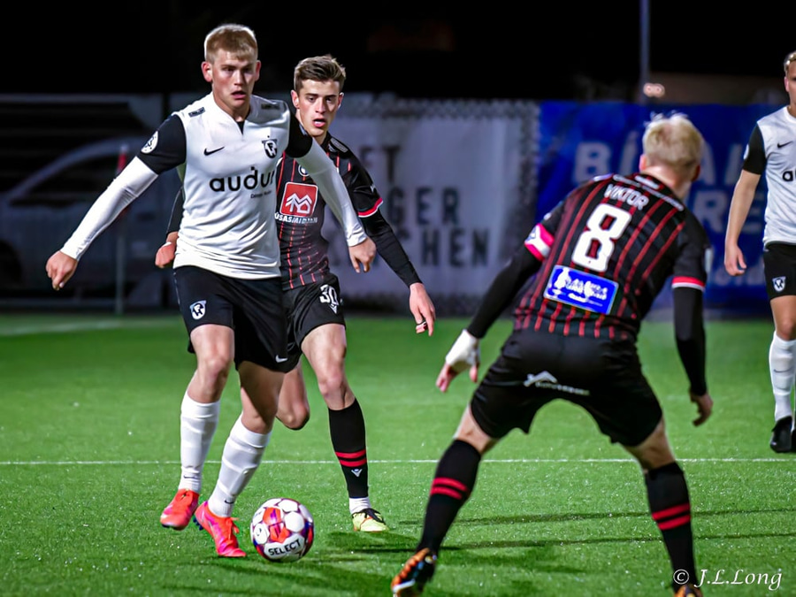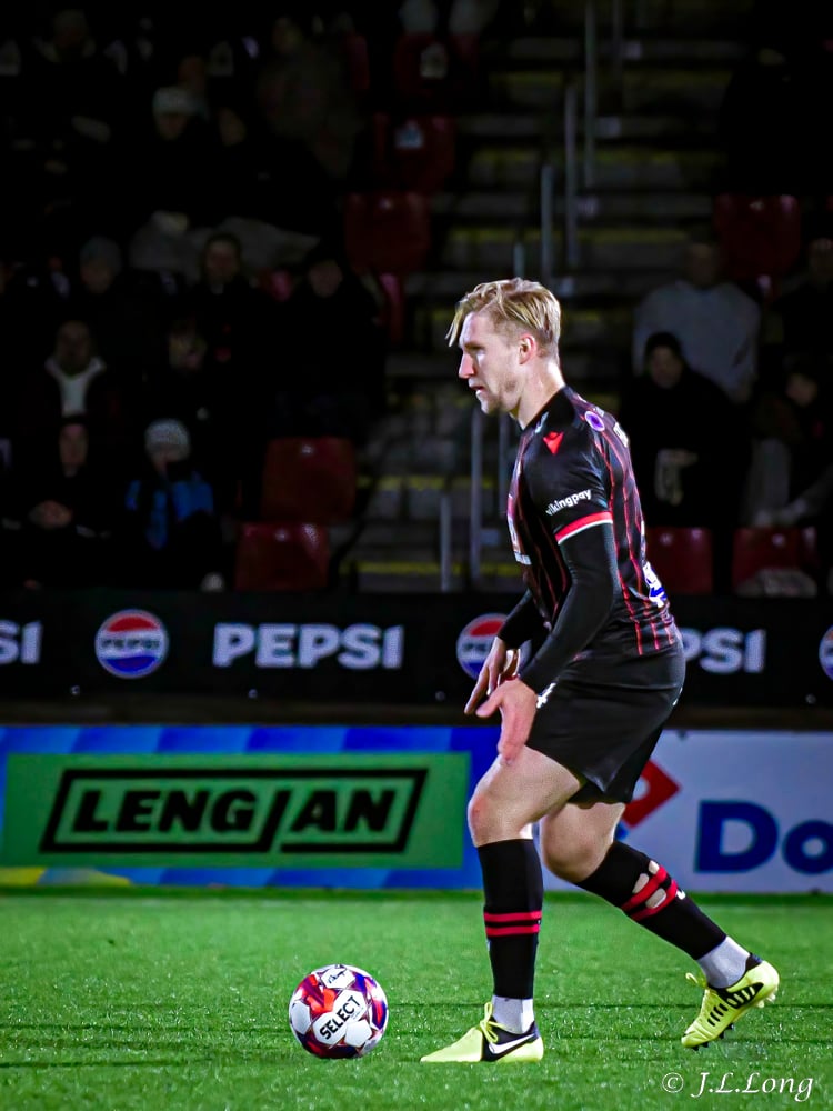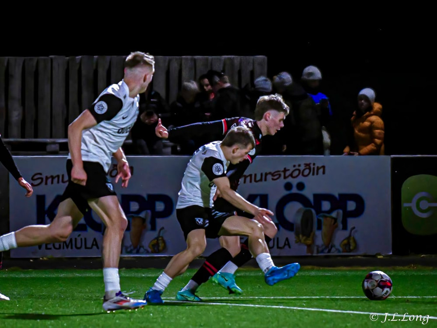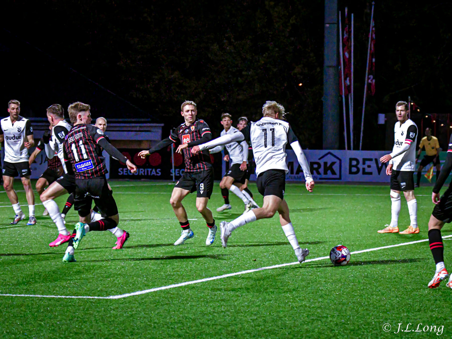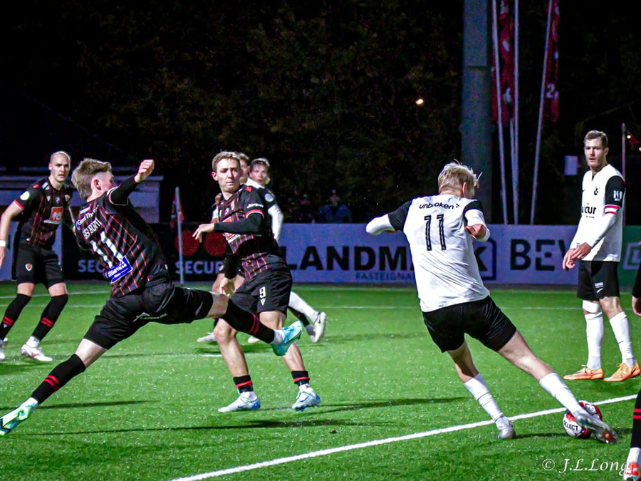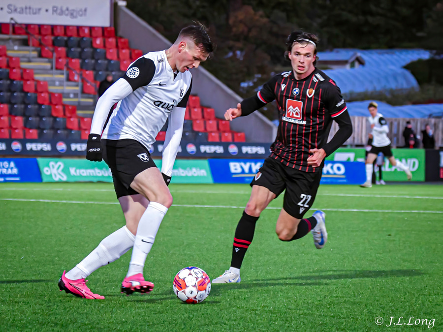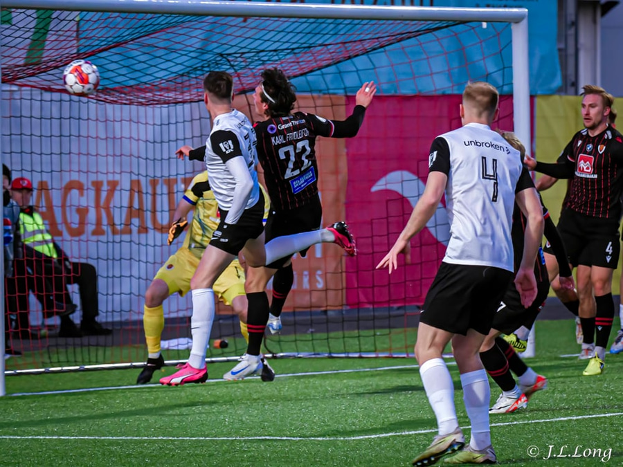 Davíð Atla kemur boltanum á Karl Friðleif sem er alveg út við endalínu. Karl kemur boltanum yfir allan pakkann og á fjærstöngina þar sem Helgi Guðjóns er mættur og skallar boltann í netið.