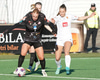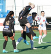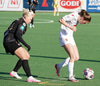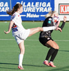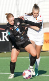 Karen María nálægt því að komast í boltann inn í teig Víkings en Birta er huguð og hirðir þennan lausa bolta.
