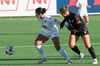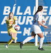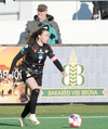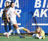 Bergdís með skot sem Harpa ver vel með fætinum. Bergdís hefur skemmt áhorfendum í dag, með skemmtilega takta, hreyfingar og snúninga sem gaman er að sjá.