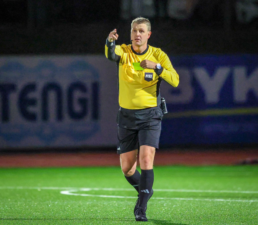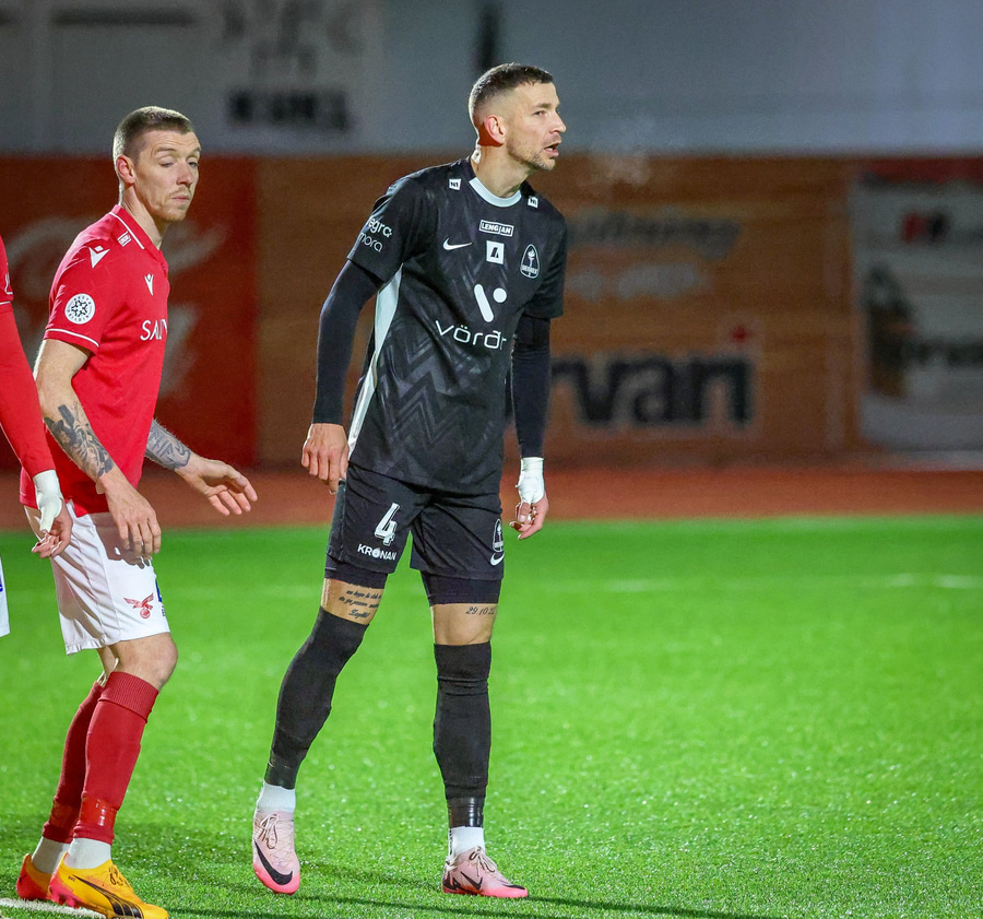 Brýtur á Davíð Ingvars og fær réttilega gult spjald.