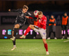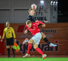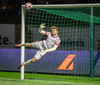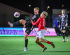Breiðablik fær horn, Benjamin Stokke rís manna hæst og nær skalla á markið en Frederik Schram handsamar boltann auðveldlega.
