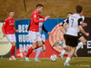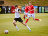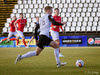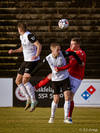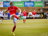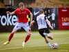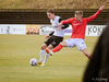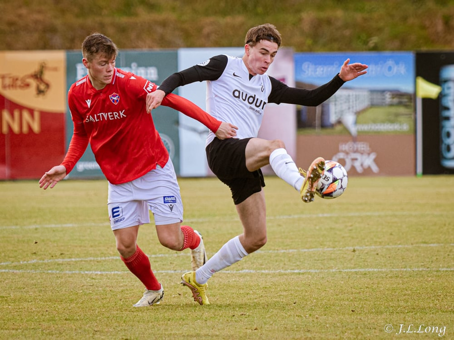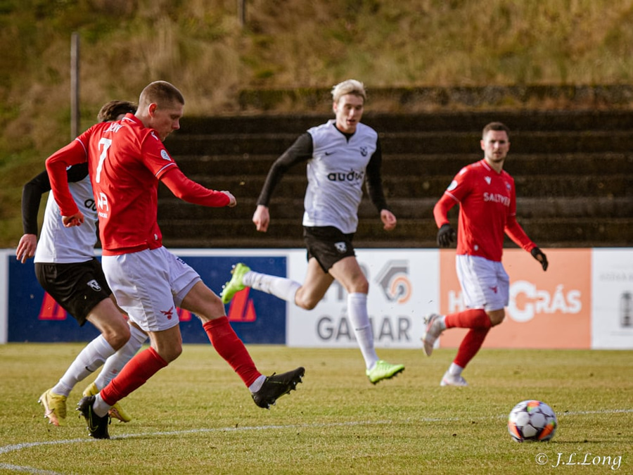 Valsmenn grimmir og Kristinn Freyr tekur boltann af Grétari Snær og keyrir í átt að marki. Finnur Gylfa Þór vinstra meginn við sig en skotið hans blokkað af varnarmanni.