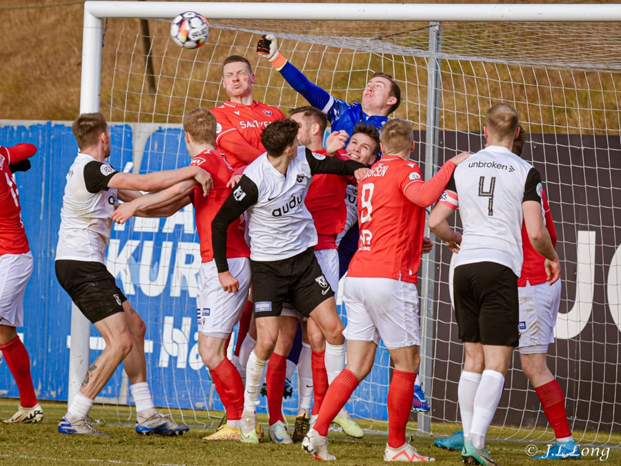 Valur að sækja hratt upp vinstri og Sindri Kristinn er mættur langt út úr markinu og Albin Skoglund sýnist mér það vera sem pikkar boltanum framhjá honum þó ekki fast og Ólafur Guðmunds er mættur niður á línu og bjargar þessu.
