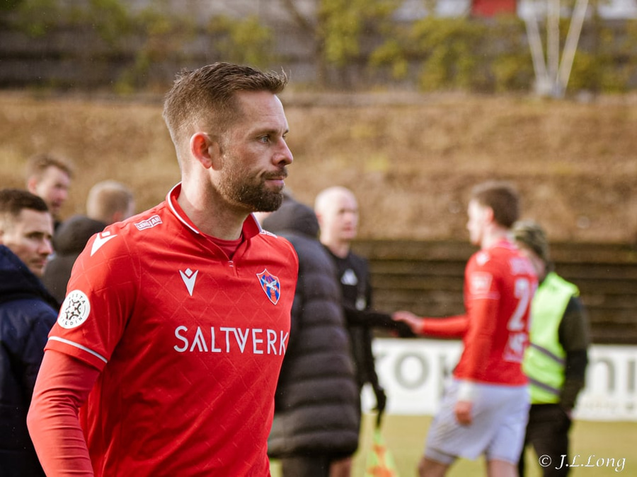 Gylfi tekur spyrnuna beint á markið og Sindri Kristinn ver þetta með fótunum!