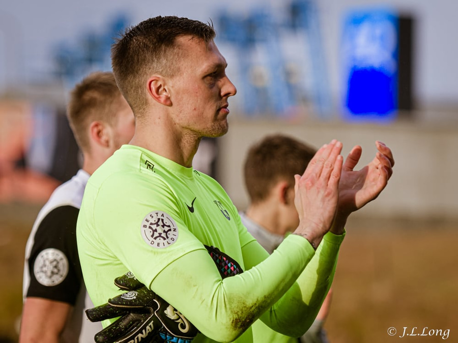 Opnaðist allt vinsta meginn fyrir Lúkas Loga og hann lætur vaða en Sindri Kristinn ver frá honum.