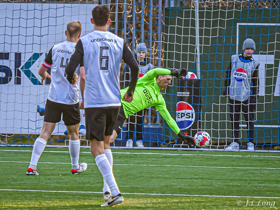 Sigurður Bjartur með þrumu skot beint á Árna í markinu sem blokkar skotið með hendurnar.