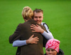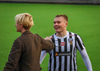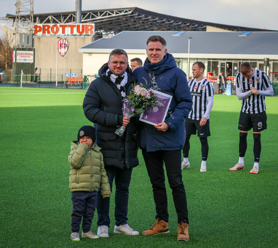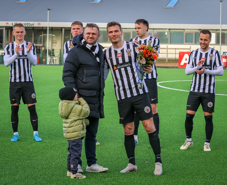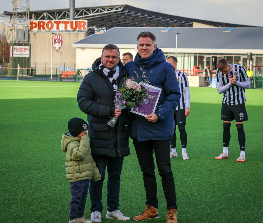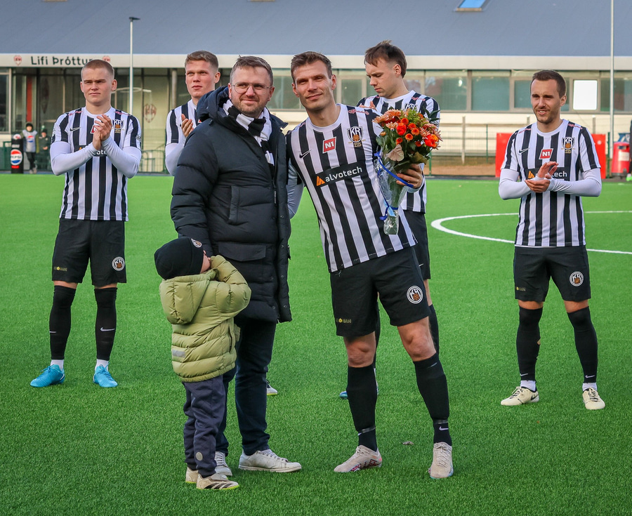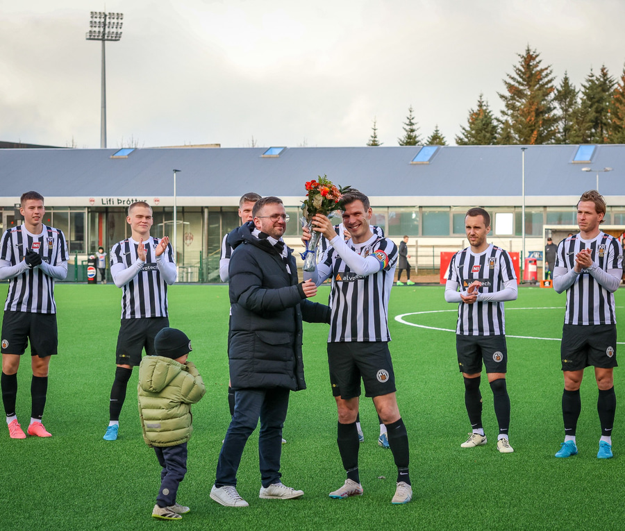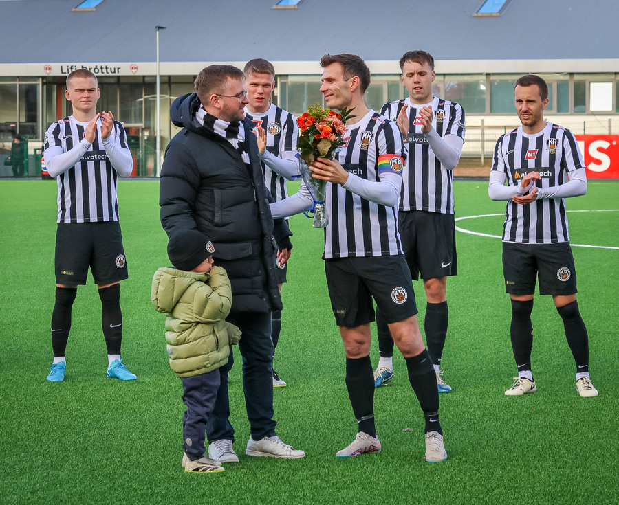 Theódór Elmar heiðraður og fær blómvönd en hann leggur skóna á hilluna eftir leikinn hér í dag.