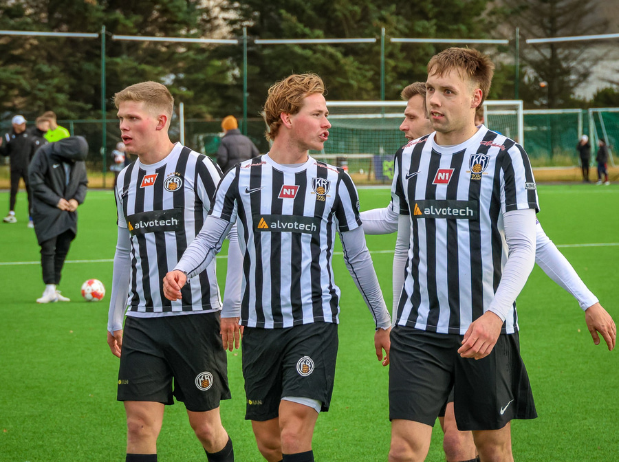 KR-ingar í góðri stöðu, boltinn kemur út í teiginn á Benóný en Jói Bjarna stelur skotinu af honum, kómískt.