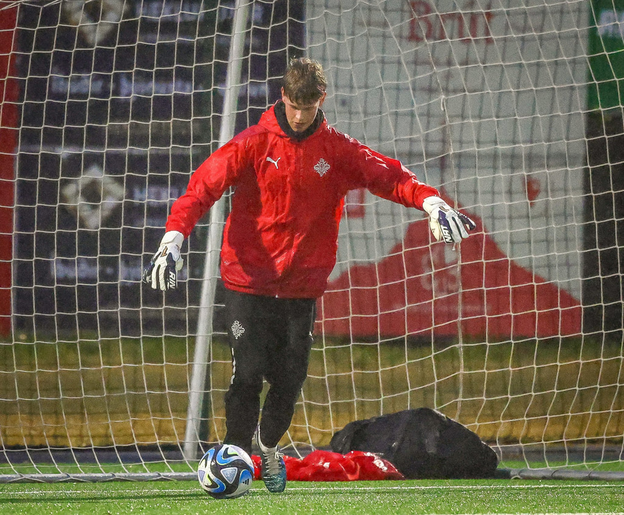 Sigurður Jökull búinn að eiga mjög öflugan leik í marki Íslands og hann heldur okkur inní þessu með góðri vörslu frá Alexis Ciria.