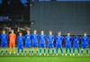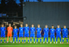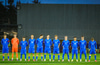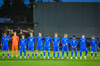 Spánverjarnir í gulum varatreyjum sínum í dag en íslenska liðið er blátt frá toppi til táar. Verið er að leika þjóðsöngvana.
