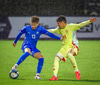 Björgvin Brimi með hættulega sendingu fram völlinn en aðeins of föst og markvörður Spánar kemur út og handsamar boltann.