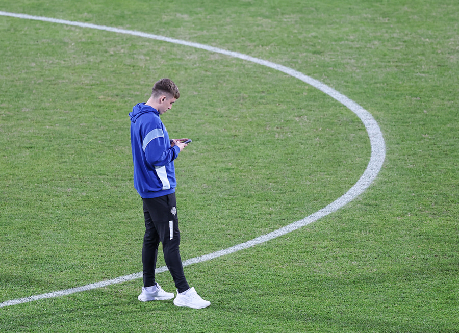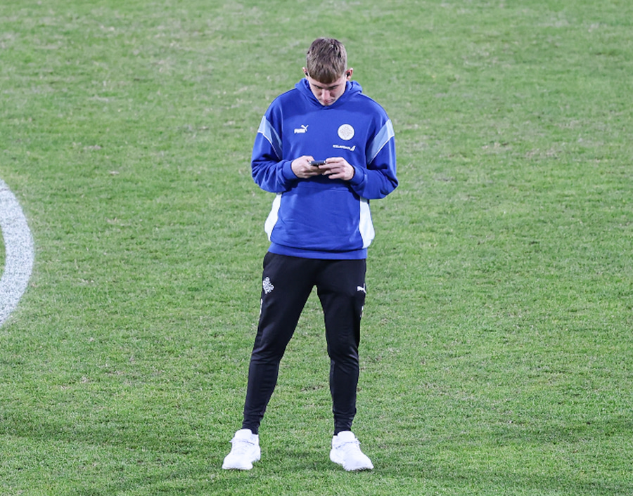 Ísak kemur inn af krafti og fer á fullu gasi í pressuna hátt á vellinum og vinnur boltann.