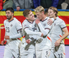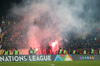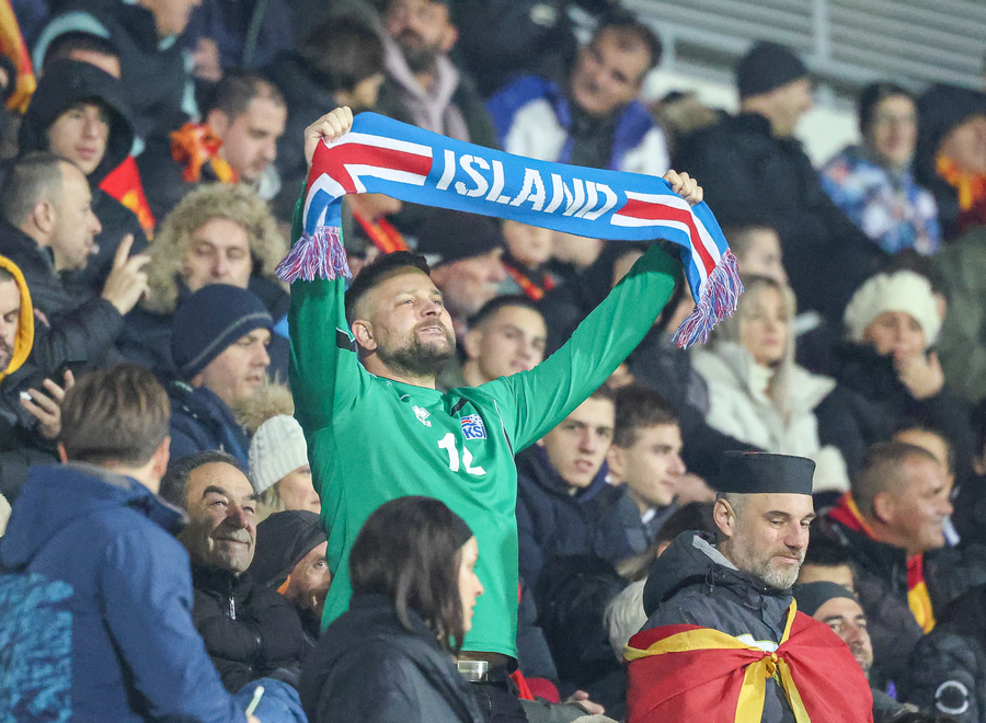 Hið stórkostlega Þjóðadeildarstef ómar. Næst á dagskrá eru þjóðsöngvarnir. Ó, guð vors lands! Ó, lands vors guð!