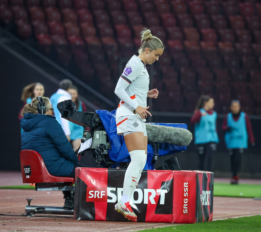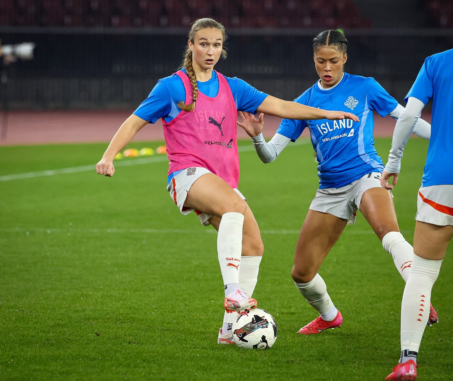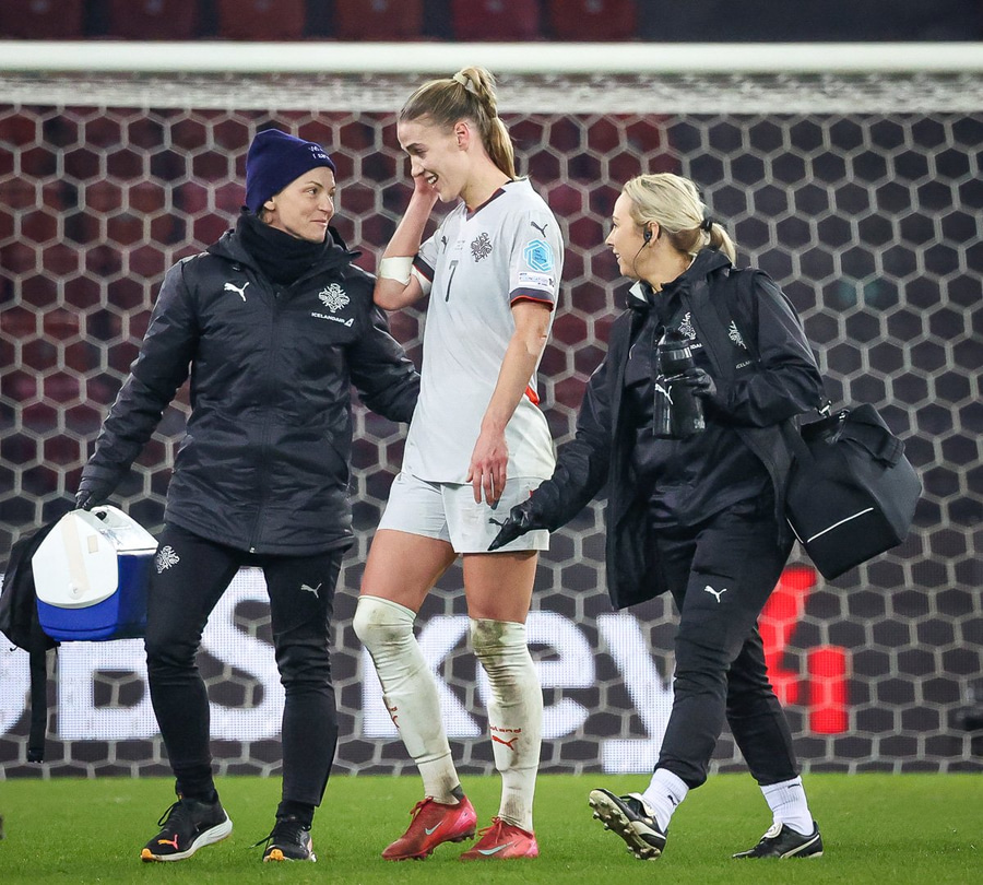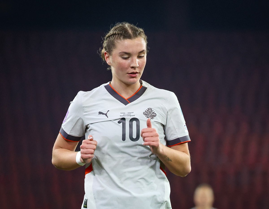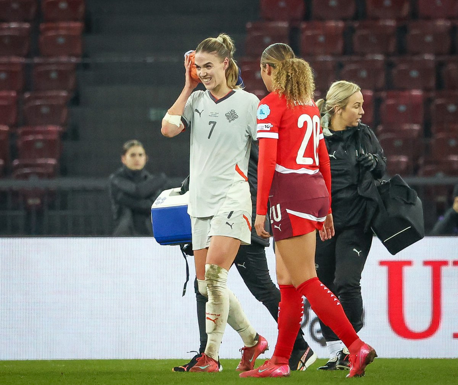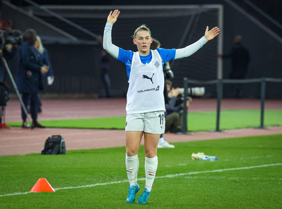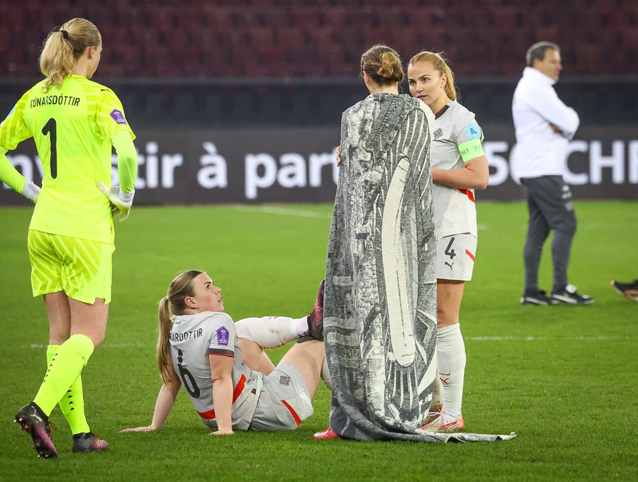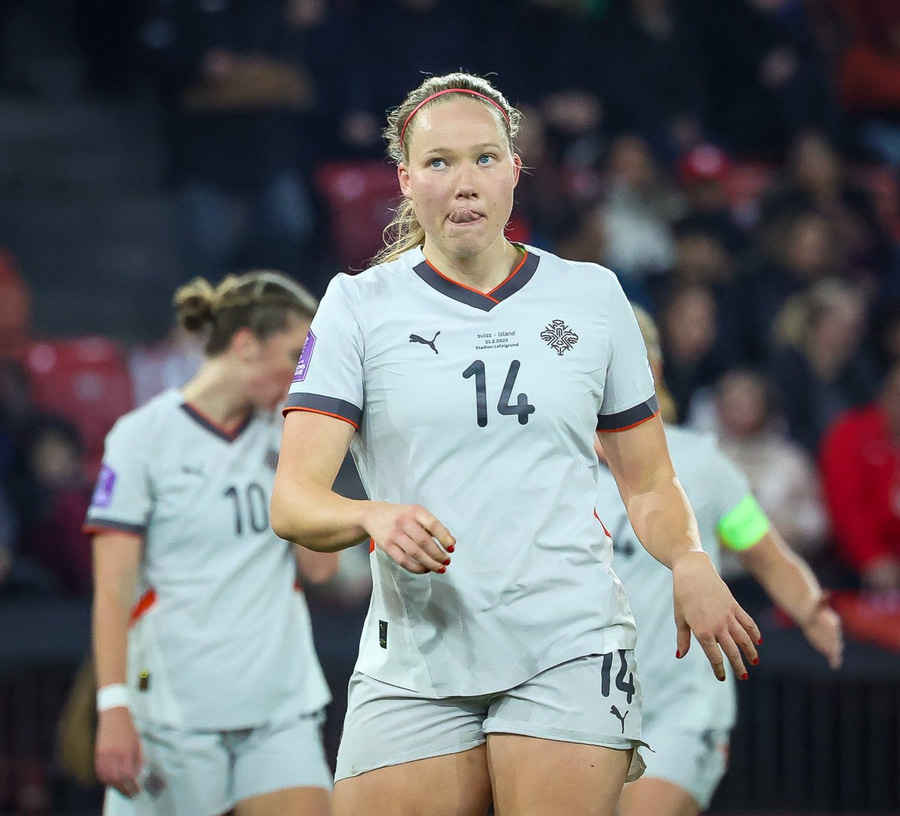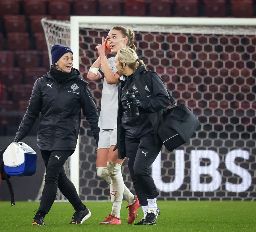 Sveindís Jane fær ekki að taka innkastið og þarf að bíða úti við hliðarlínu. Spes í ljósi þess að hún fékk enga aðhlýningu þegar hún og Luana Buehler skullu saman.