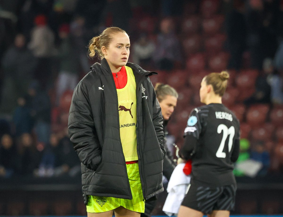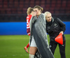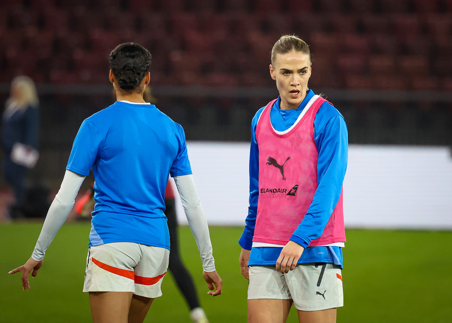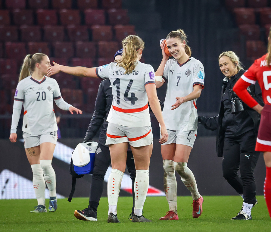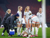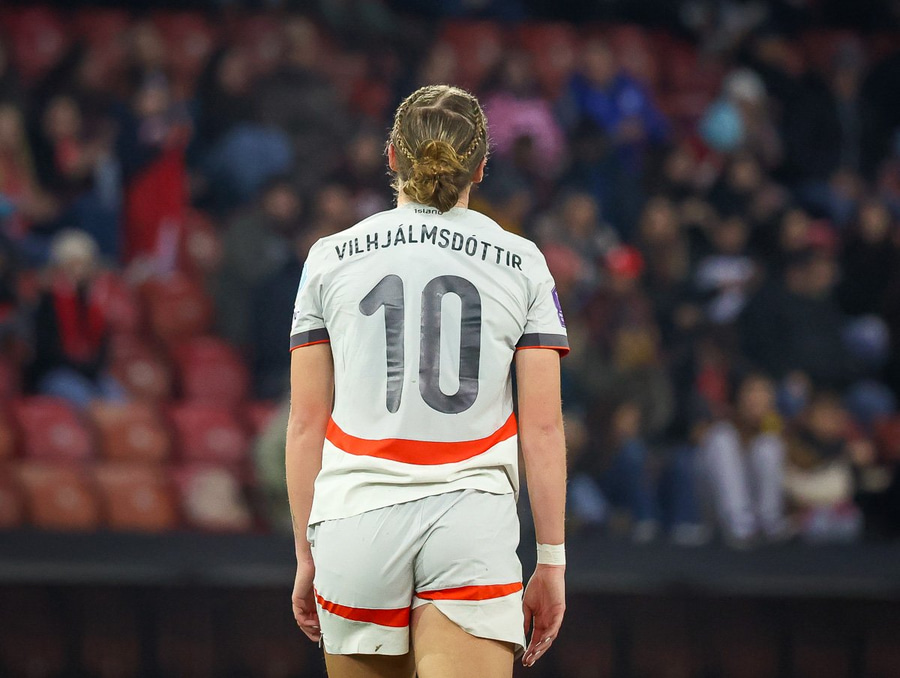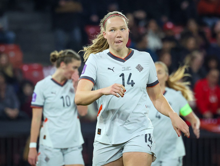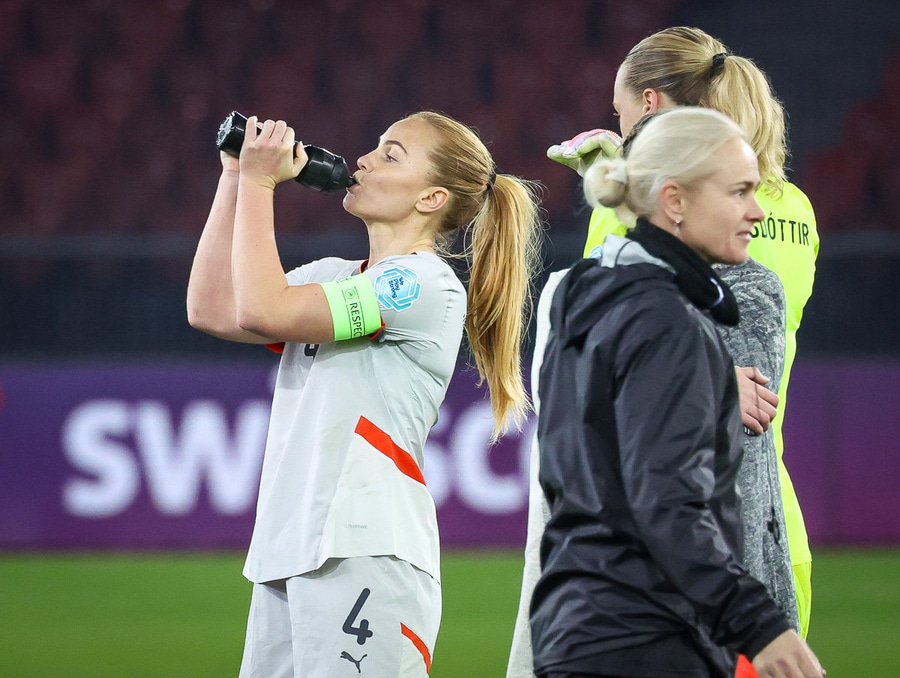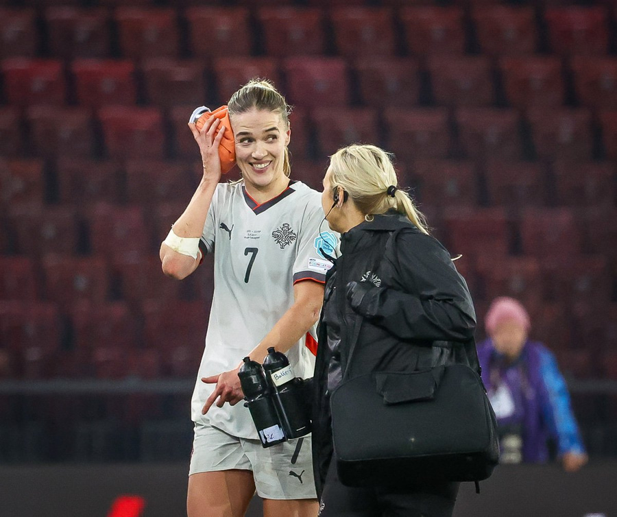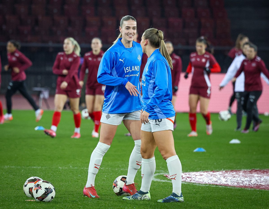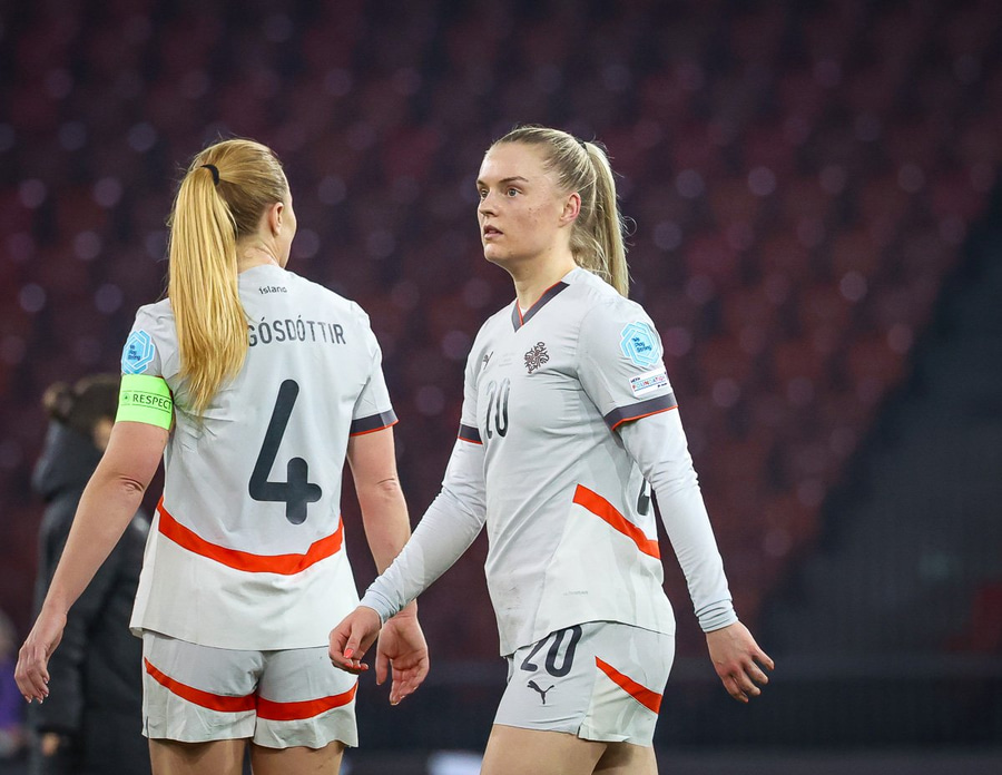 Sveindís Jane fær ekki að taka innkastið og þarf að bíða úti við hliðarlínu. Spes í ljósi þess að hún fékk enga aðhlýningu þegar hún og Luana Buehler skullu saman.