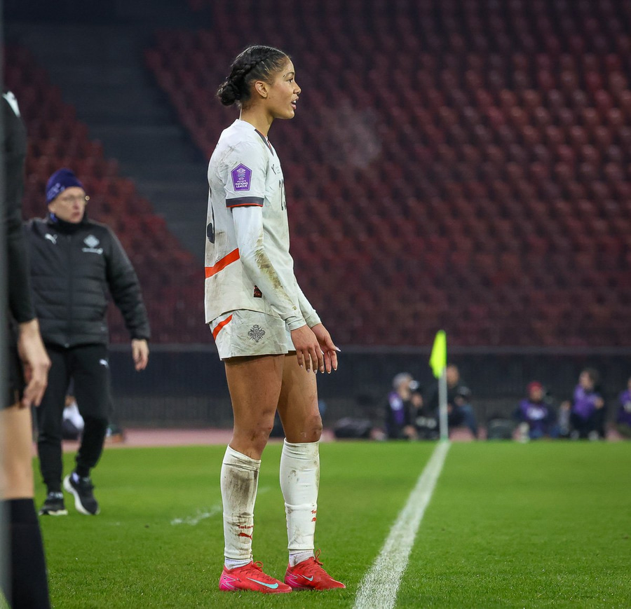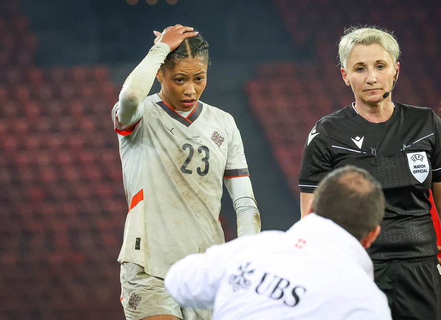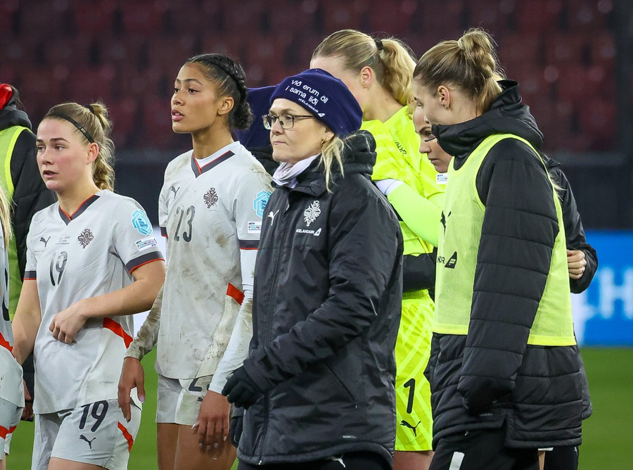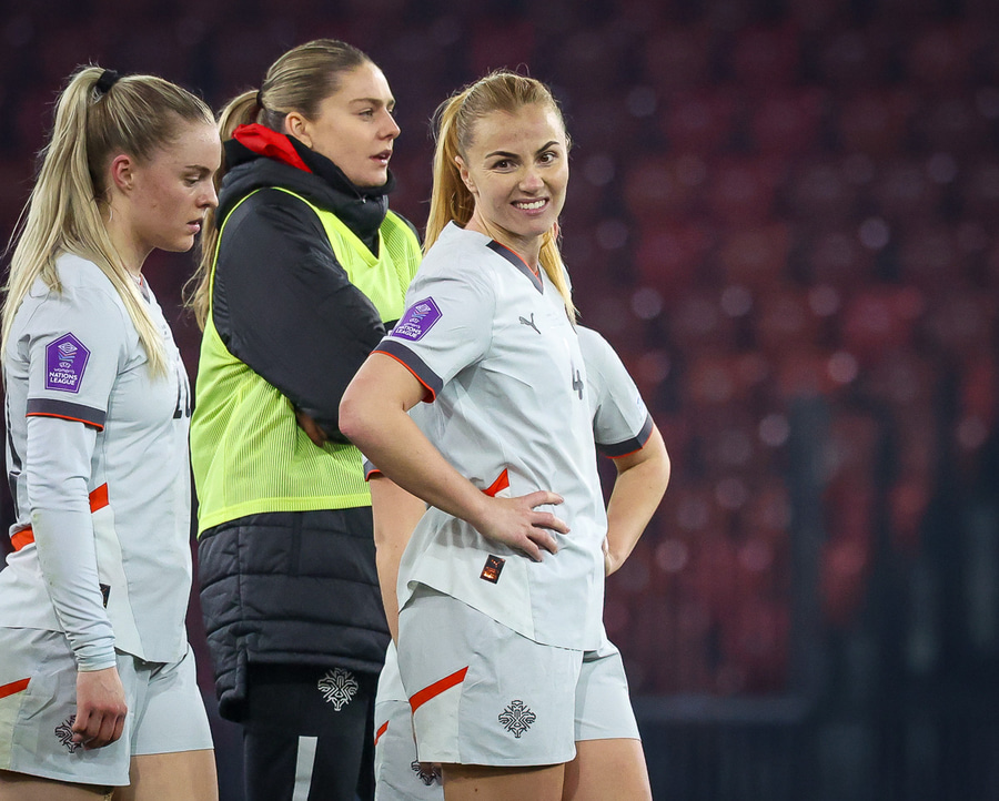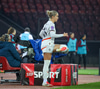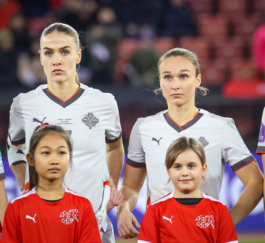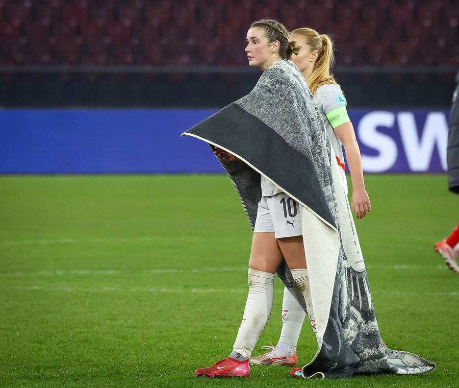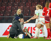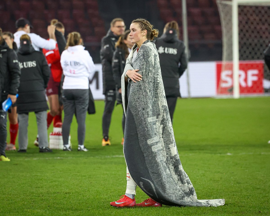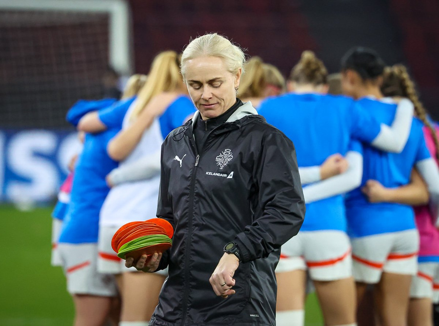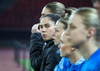 Sveindís Jane fær ekki að taka innkastið og þarf að bíða úti við hliðarlínu. Spes í ljósi þess að hún fékk enga aðhlýningu þegar hún og Luana Buehler skullu saman.