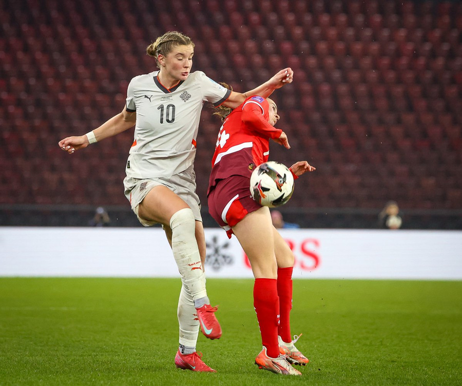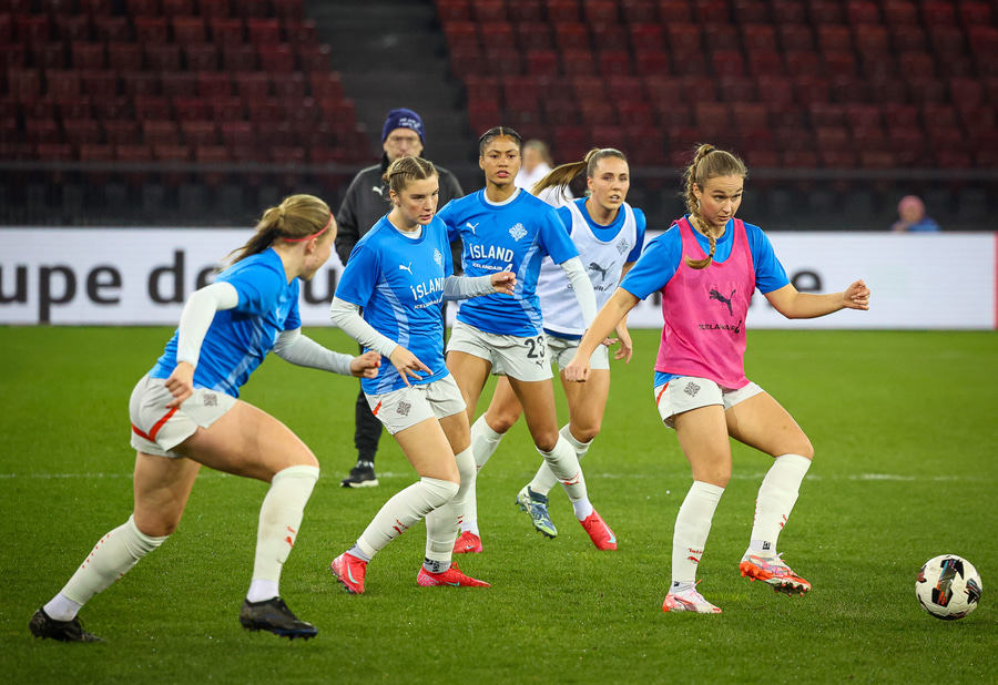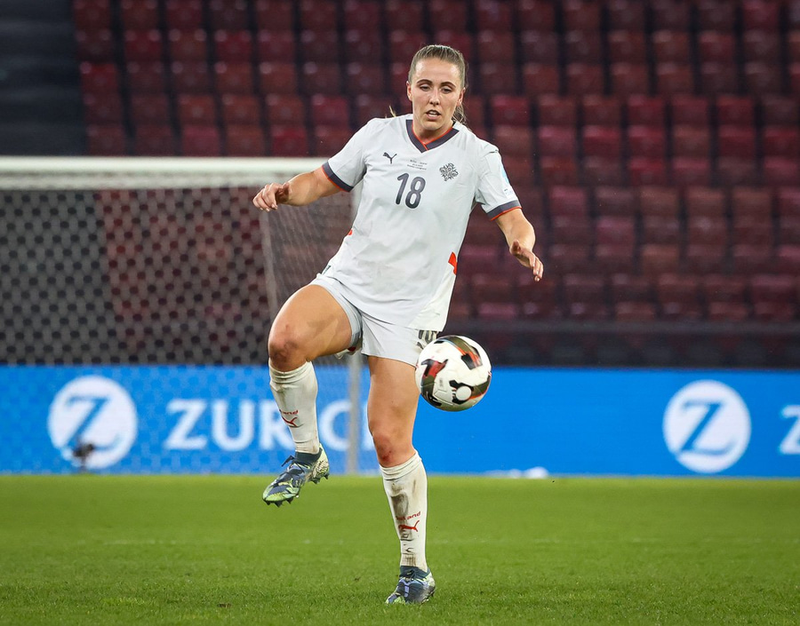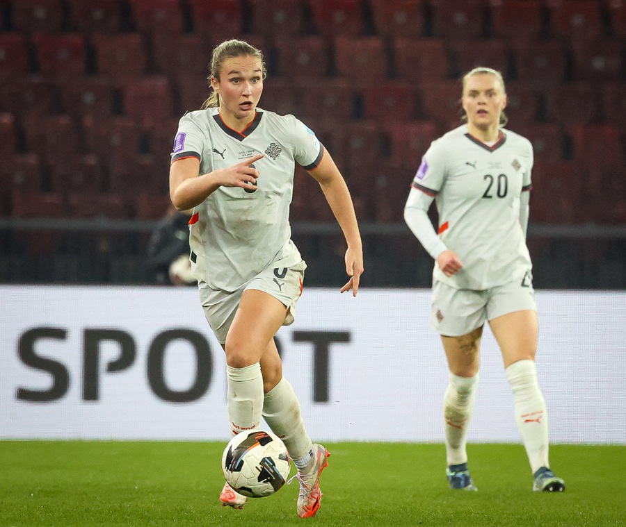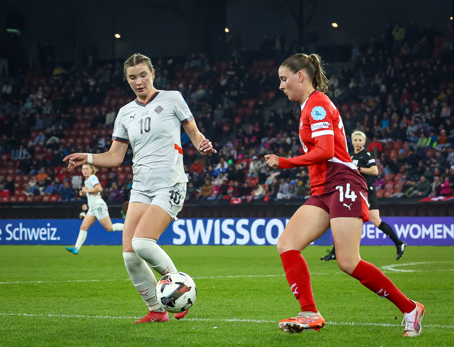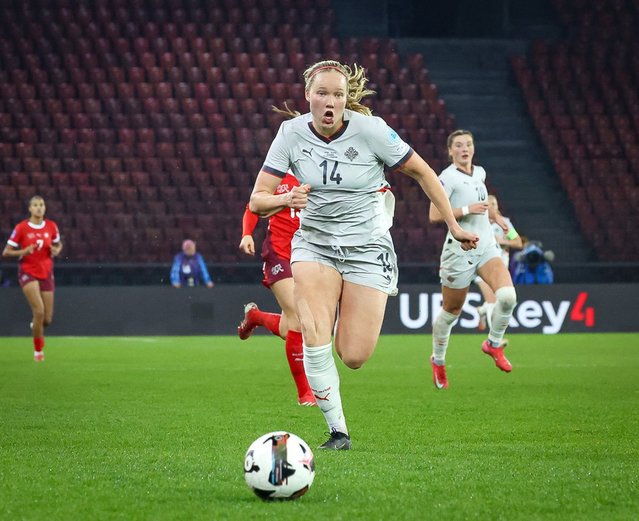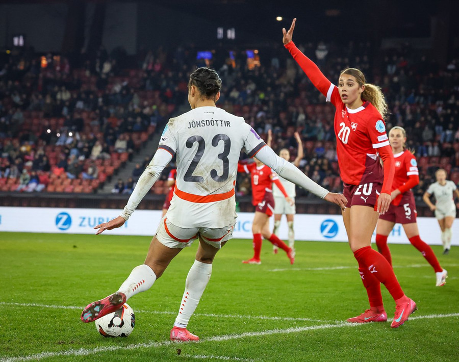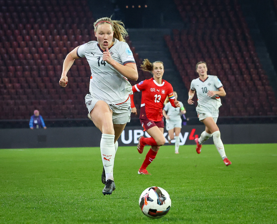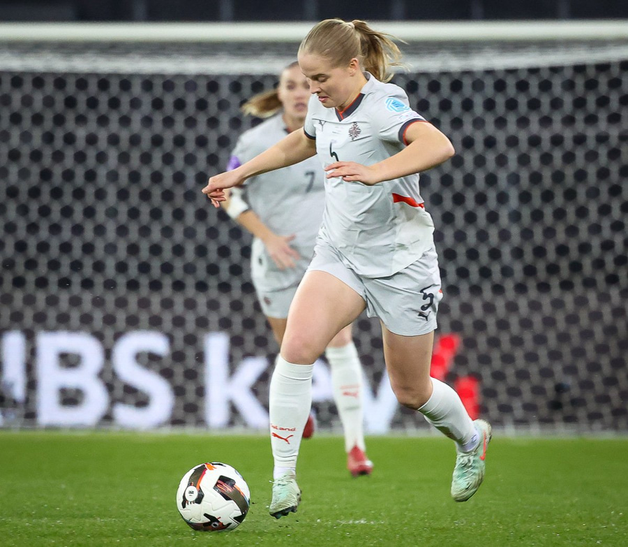 Langt innkast frá Sveindísi Jane en Sviss kemur þessu burt. Karólína Lea eltir og það er hangið í henni en ekkert dæmt.