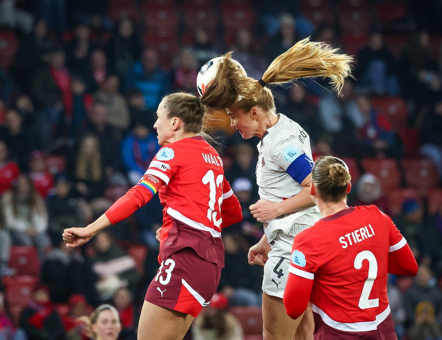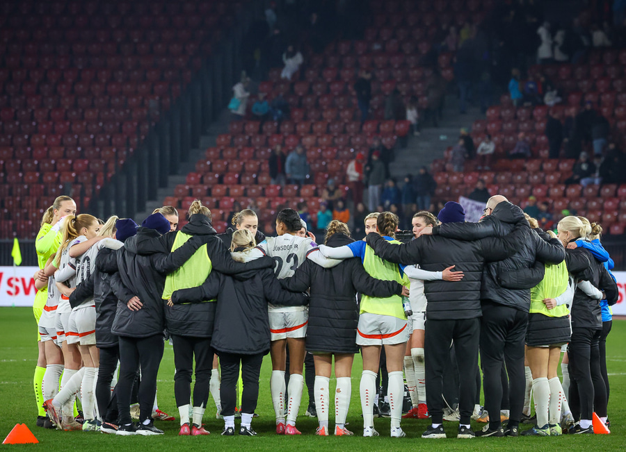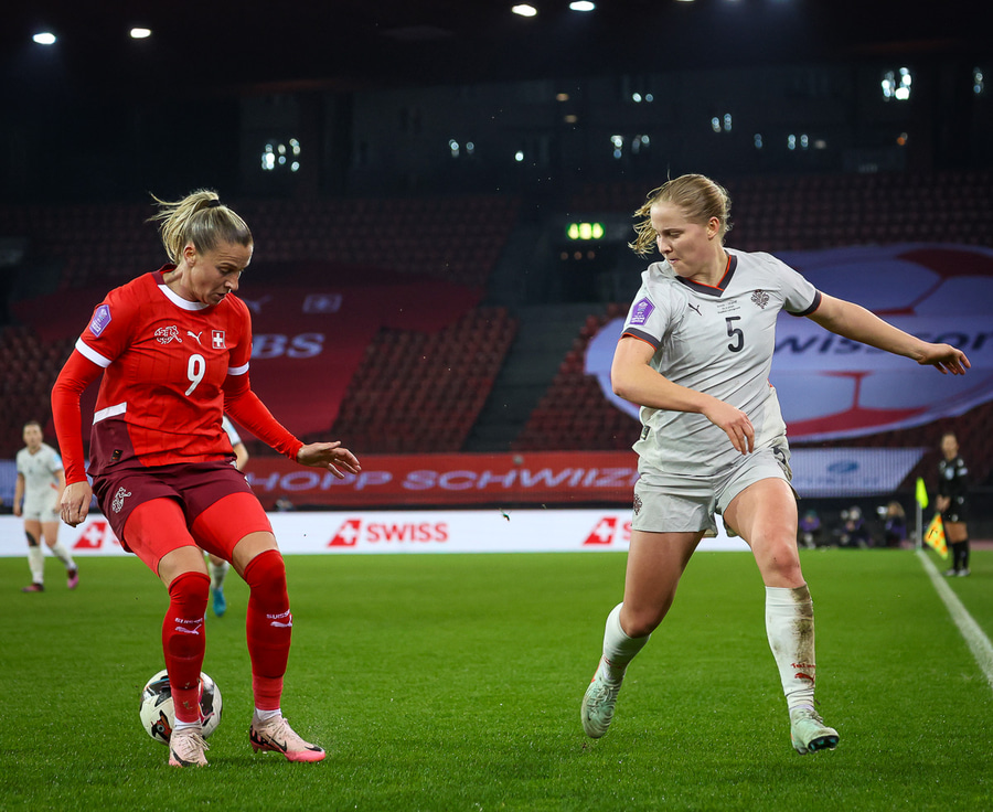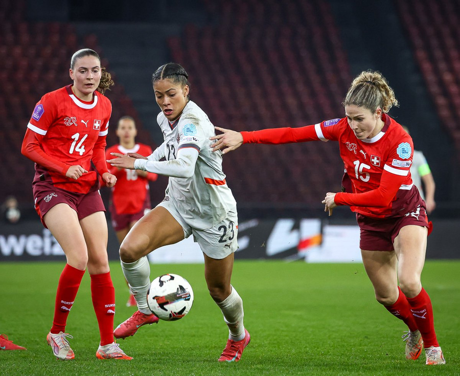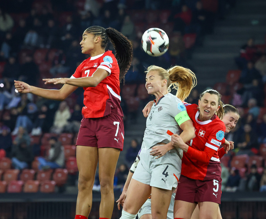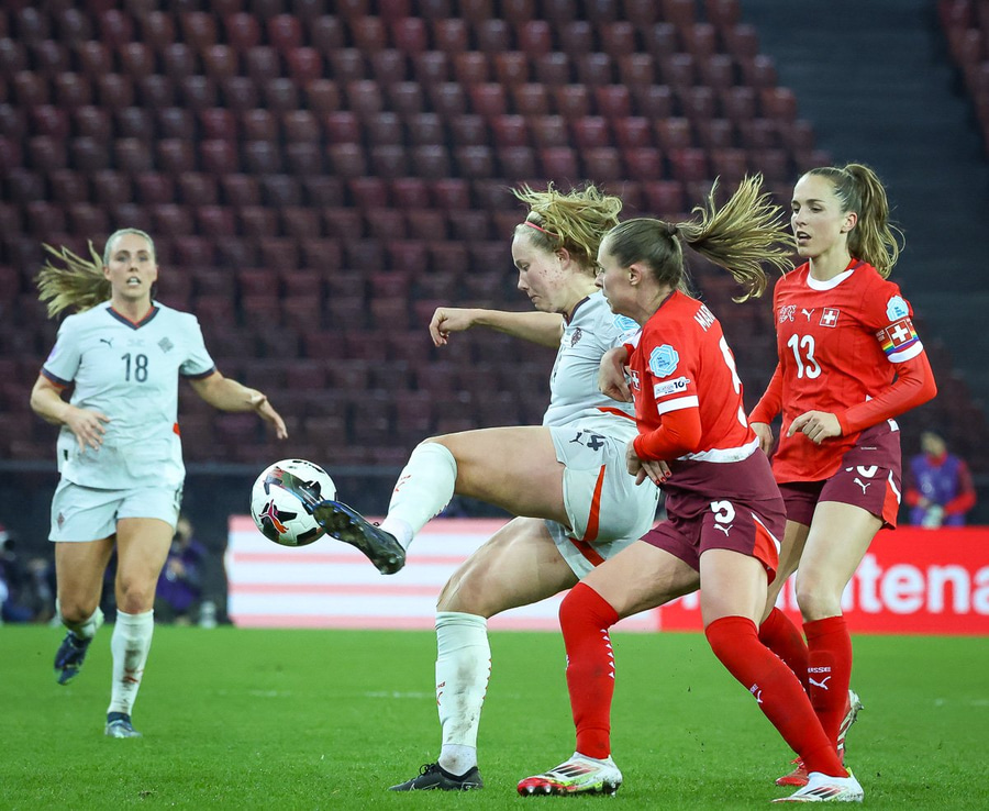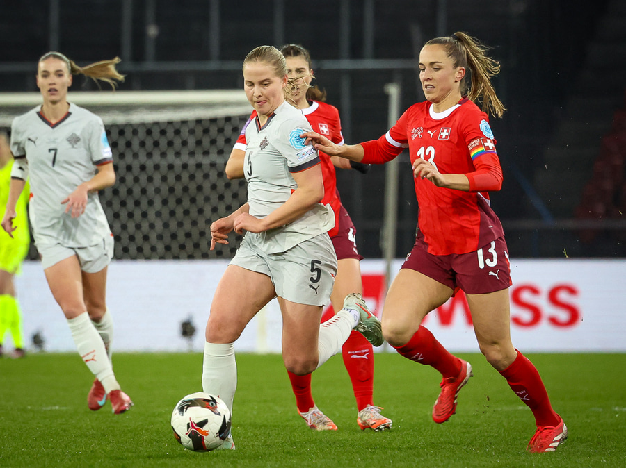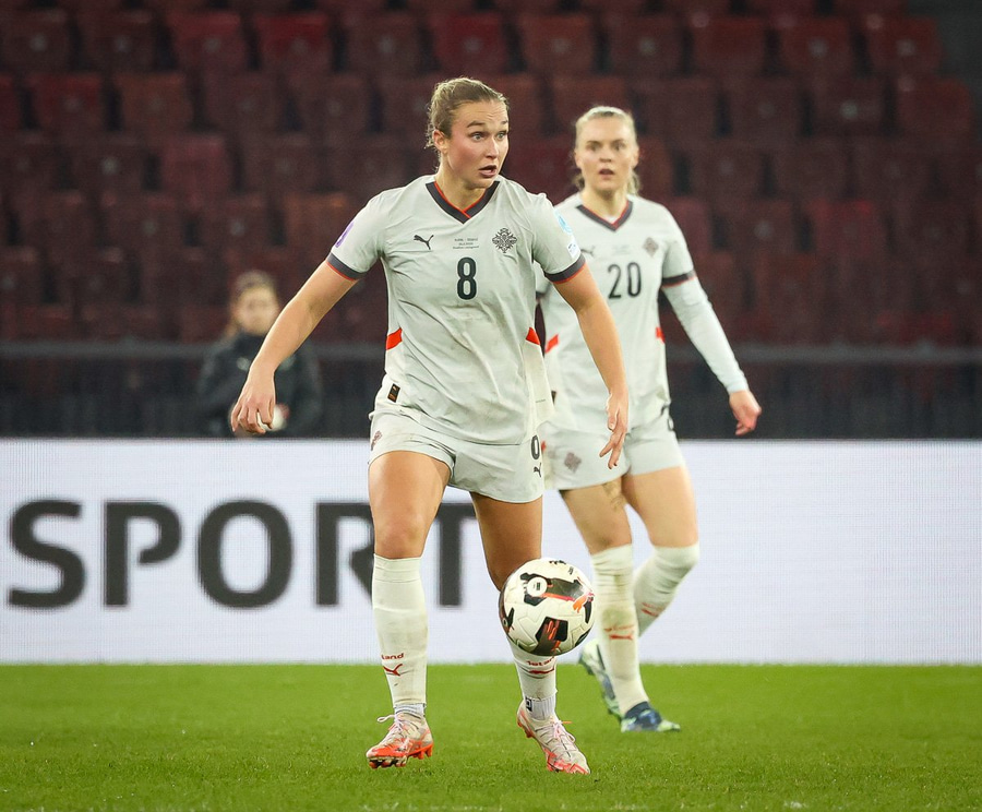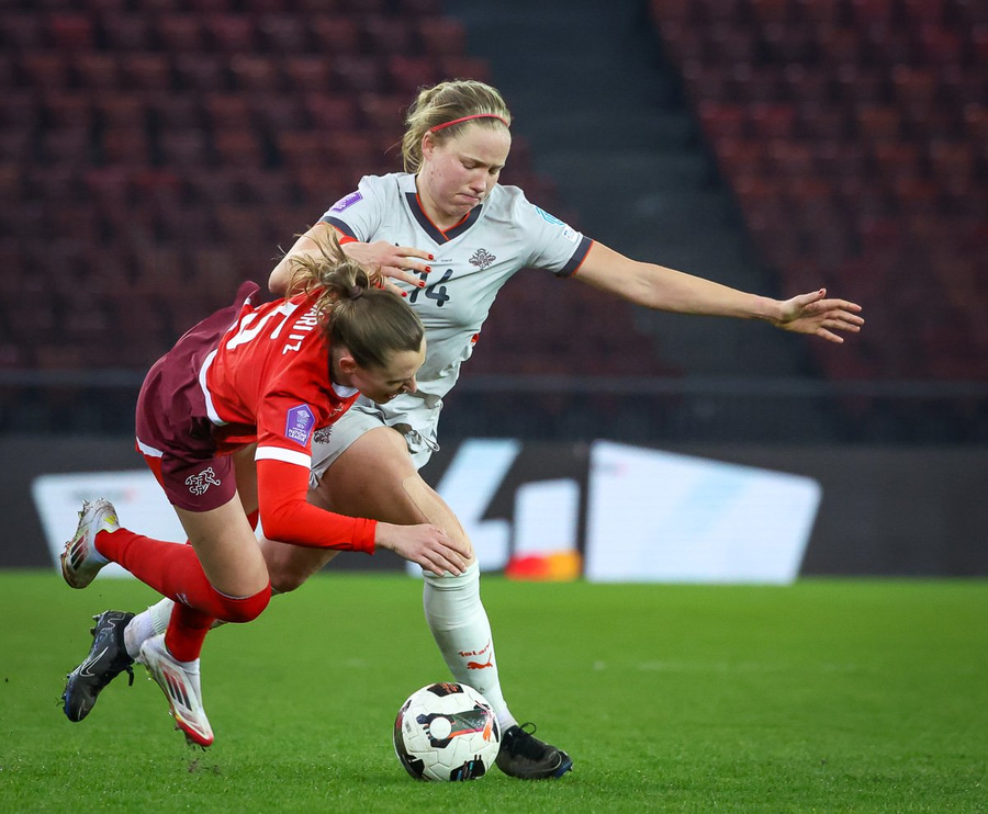 Langt innkast frá Sveindísi Jane en Sviss kemur þessu burt. Karólína Lea eltir og það er hangið í henni en ekkert dæmt.