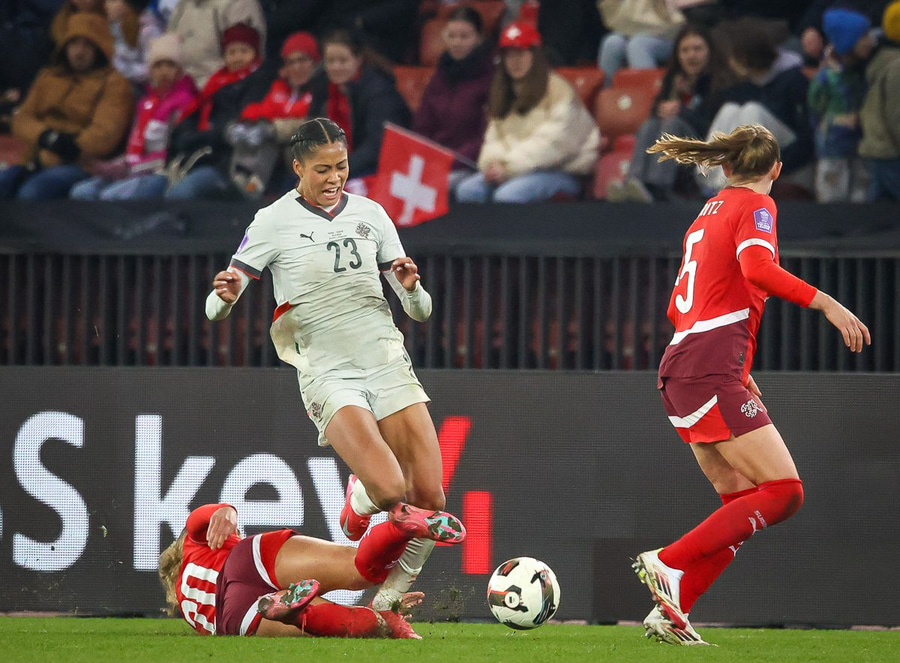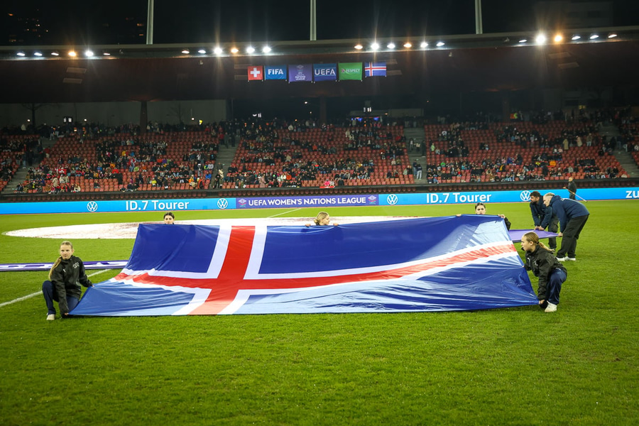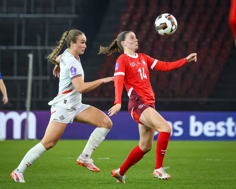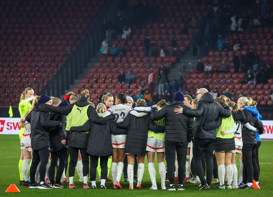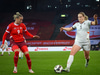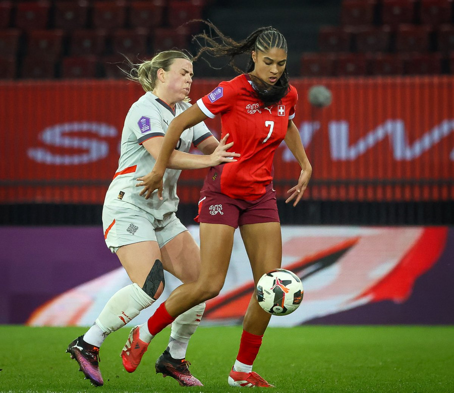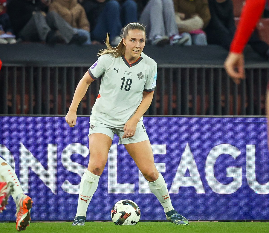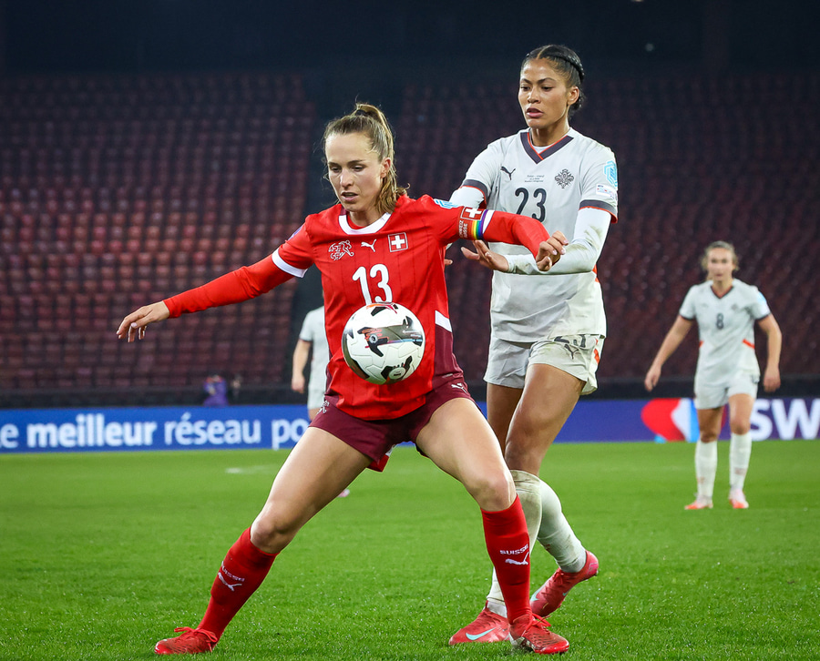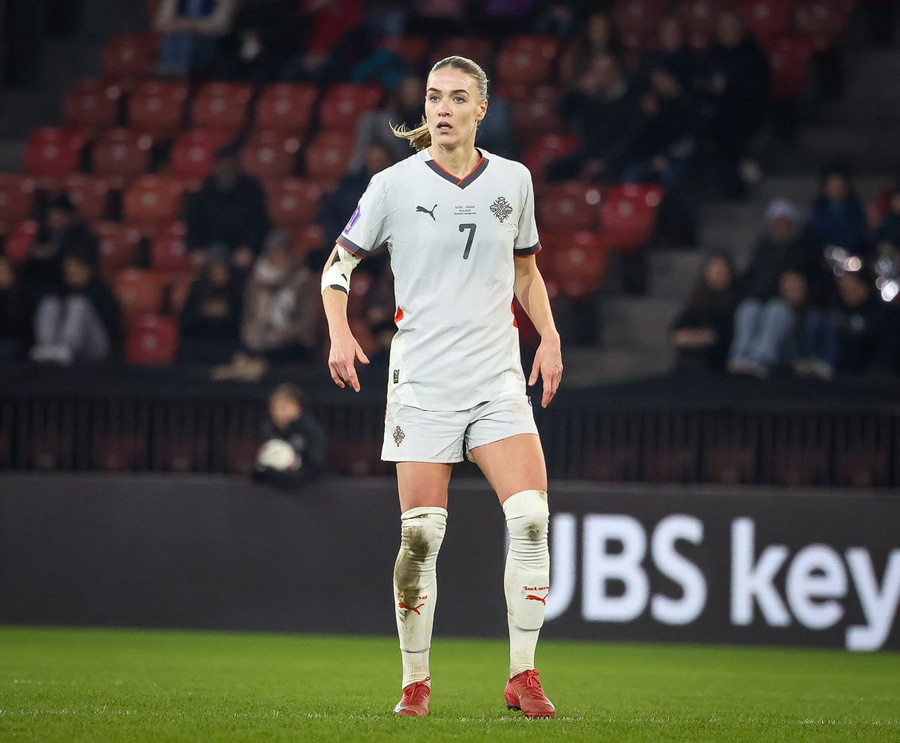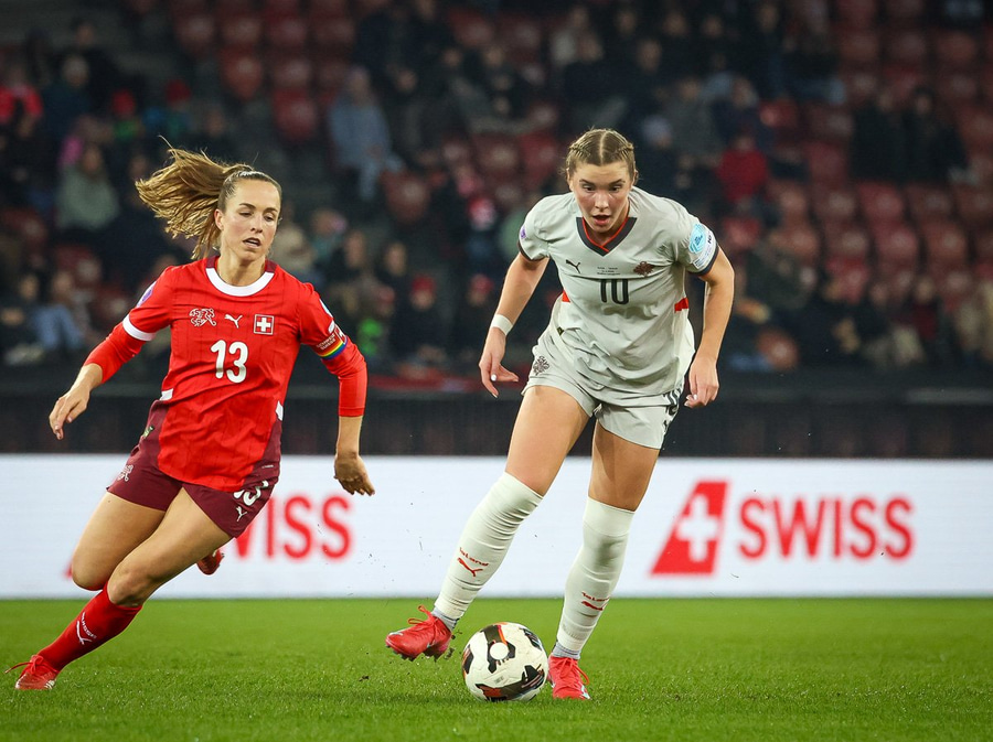 Langt innkast frá Sveindísi Jane en Sviss kemur þessu burt. Karólína Lea eltir og það er hangið í henni en ekkert dæmt.