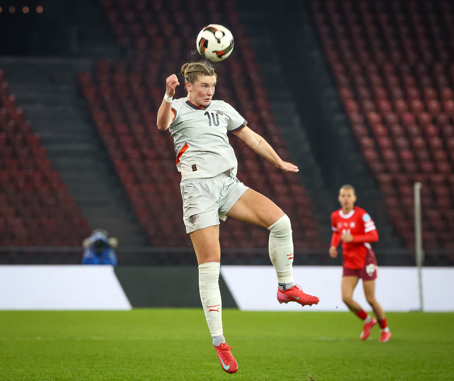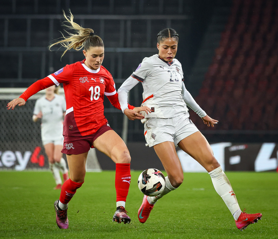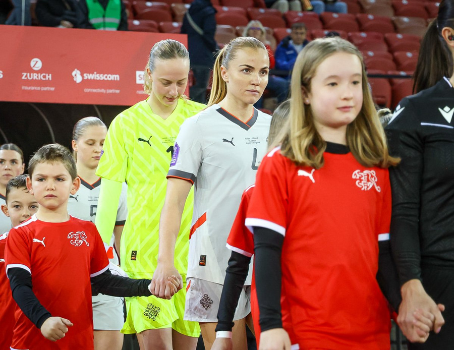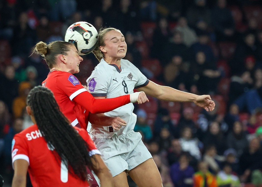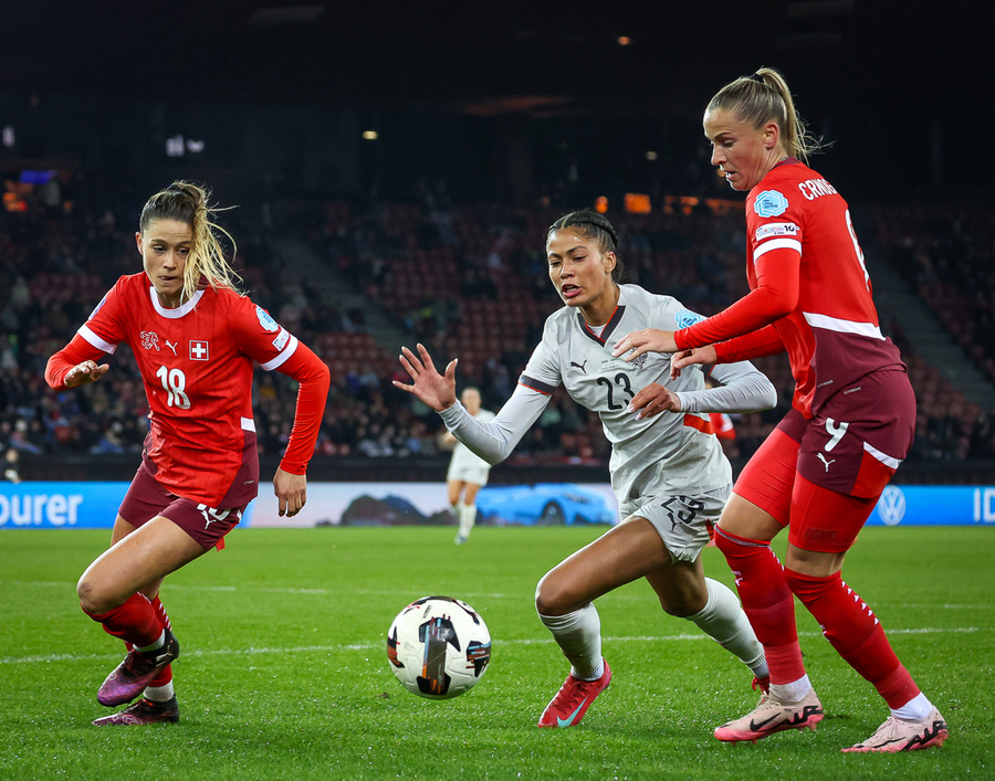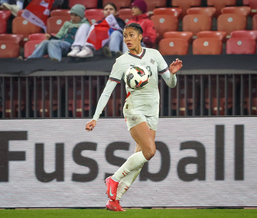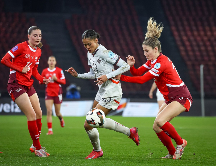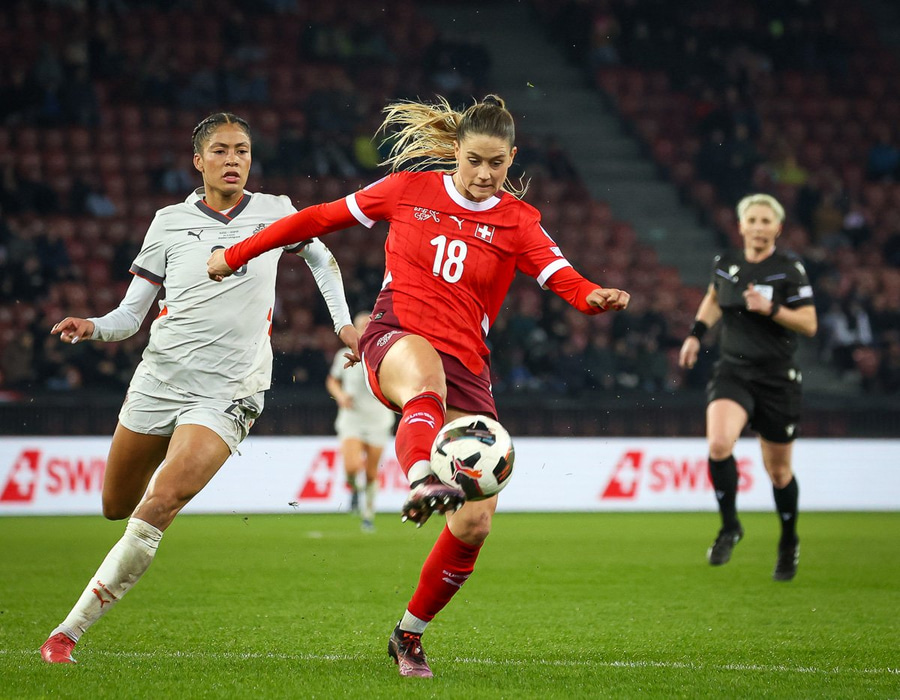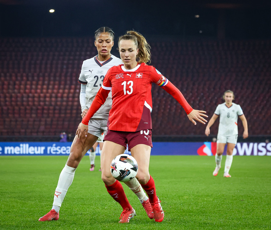 Langt innkast frá Sveindísi Jane en Sviss kemur þessu burt. Karólína Lea eltir og það er hangið í henni en ekkert dæmt.