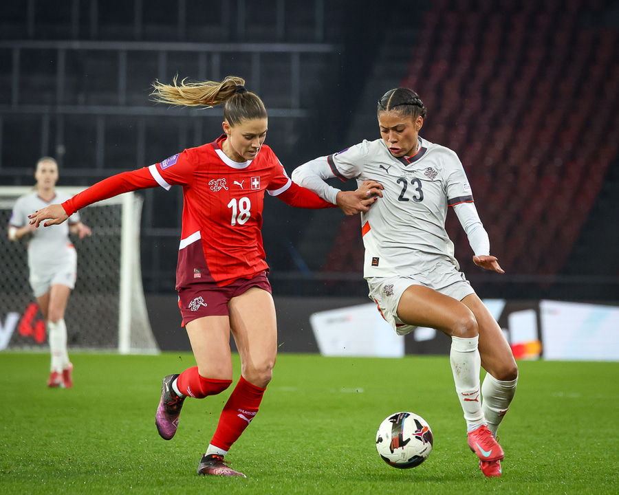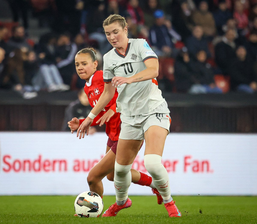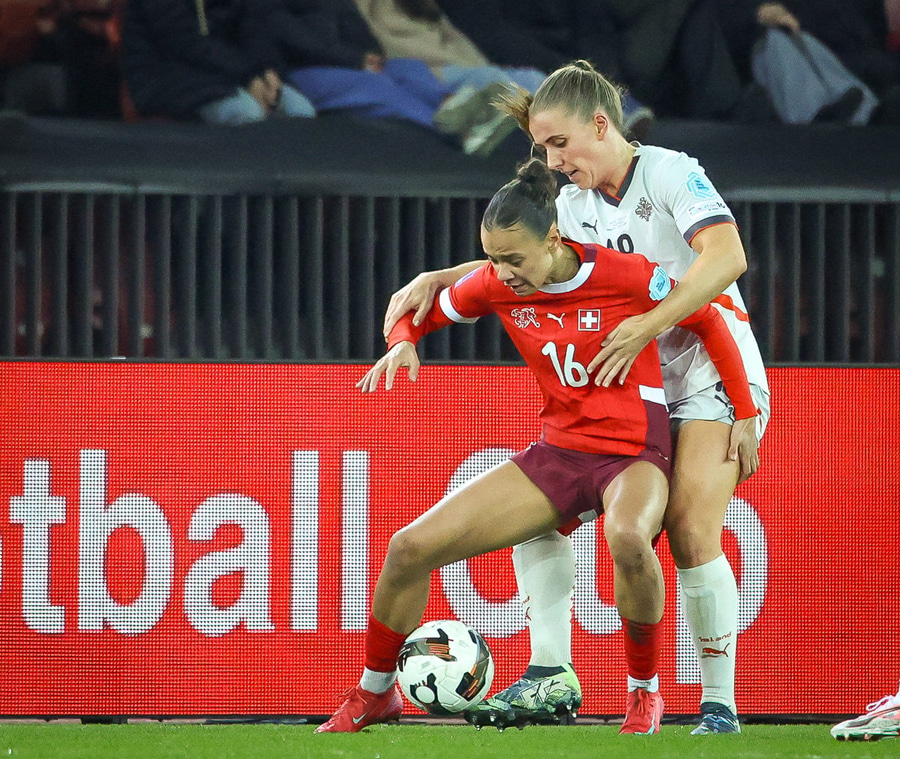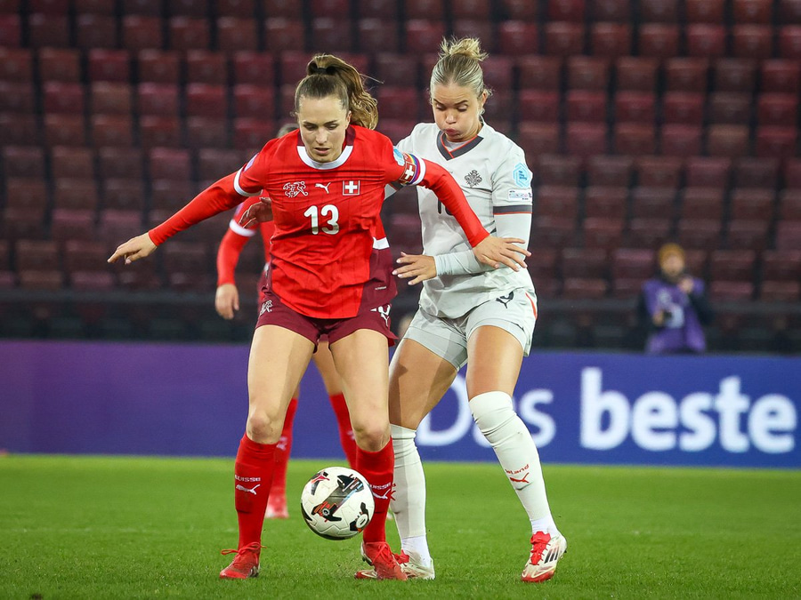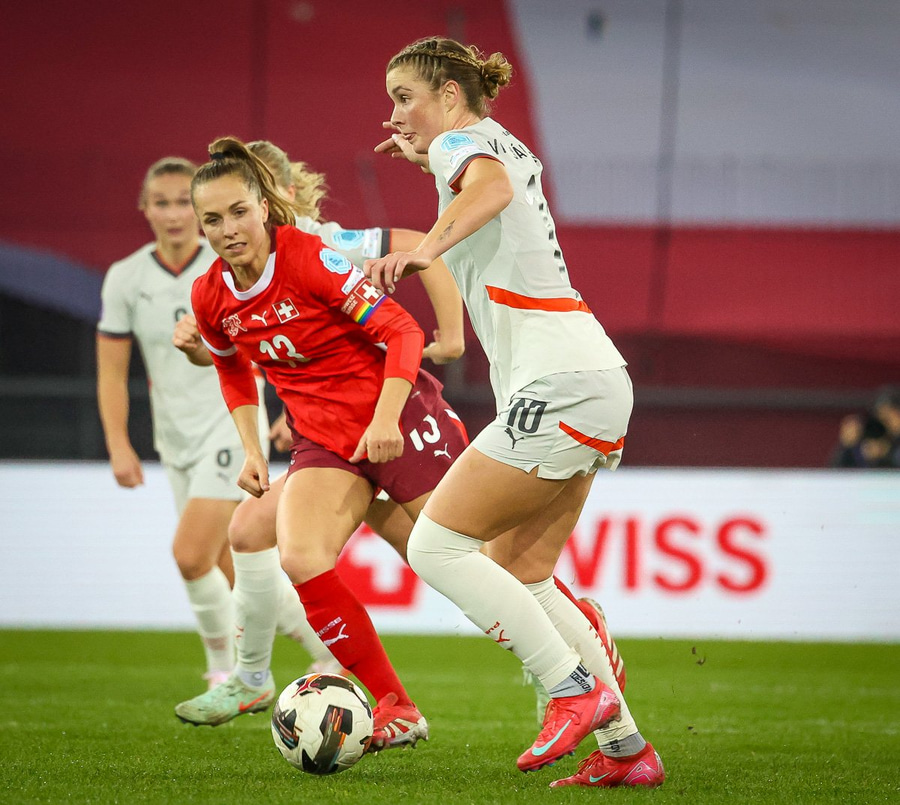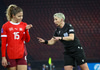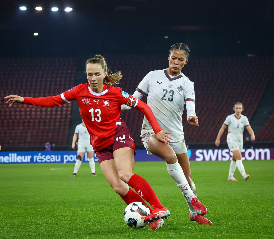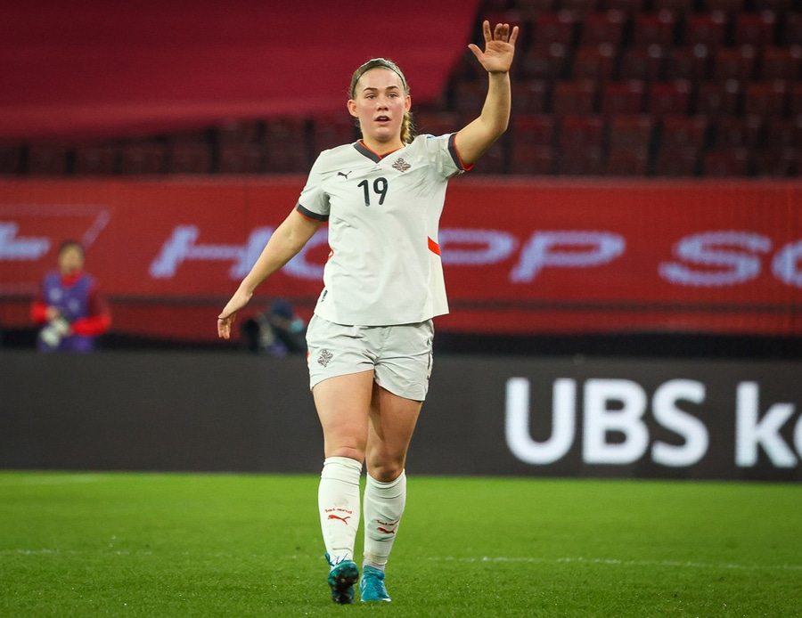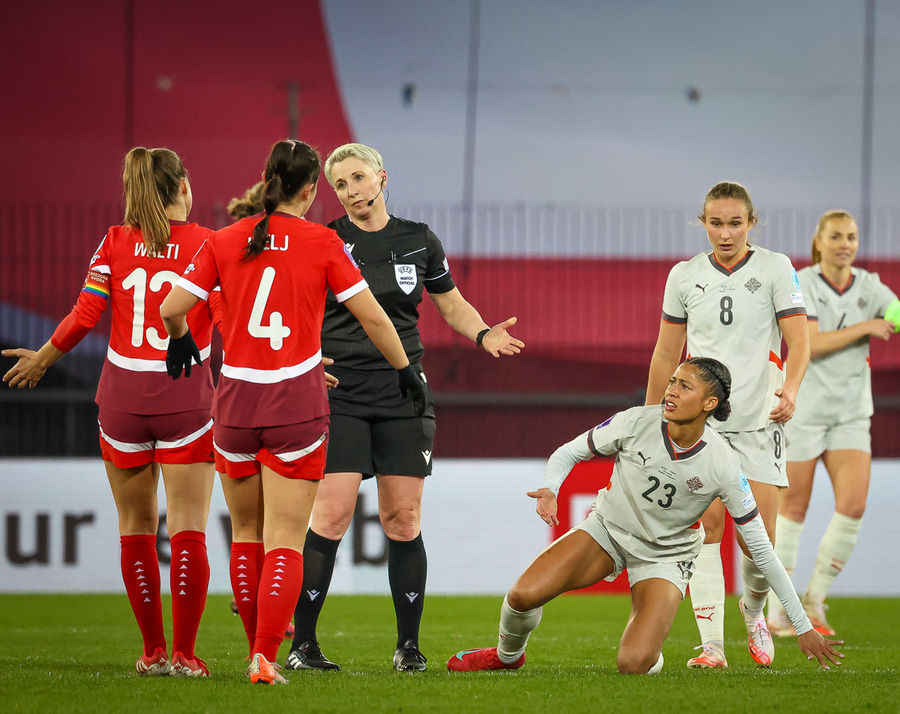 Julia Stierli steinhissa að vera dæmd brotleg þegar hún brýtur á Sveindís Jane við miðlínu. Ef Sveindís Jane hefði náð að snúa væri hún að sleppa ein í gegn.