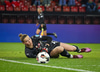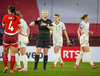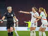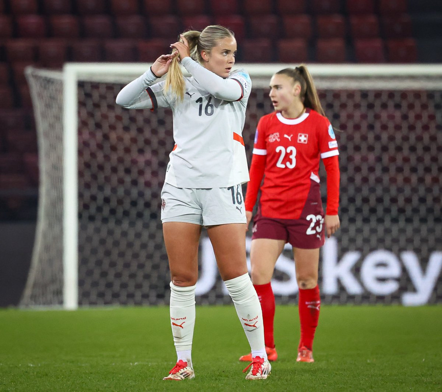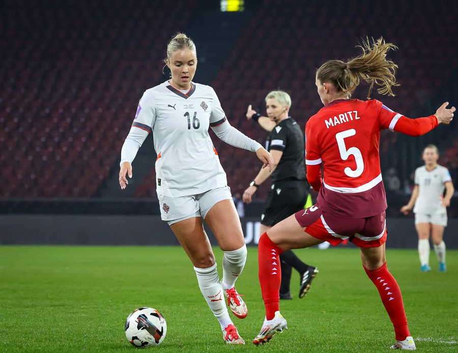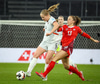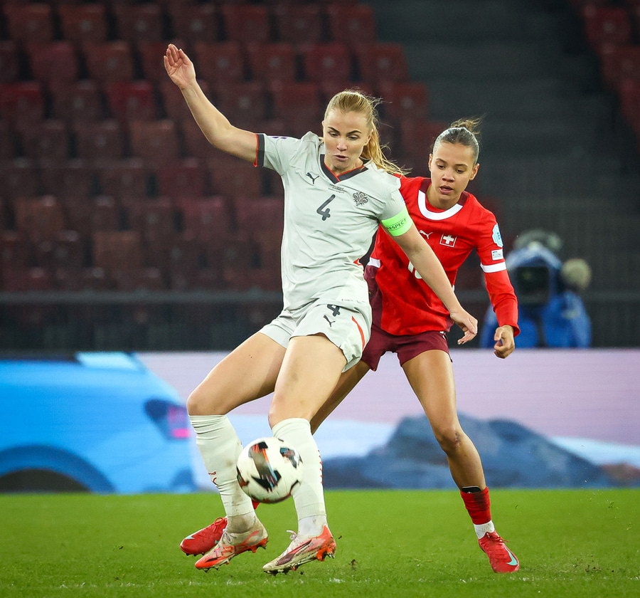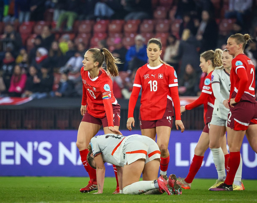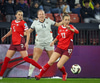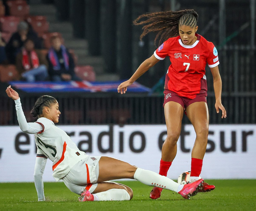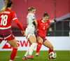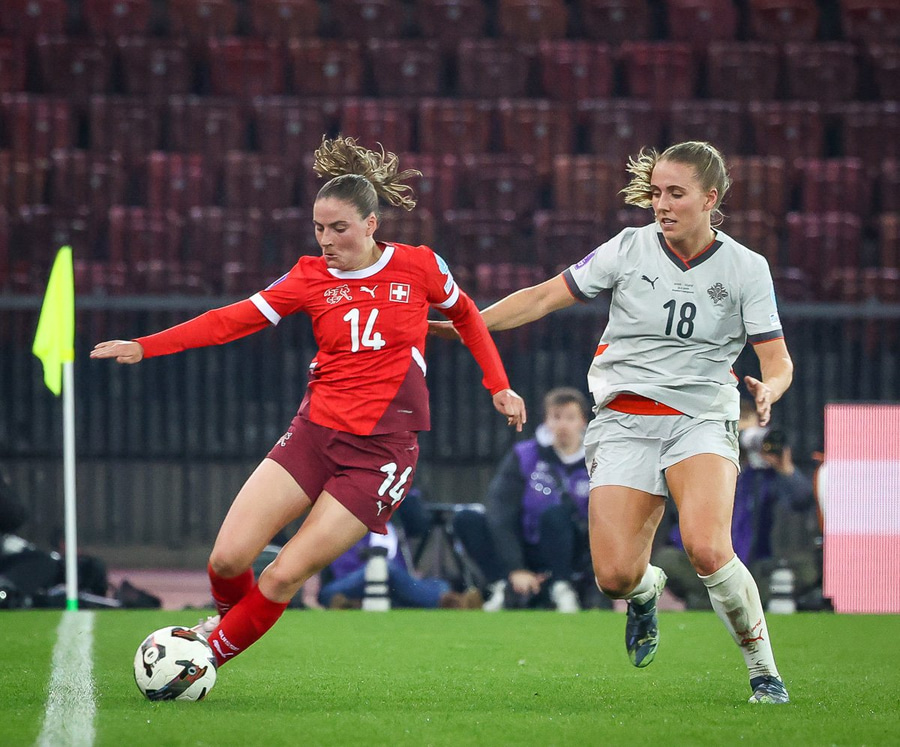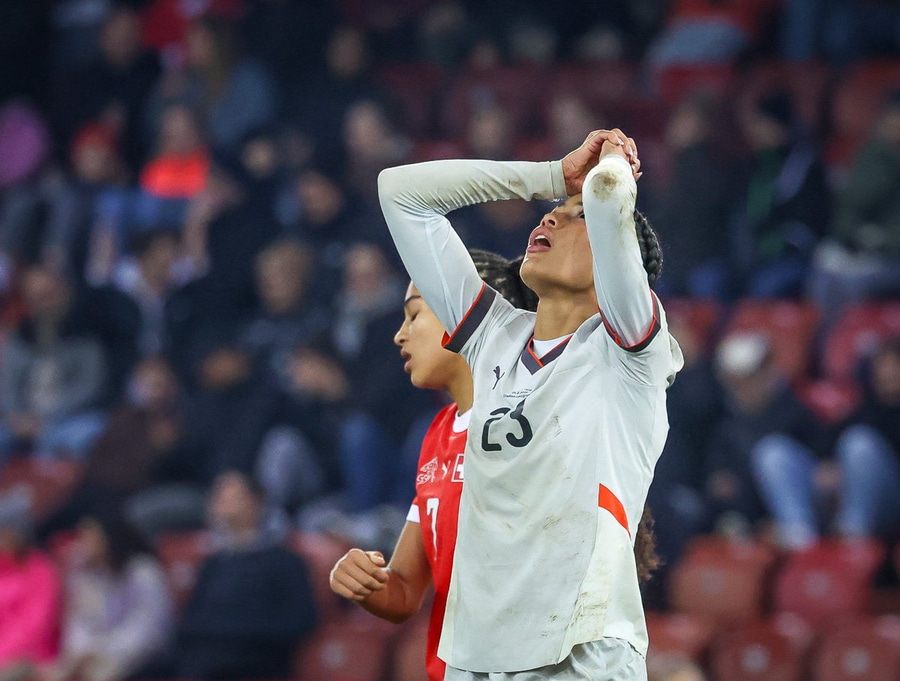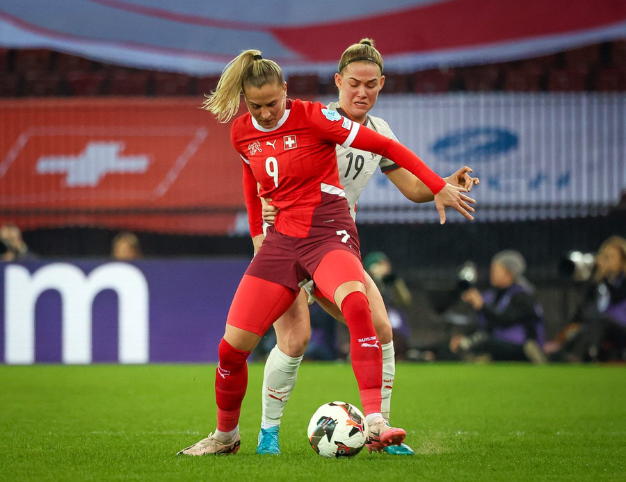 Julia Stierli steinhissa að vera dæmd brotleg þegar hún brýtur á Sveindís Jane við miðlínu. Ef Sveindís Jane hefði náð að snúa væri hún að sleppa ein í gegn.