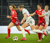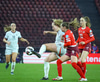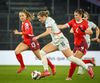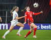 Karólína Lea í flottri stöðu og fær hlaup frá Sveindís Jane en hikar og endar svo á að skjóta sjálf beint á Elvira Herzog í marki Sviss.