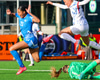 Emilía með frábæran sprett inn á teiginn og reynir að finna Sveindísi Jane en boltinn af varnarmanni Noregs og í fangið á Cecilie í marki Noregs.
