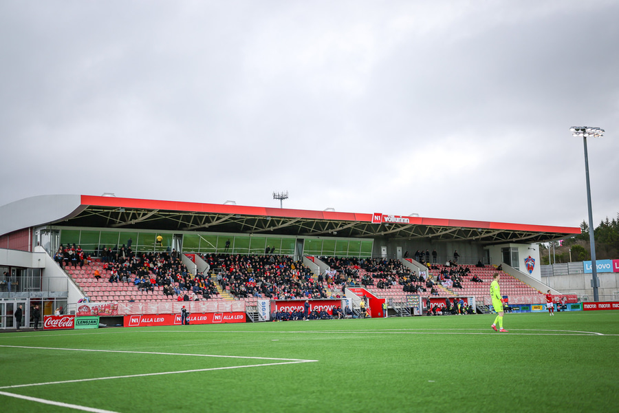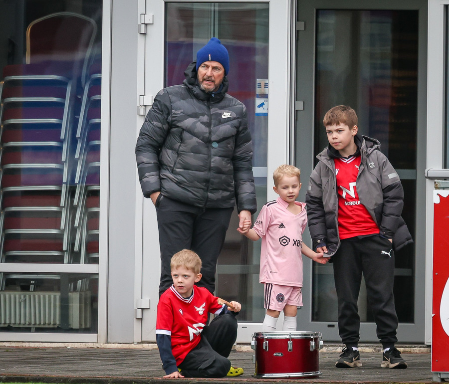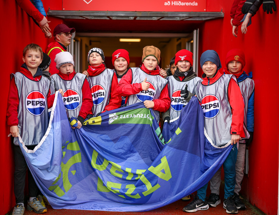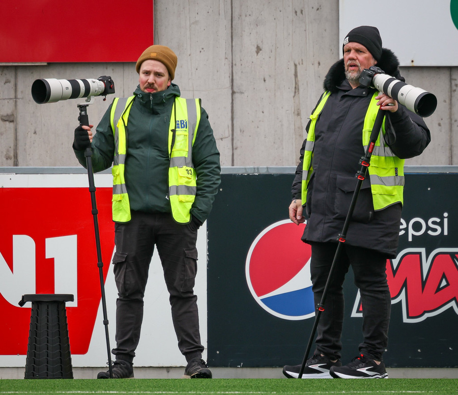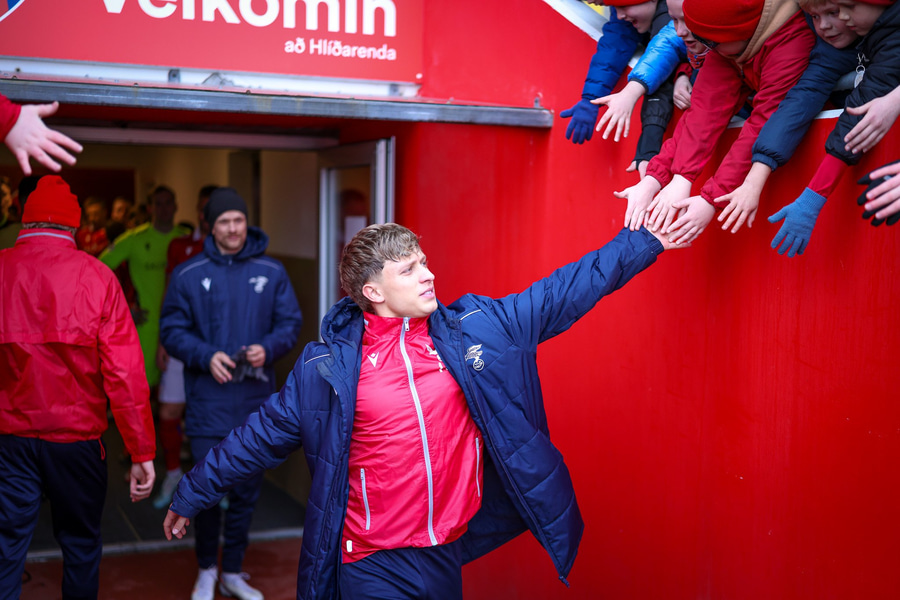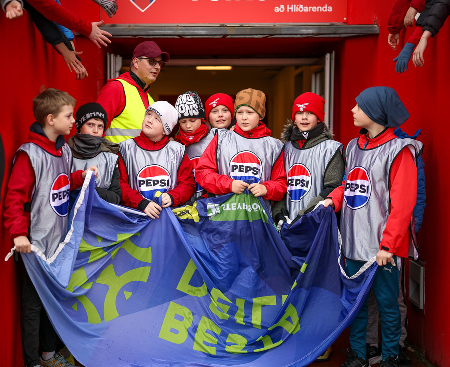 Það fer að styttast í þetta! Liðin öll komin inn í klefa og völlurinn að blotna í gegn. Einar vallarþulur þylur liðin upp fyrir áhorfendur, sem eru hægt og rólega að týnast yfir í stúkuna úr fjósinu.