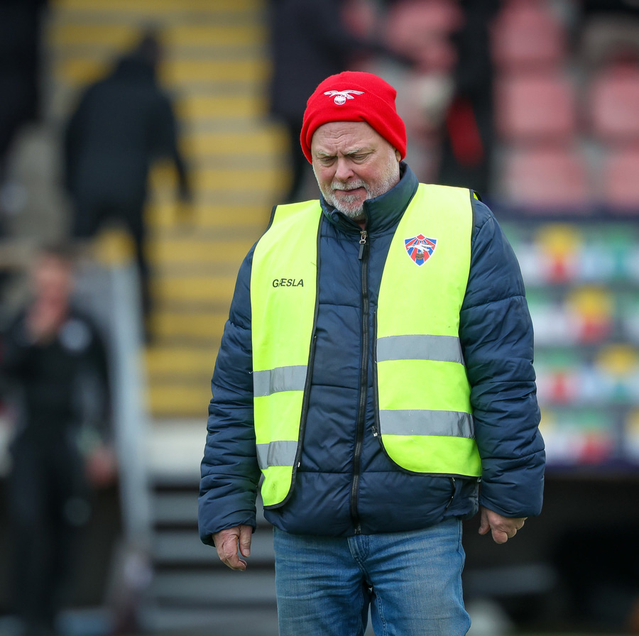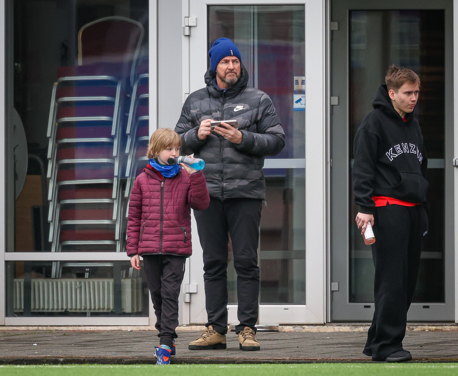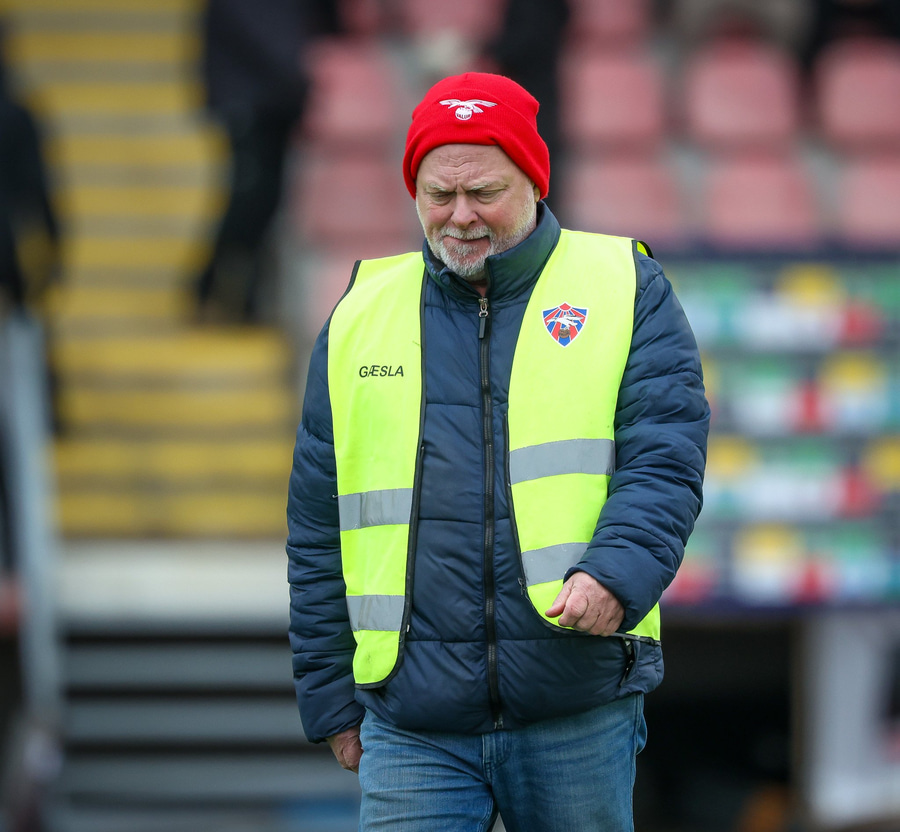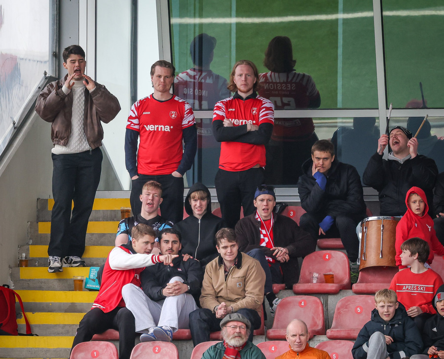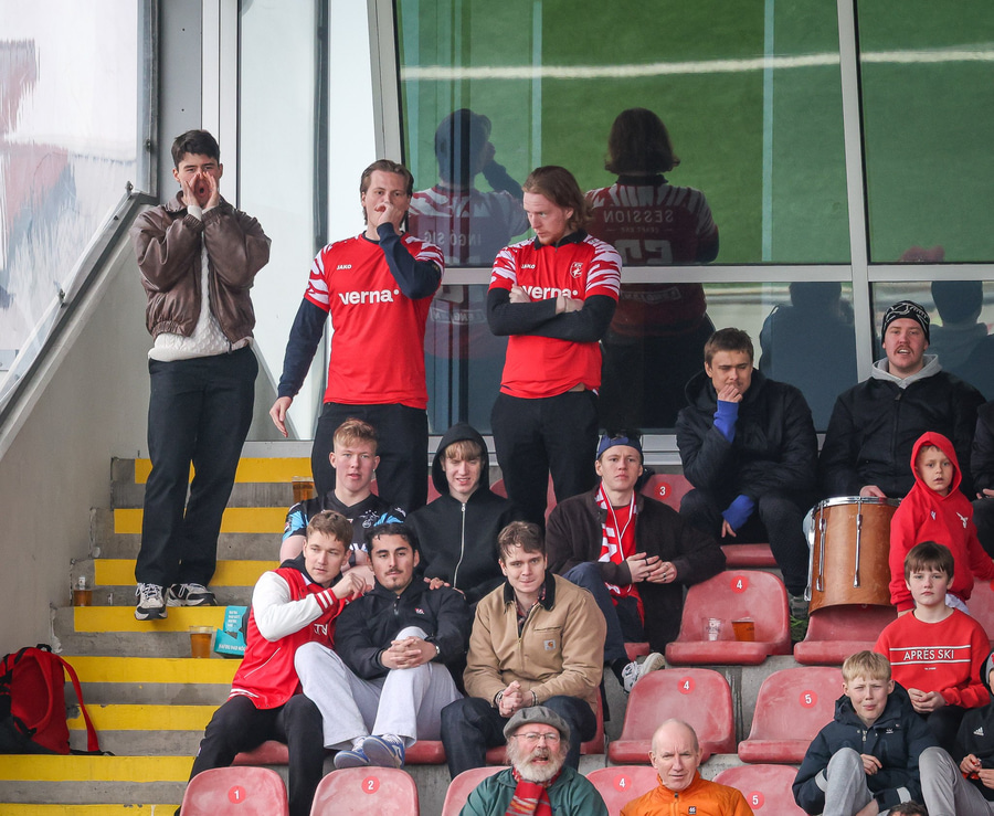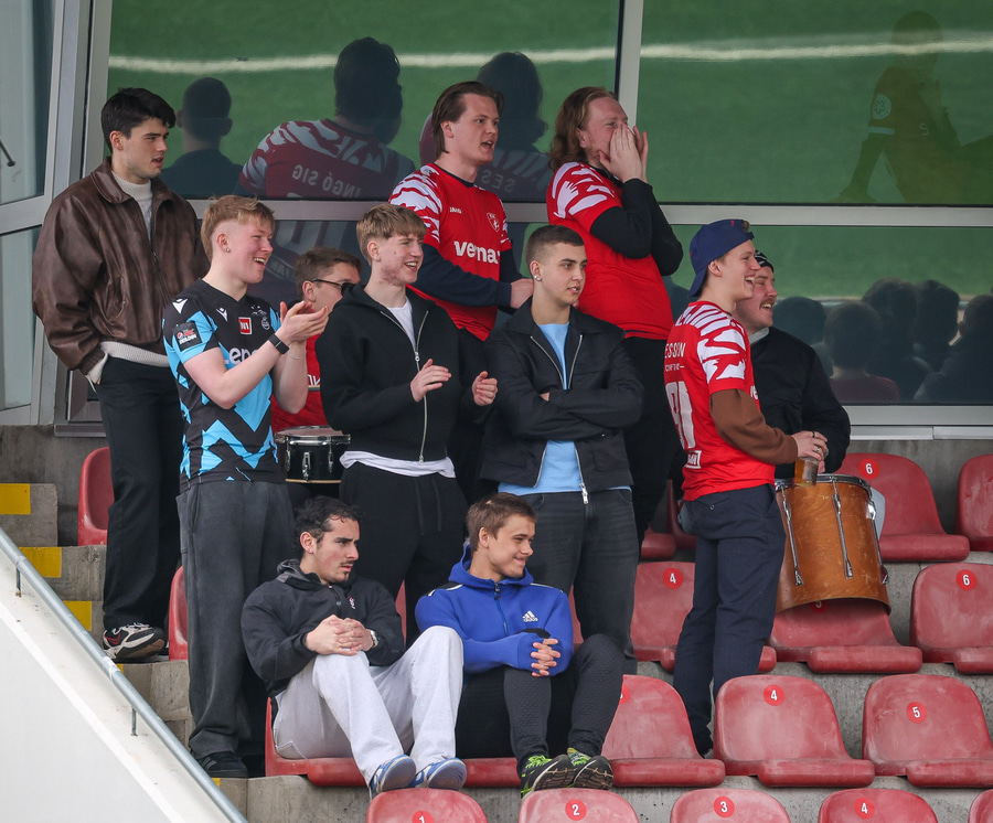 Það fer að styttast í þetta! Liðin öll komin inn í klefa og völlurinn að blotna í gegn. Einar vallarþulur þylur liðin upp fyrir áhorfendur, sem eru hægt og rólega að týnast yfir í stúkuna úr fjósinu.