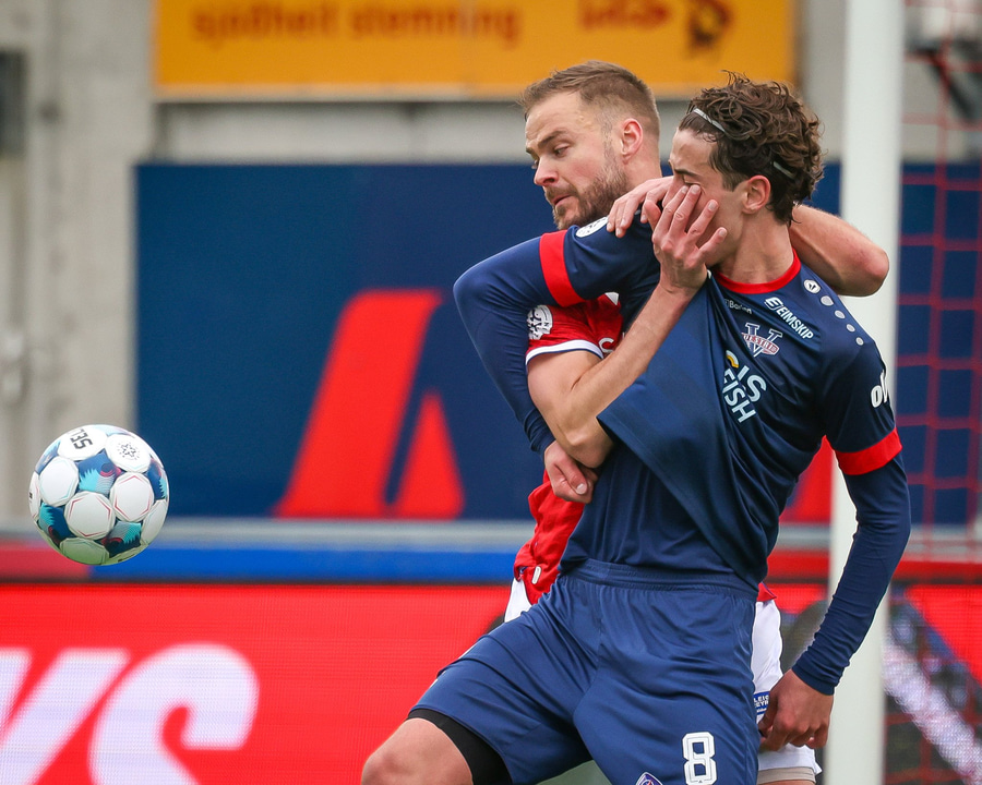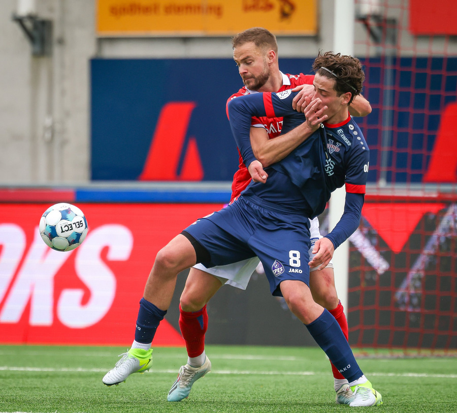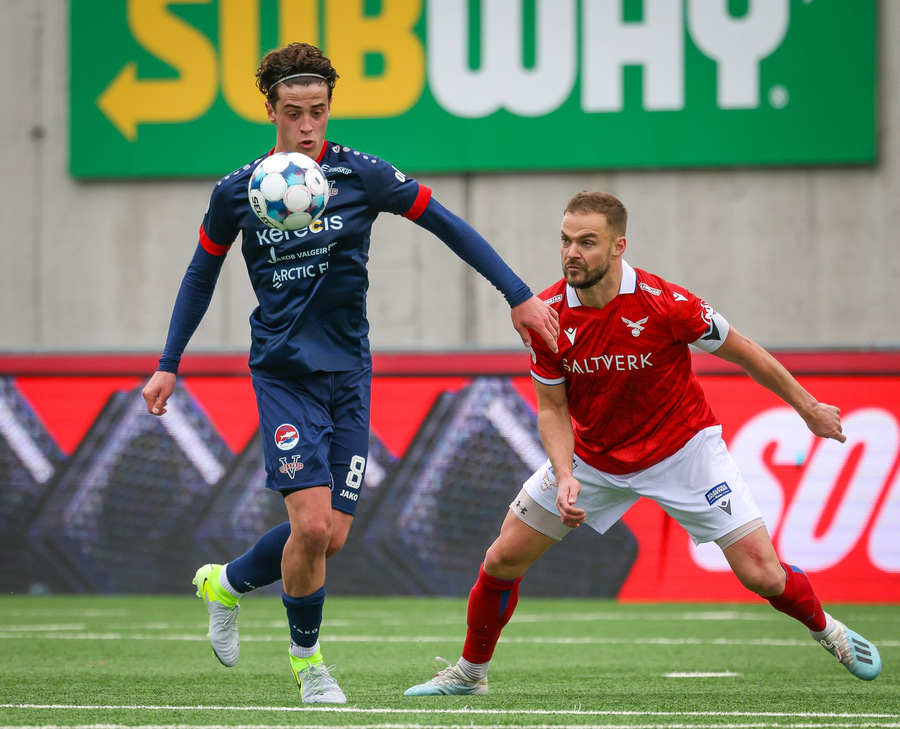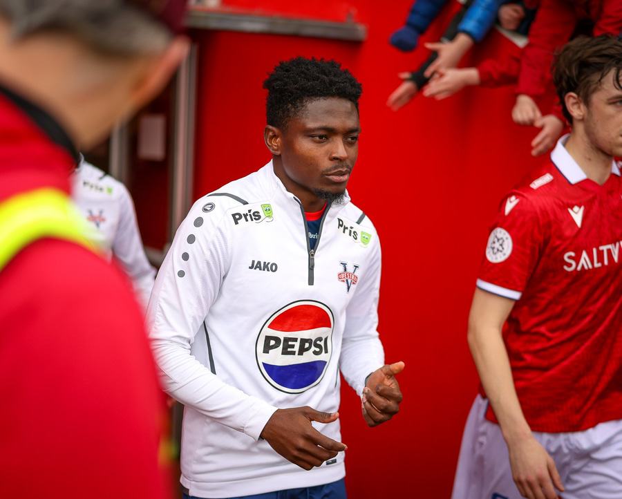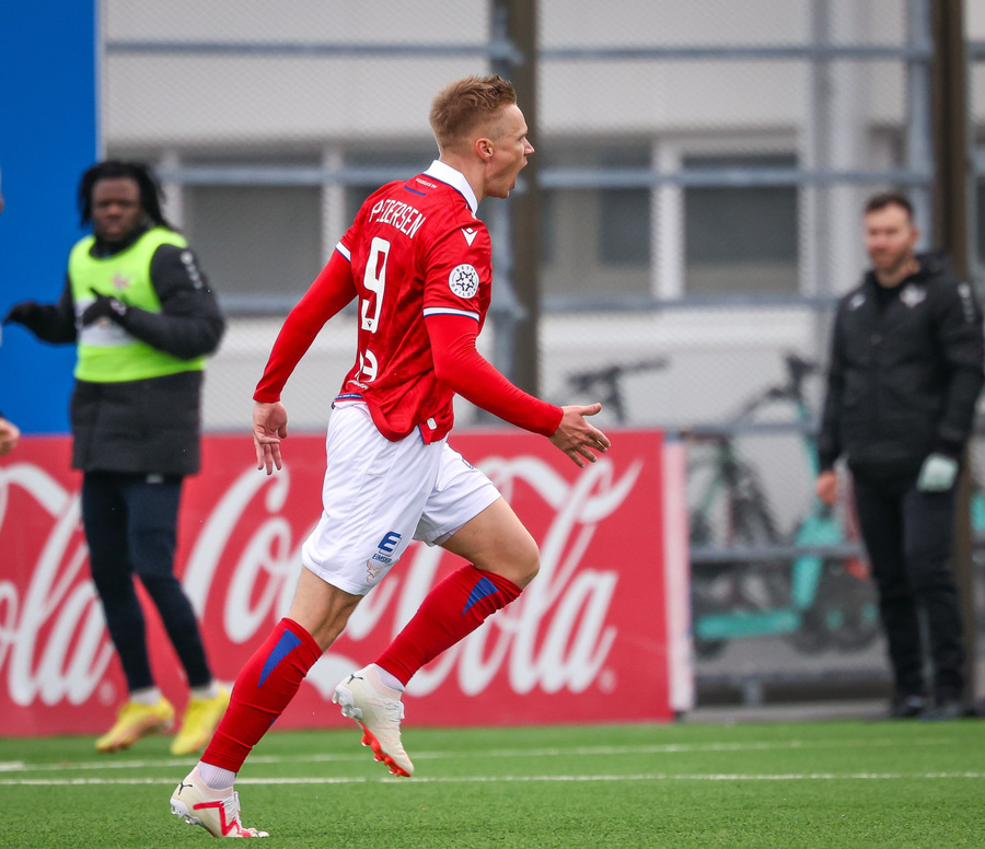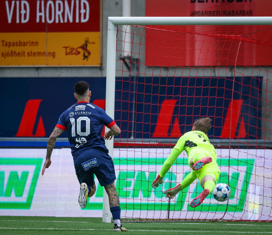 Valur kemur boltanum inn á teiginn og Patrick Pederson fær hann hægra megin við markið, nálægt endalínunni. Hann setur boltann í gegnum klofið á Guy Smit og rétt áður en Tryggvi Hrafn nær að pota boltanum í netið hreinsar Sergine Fall.