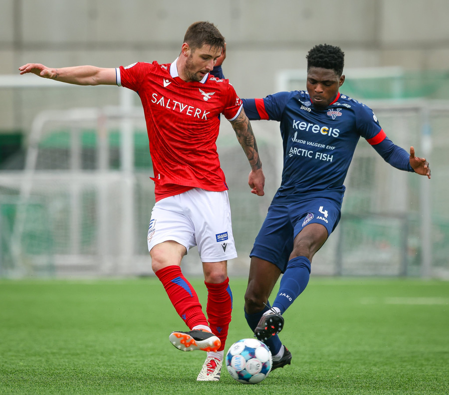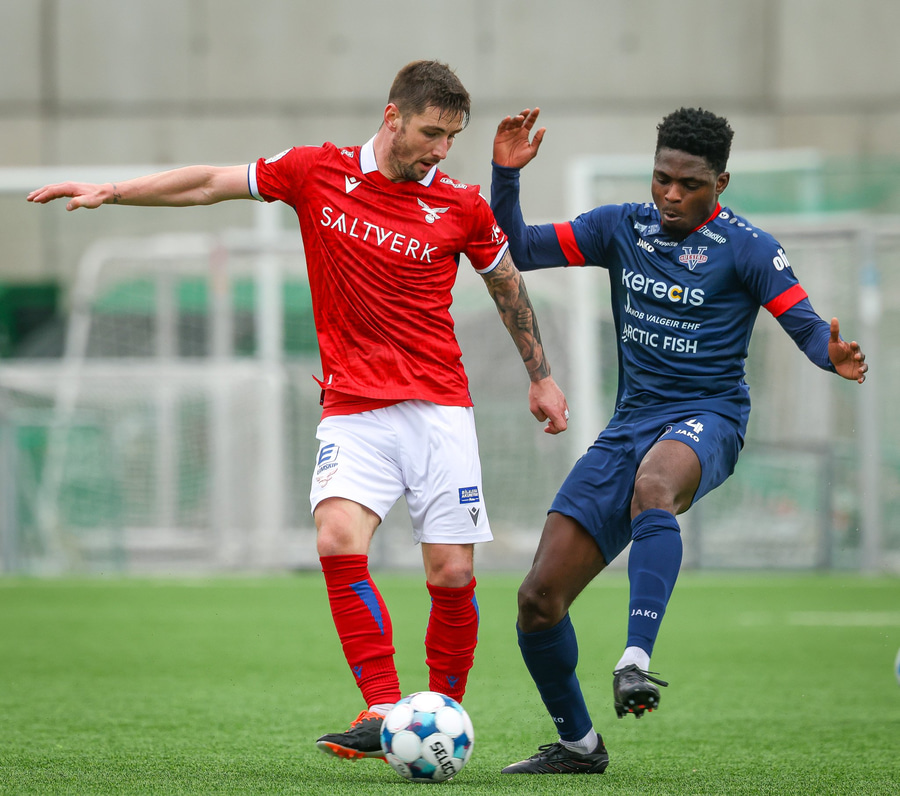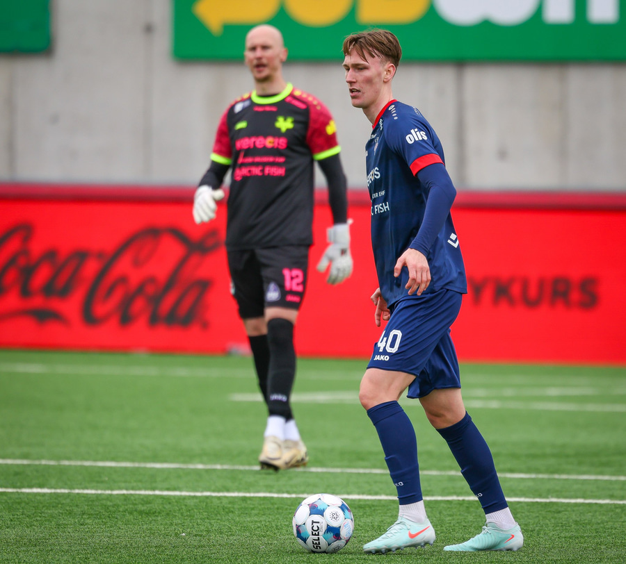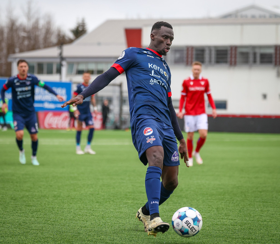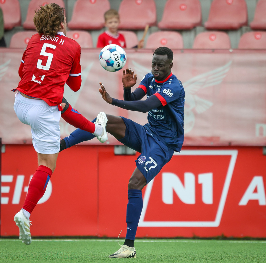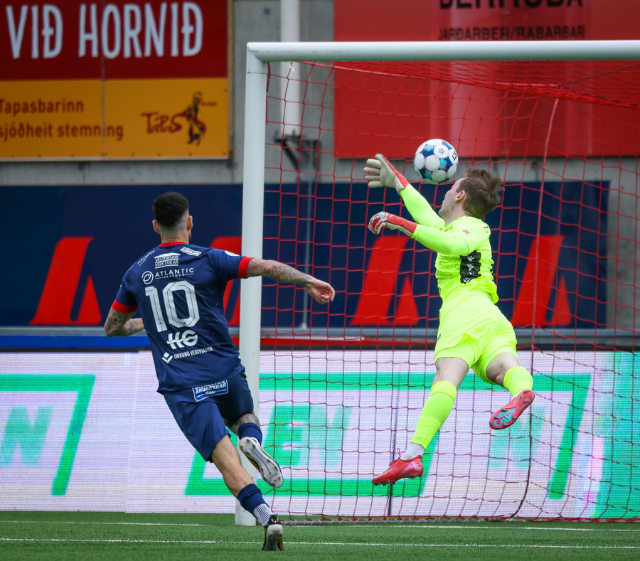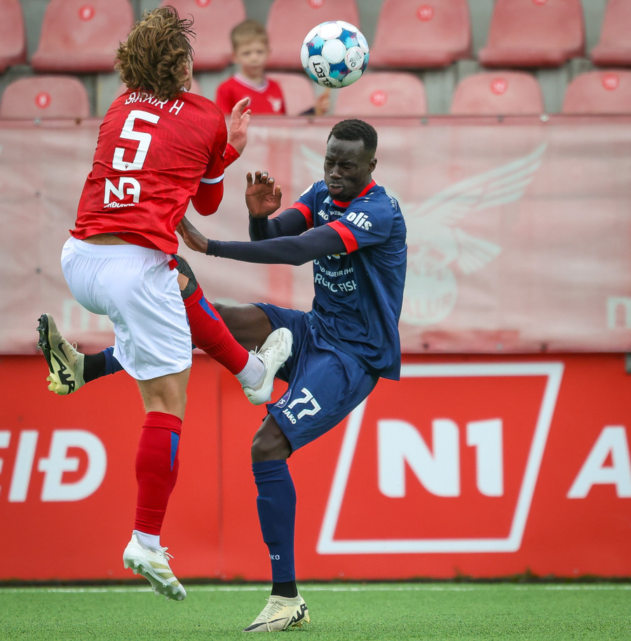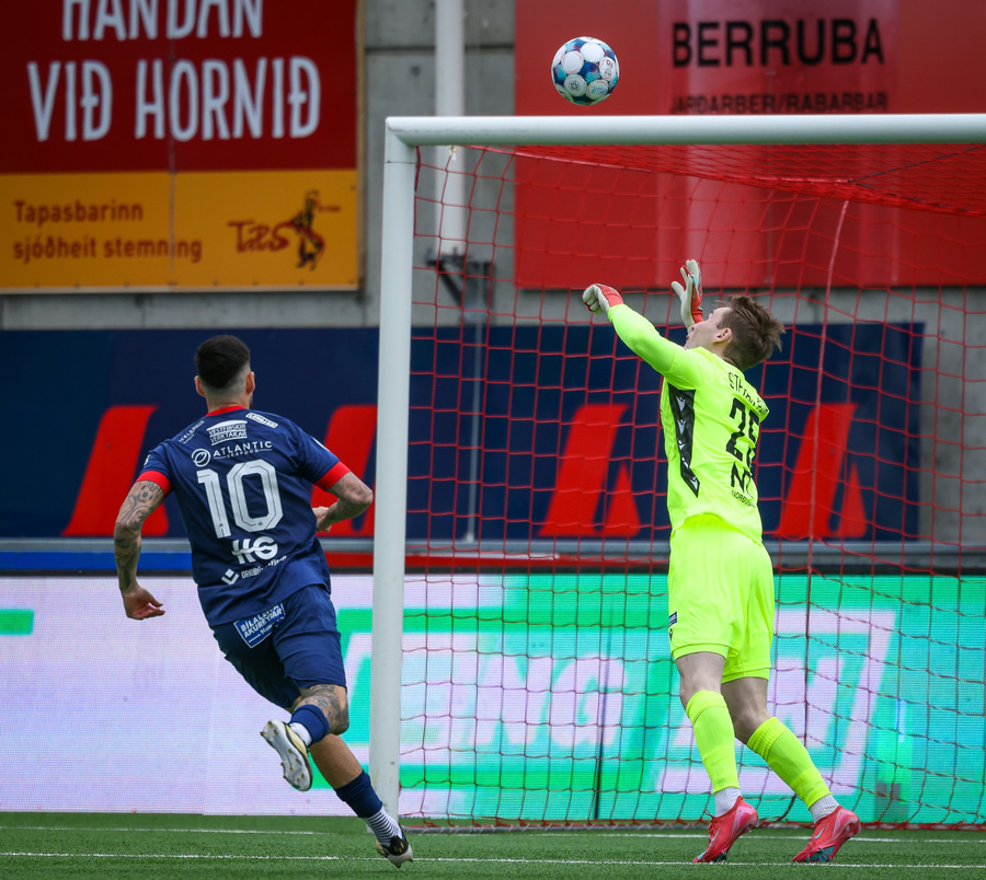Anton Kralj kemst upp vinstri kantinn eftir flott samspil við Jeppe Pedersen. Anton á fína fyrirgjöf inn á Daða Berg sem nær skoti, sem berst aftur Anton. Hann setur boltann fyrir, þar sem Sergine Fall er mættur með seinni skipunum en skot hans frekar auðvelt fyrir Stefán Þór.