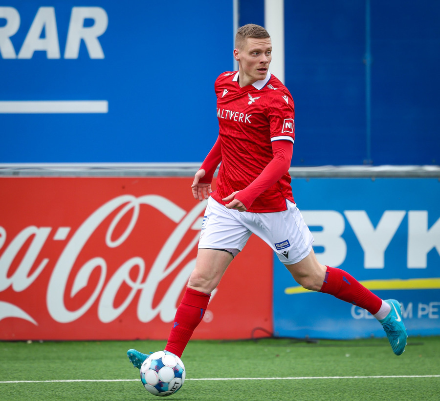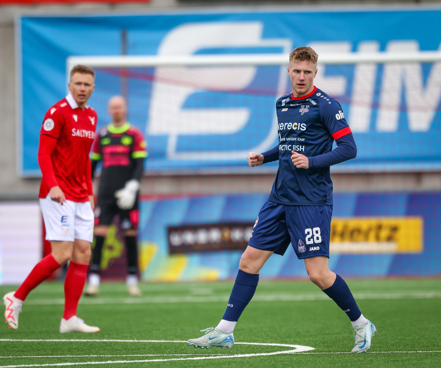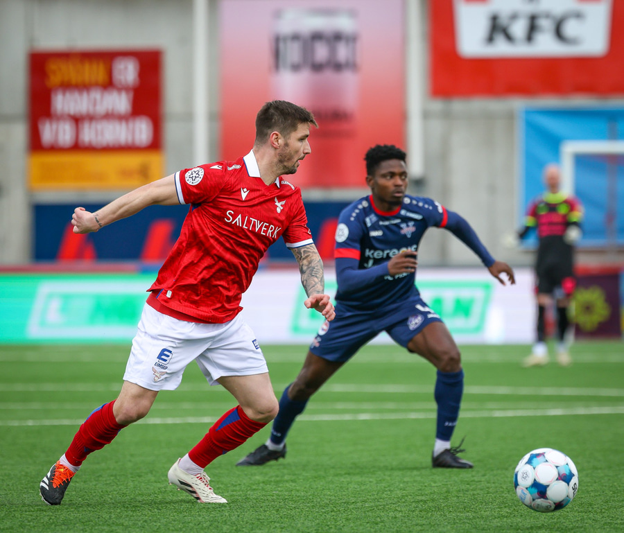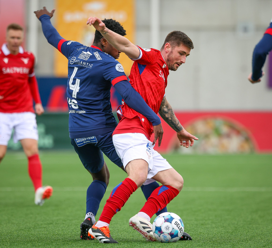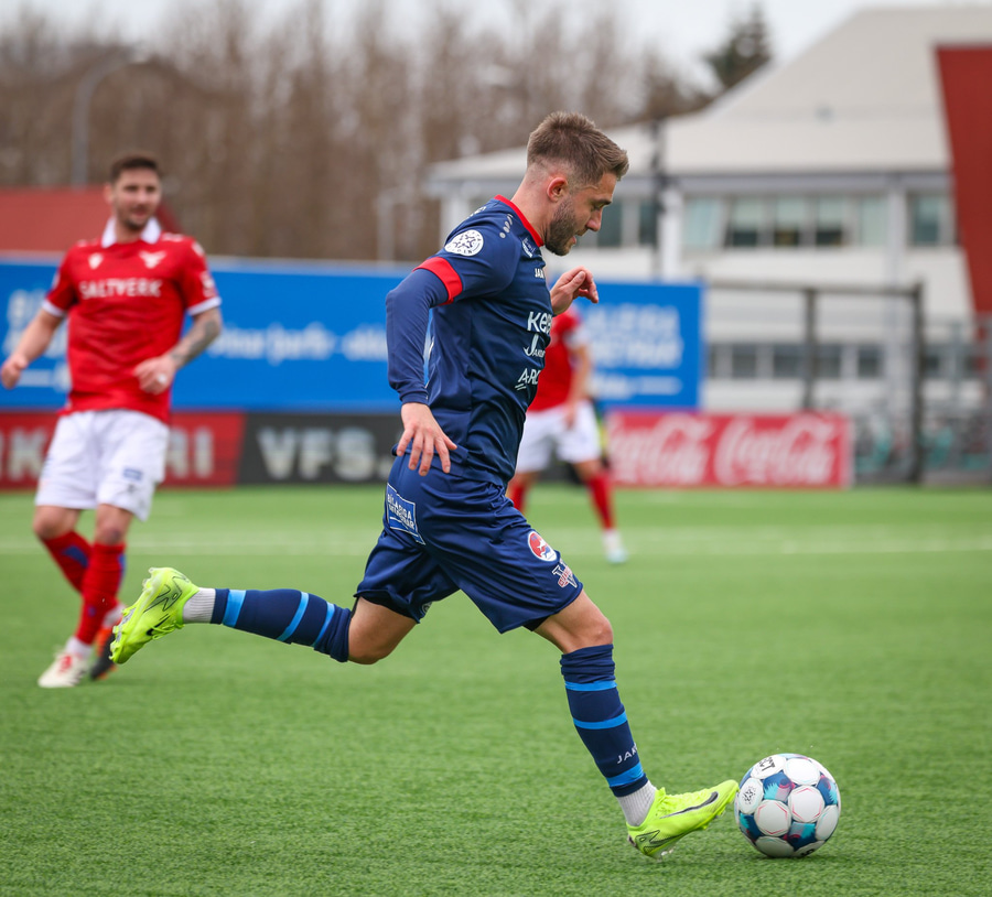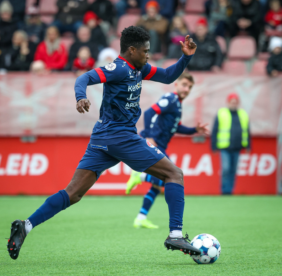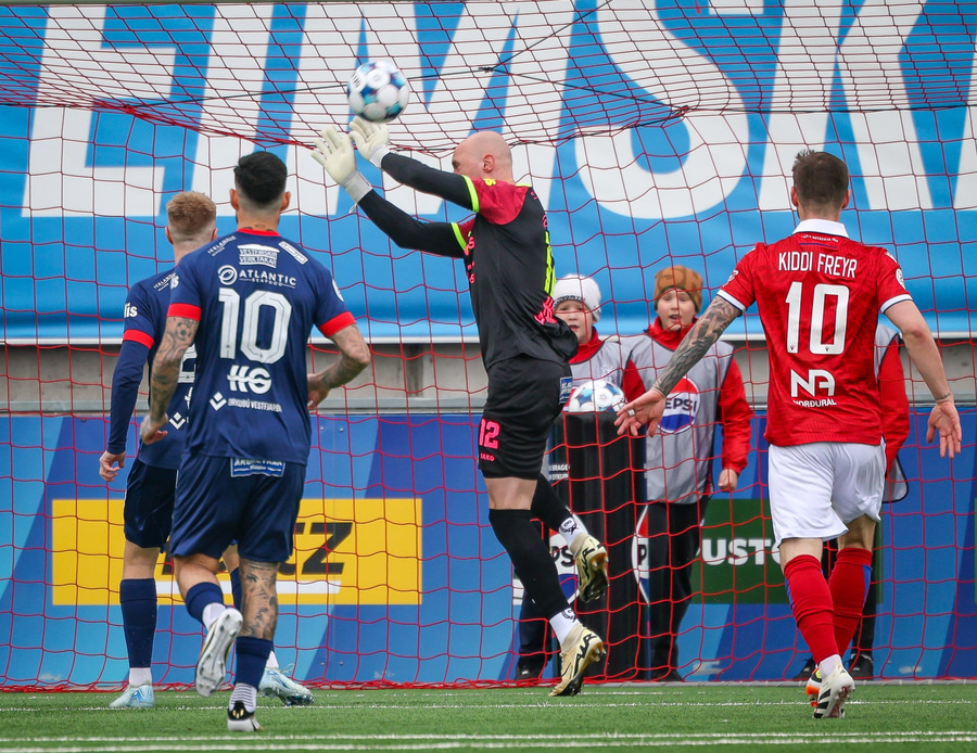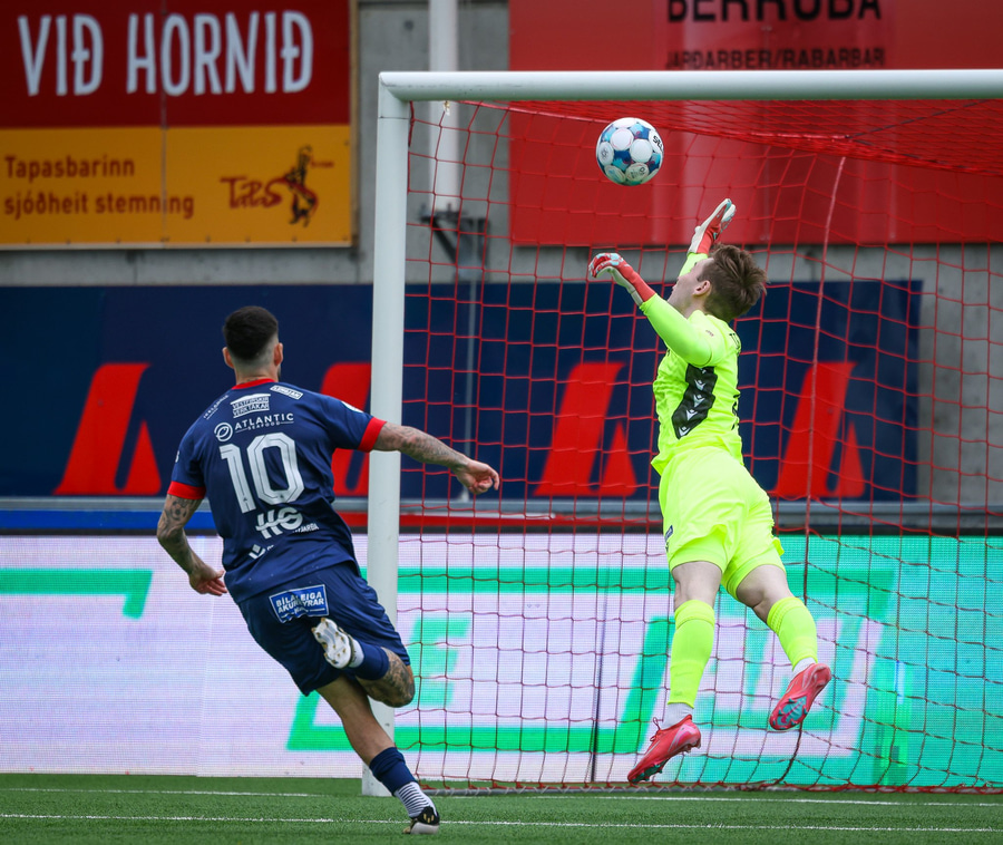 Anton Kralj kemst upp vinstri kantinn eftir flott samspil við Jeppe Pedersen. Anton á fína fyrirgjöf inn á Daða Berg sem nær skoti, sem berst aftur Anton. Hann setur boltann fyrir, þar sem Sergine Fall er mættur með seinni skipunum en skot hans frekar auðvelt fyrir Stefán Þór.
