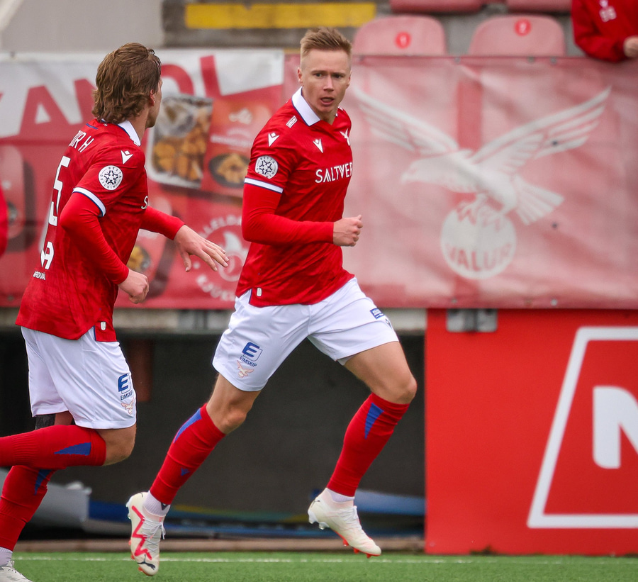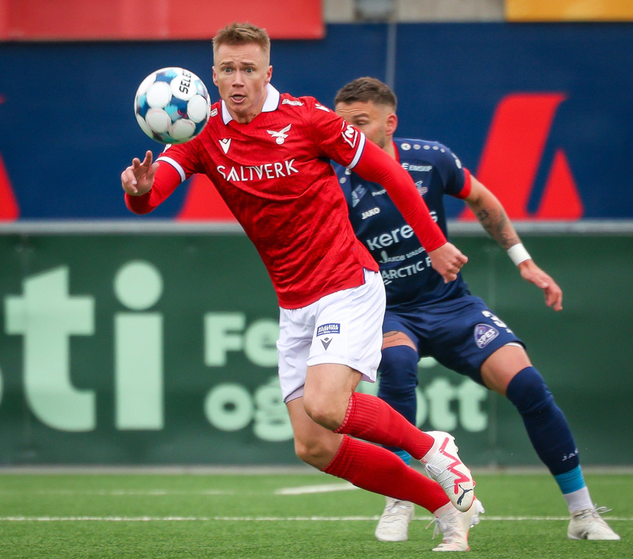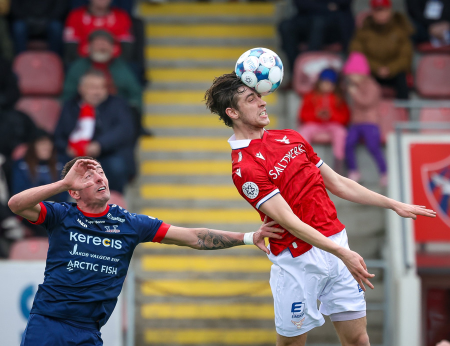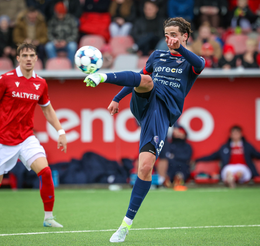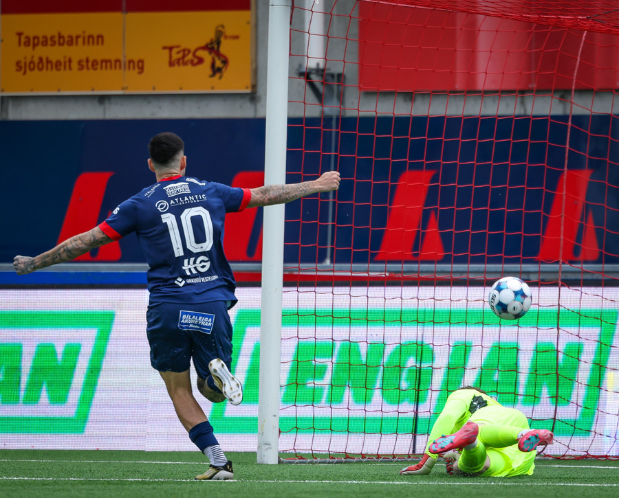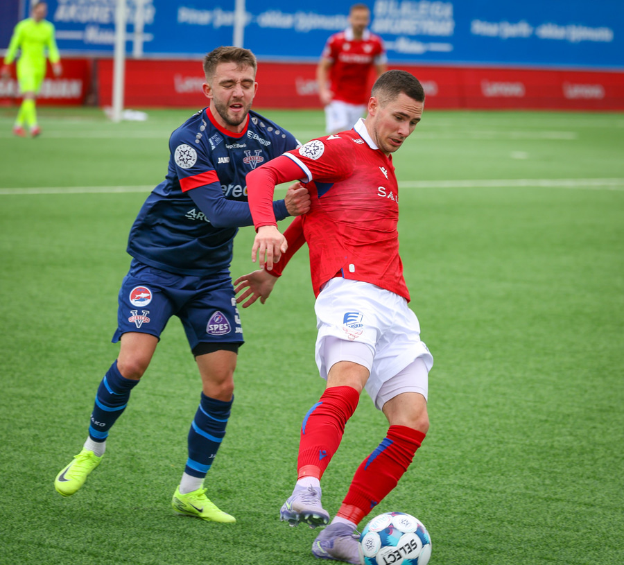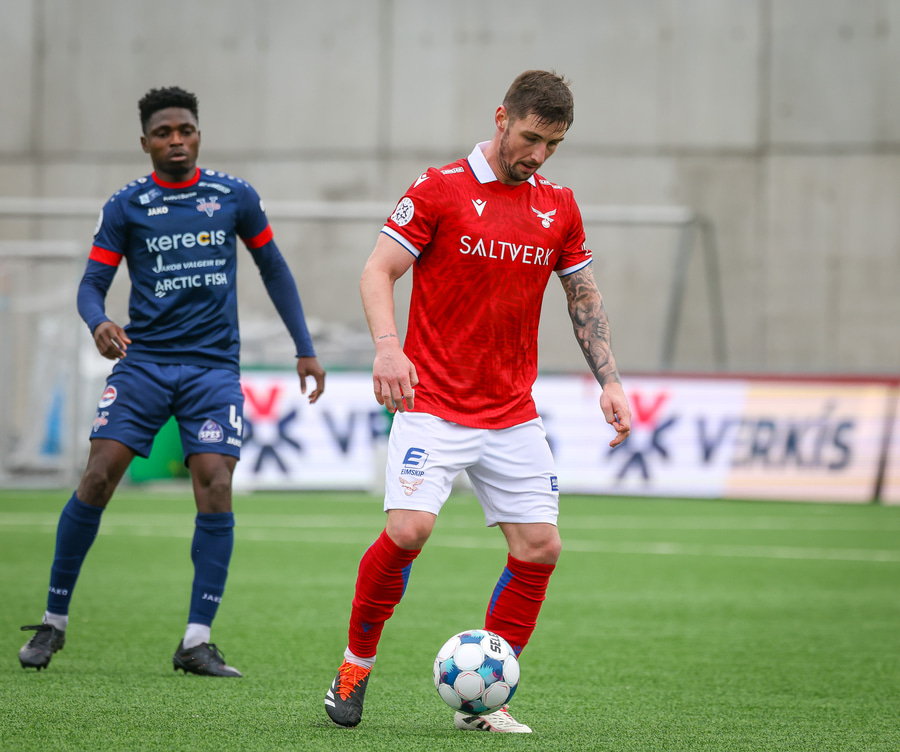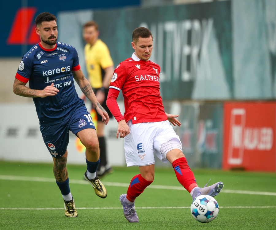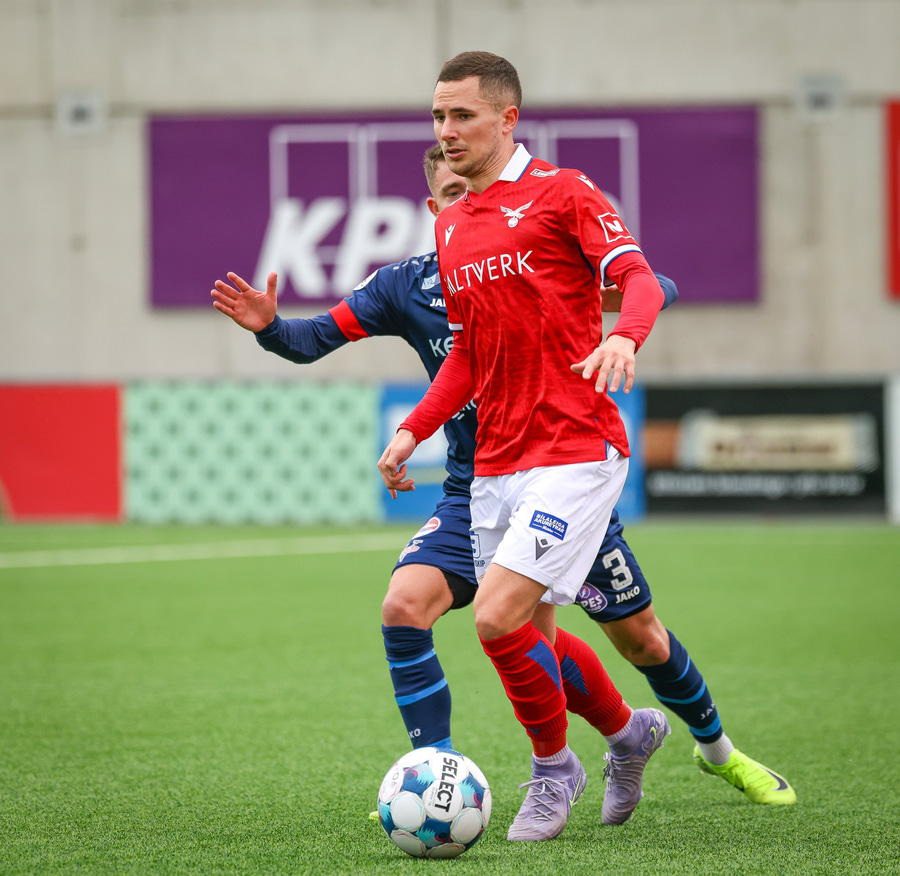 Anton Kralj kemst upp vinstri kantinn eftir flott samspil við Jeppe Pedersen. Anton á fína fyrirgjöf inn á Daða Berg sem nær skoti, sem berst aftur Anton. Hann setur boltann fyrir, þar sem Sergine Fall er mættur með seinni skipunum en skot hans frekar auðvelt fyrir Stefán Þór.