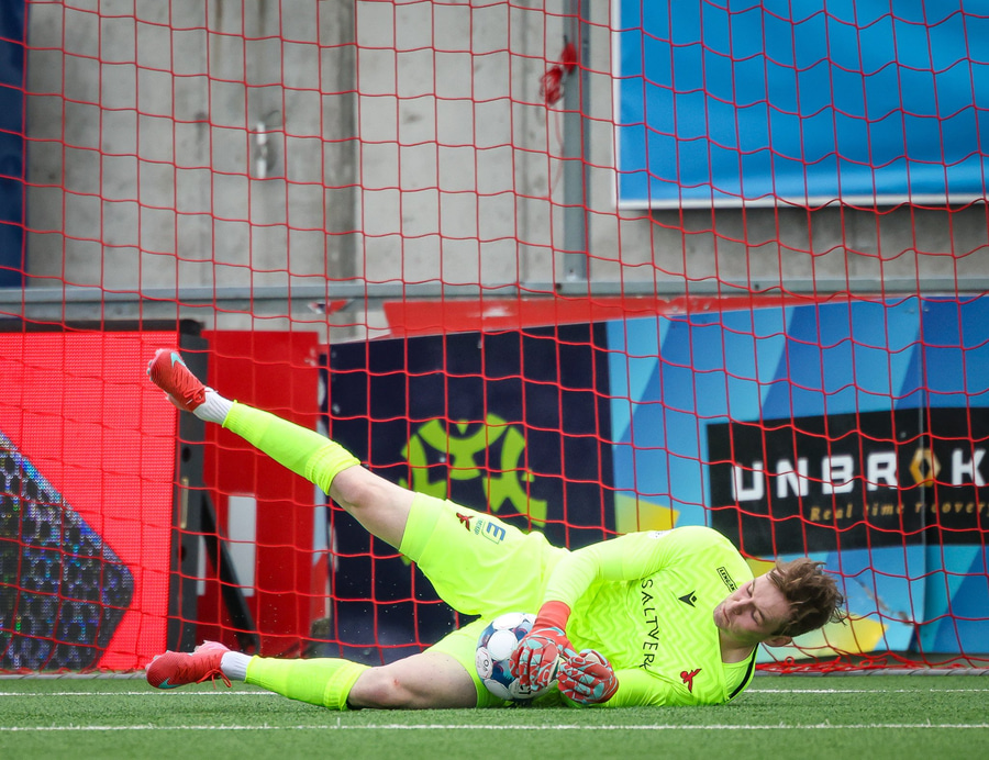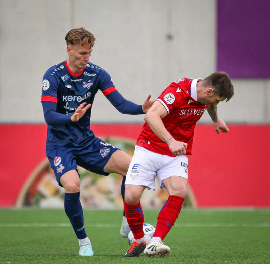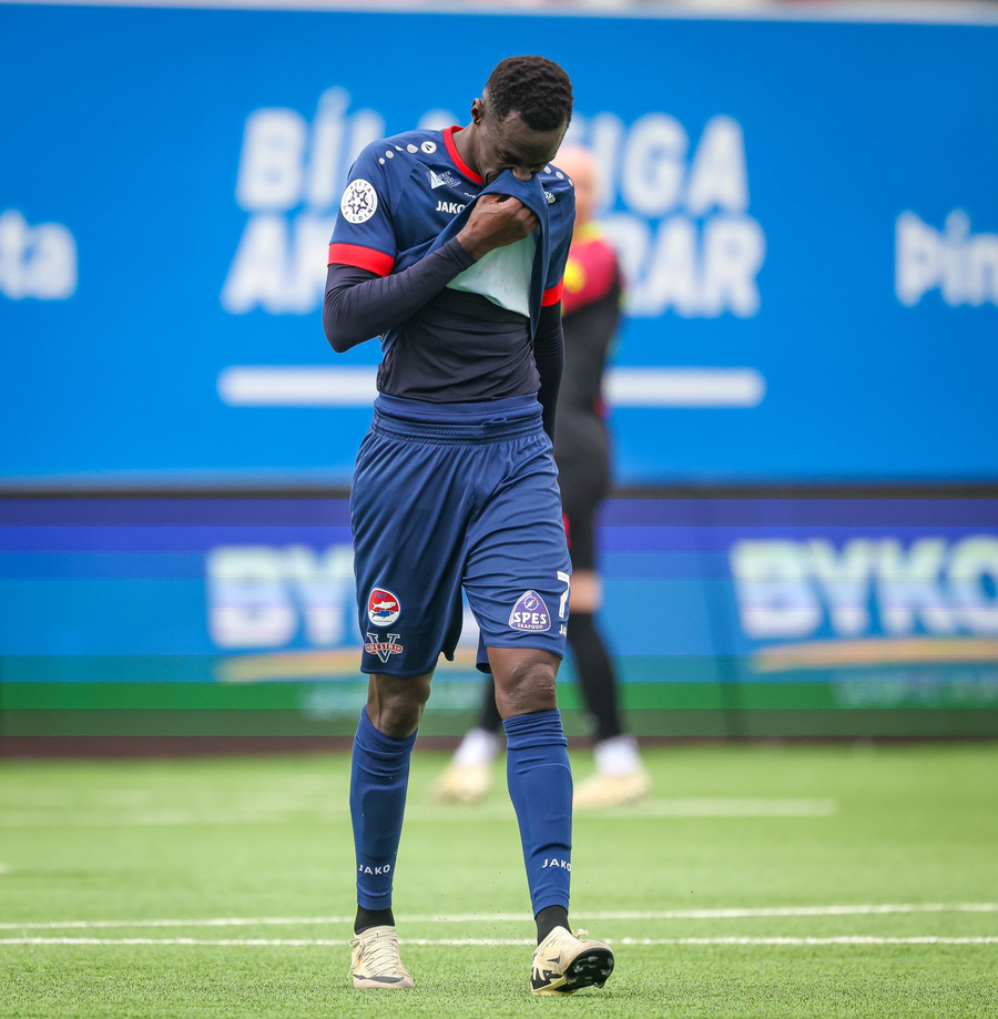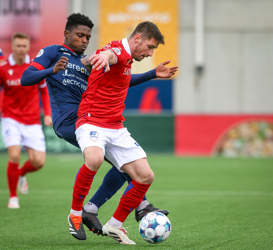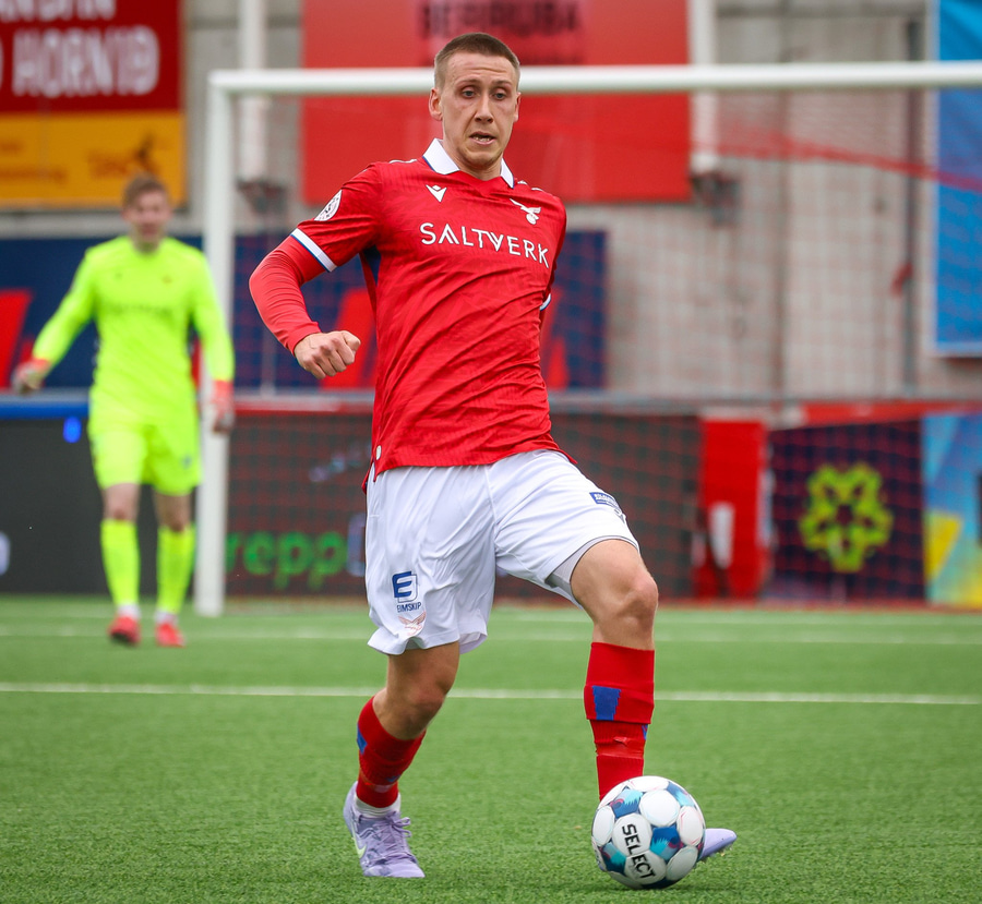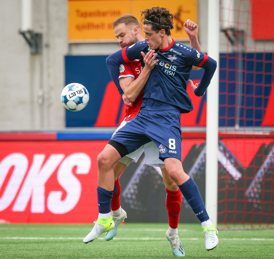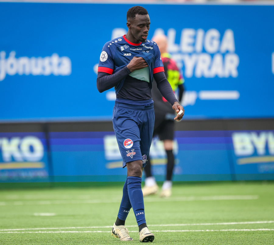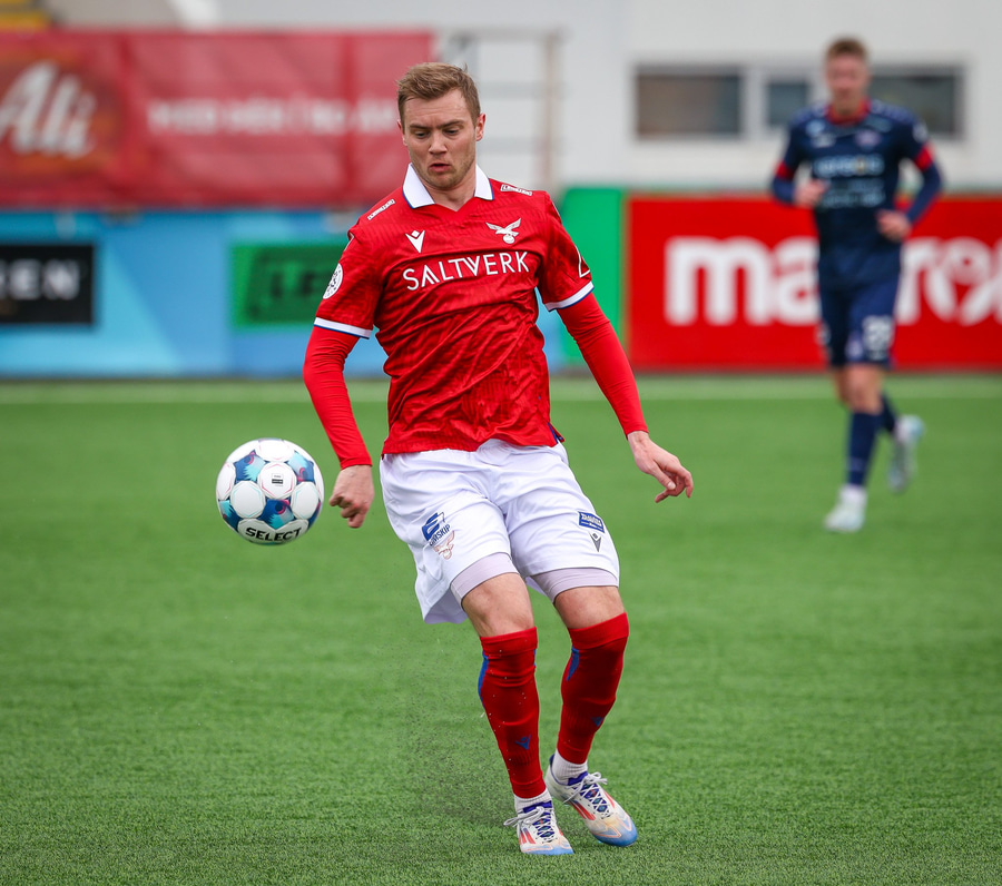 Anton Kralj kemst upp vinstri kantinn eftir flott samspil við Jeppe Pedersen. Anton á fína fyrirgjöf inn á Daða Berg sem nær skoti, sem berst aftur Anton. Hann setur boltann fyrir, þar sem Sergine Fall er mættur með seinni skipunum en skot hans frekar auðvelt fyrir Stefán Þór.