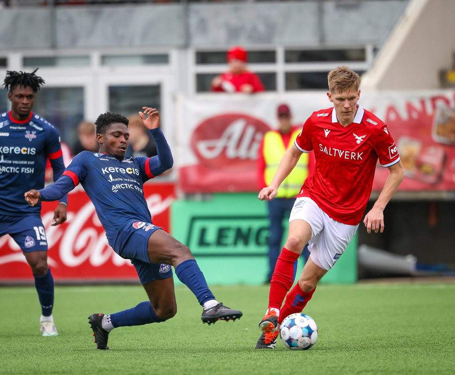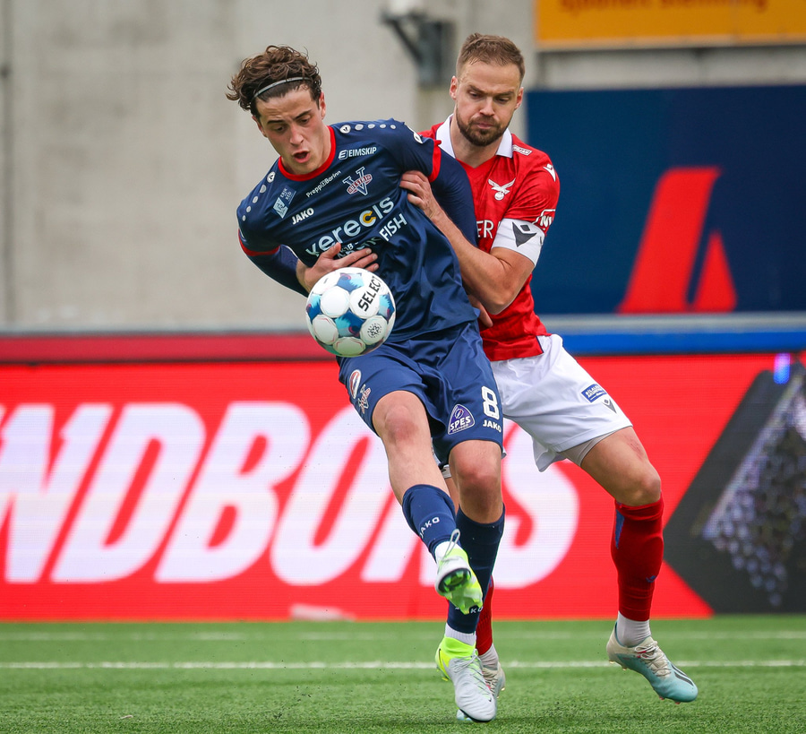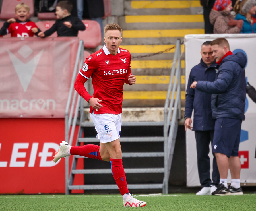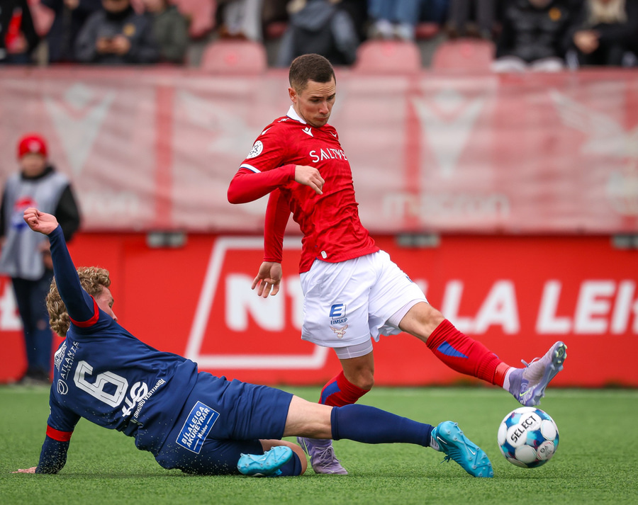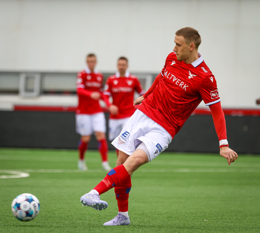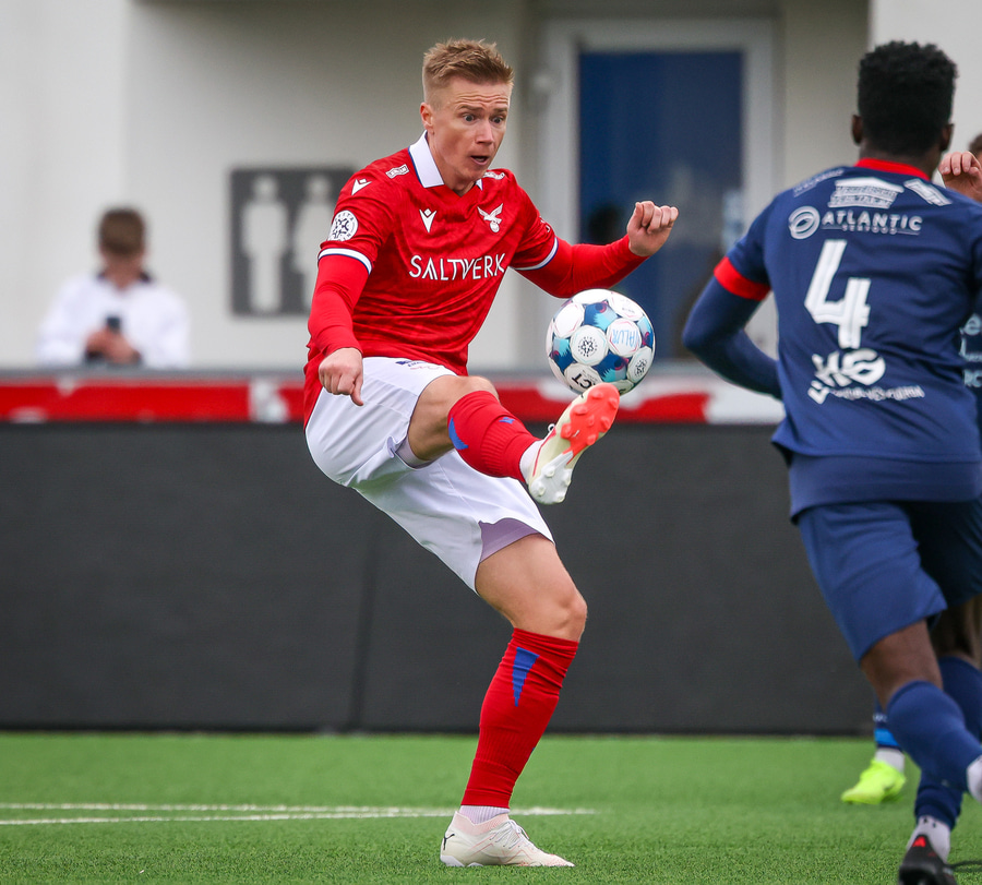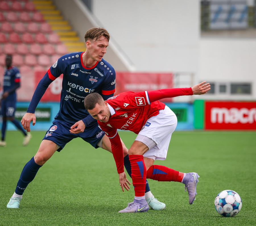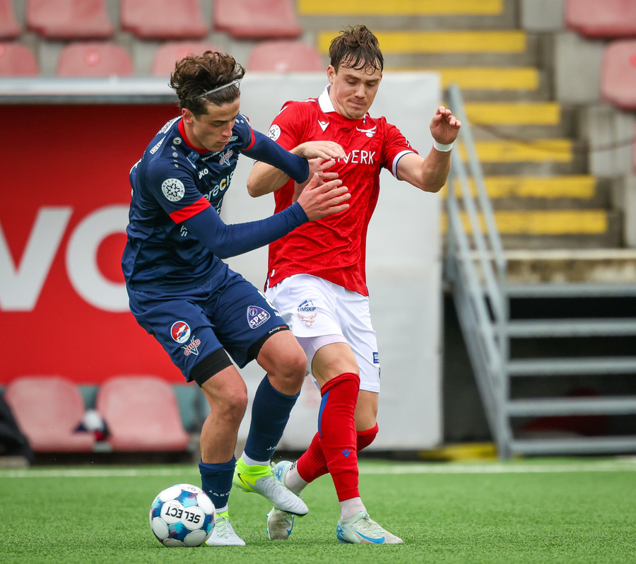 Anton Kralj kemst upp vinstri kantinn eftir flott samspil við Jeppe Pedersen. Anton á fína fyrirgjöf inn á Daða Berg sem nær skoti, sem berst aftur Anton. Hann setur boltann fyrir, þar sem Sergine Fall er mættur með seinni skipunum en skot hans frekar auðvelt fyrir Stefán Þór.