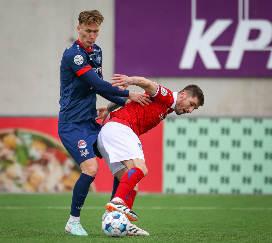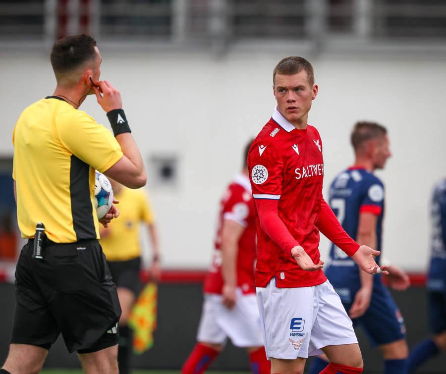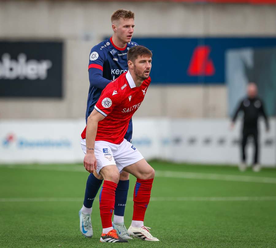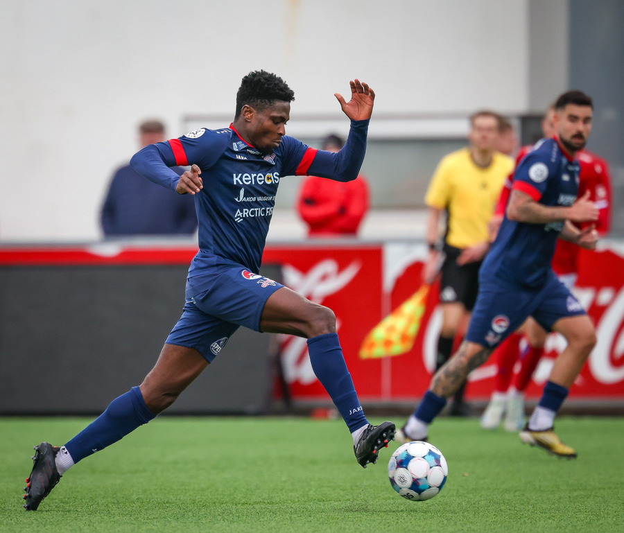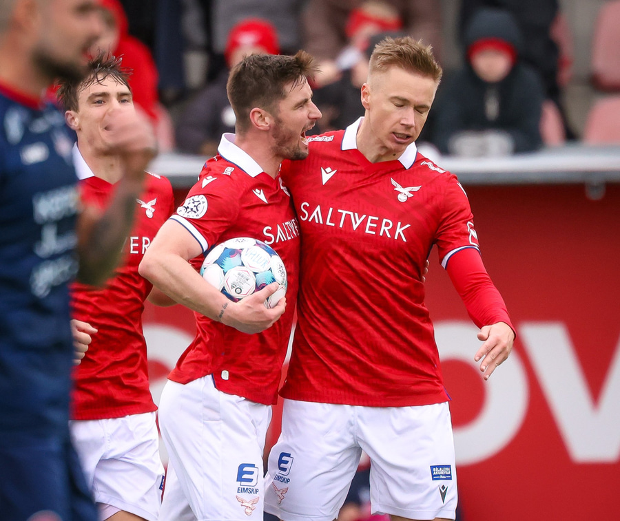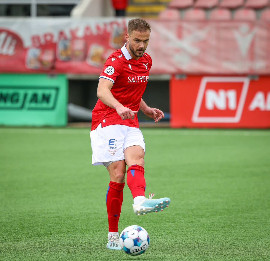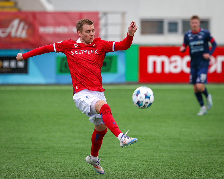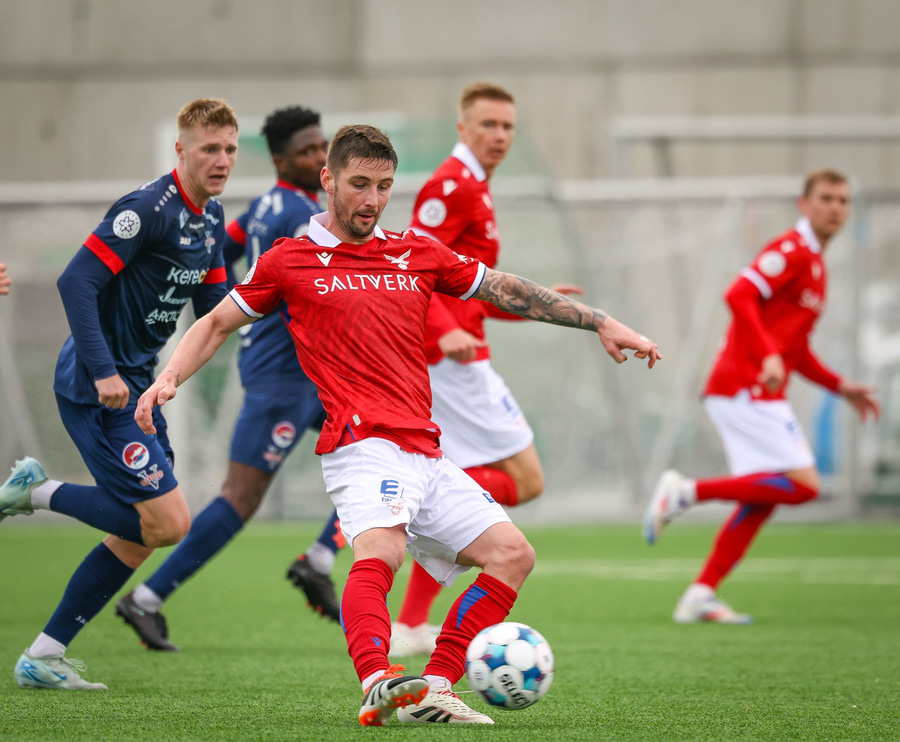 Anton Kralj kemst upp vinstri kantinn eftir flott samspil við Jeppe Pedersen. Anton á fína fyrirgjöf inn á Daða Berg sem nær skoti, sem berst aftur Anton. Hann setur boltann fyrir, þar sem Sergine Fall er mættur með seinni skipunum en skot hans frekar auðvelt fyrir Stefán Þór.