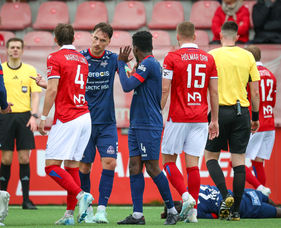 Daði Berg hrindir Markus Nakkim við hornfána Valsmanna, samt eitthvað ósáttur við Gunnar Odd og þarf að útskýra fyrir honum að dómurinn hafi ekki verið réttur.