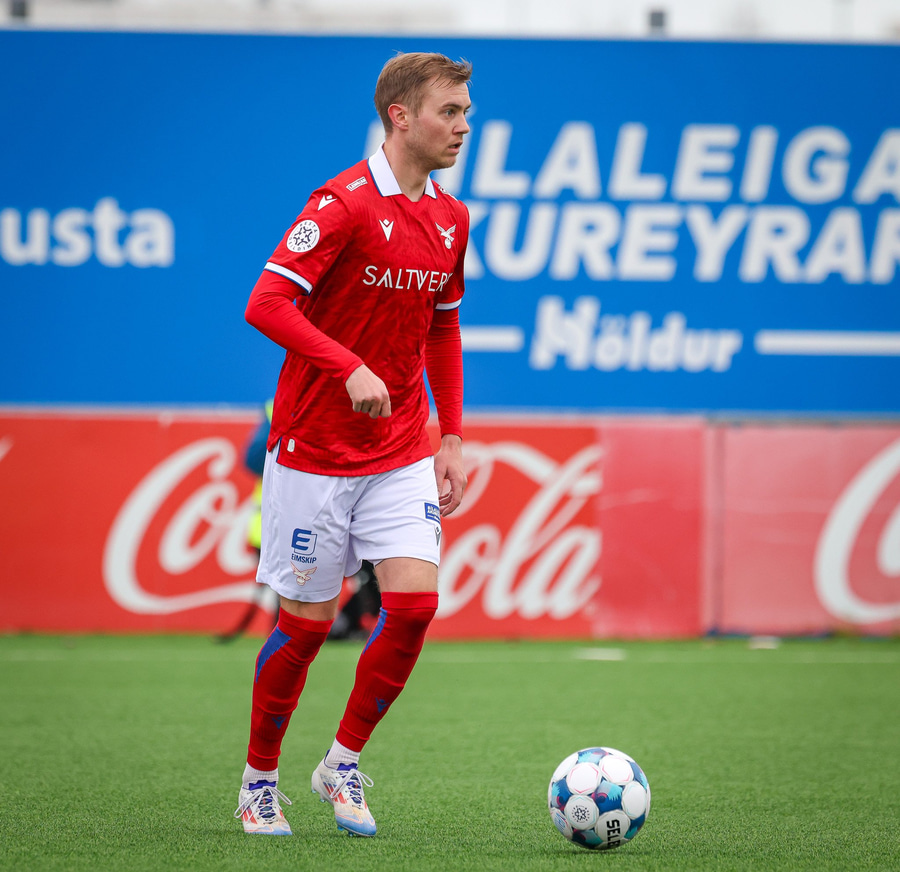 Jónatan Ingi kemst í flott færi, jú hægra megin í teignum, en skot hans fer af varnarmanni og í horn.