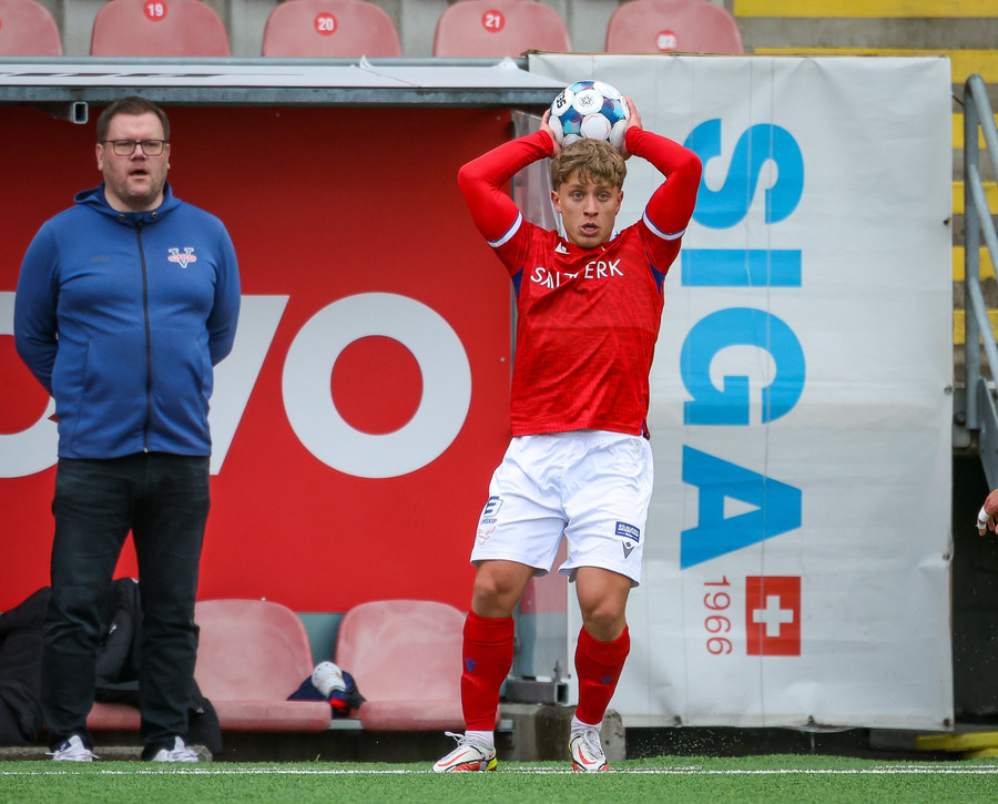 Jeppe Pedersen fær boltann rétt hjá miðjuhringnum og keyrir í átt að marki Vals. Hann nær skotinu en Stefán Þór í marki Vals á ekki í vandræðum með þetta skot og grípur það.
