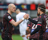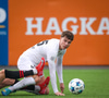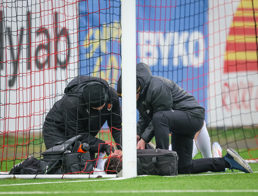 Arnór Ingi liggur eftir í eigin teig eftir þessa hornspyrnu og kveinkar sér. Við fyrstu sýn er eins og hann hafi mögulega fengið spark í höfuðið.